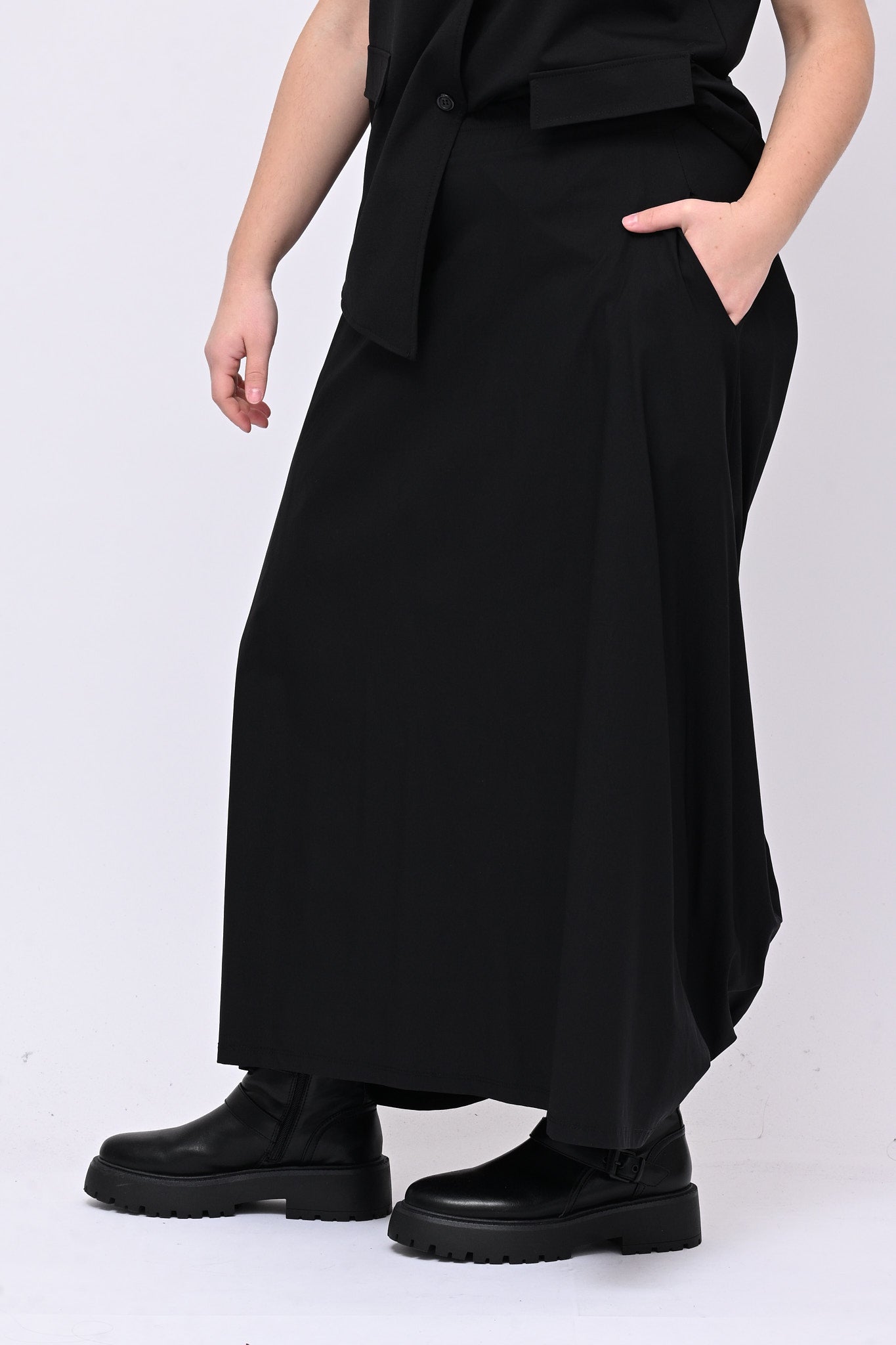 Gonna in bengalina elasticizzata, elastico in vita e tasche laterali. Il dettaglio distintivo è il grande nodo posteriore che crea un effetto elegante e femminile, trasformando questa gonna in un capo versatile perfetto per occasioni casual e più raffinate.