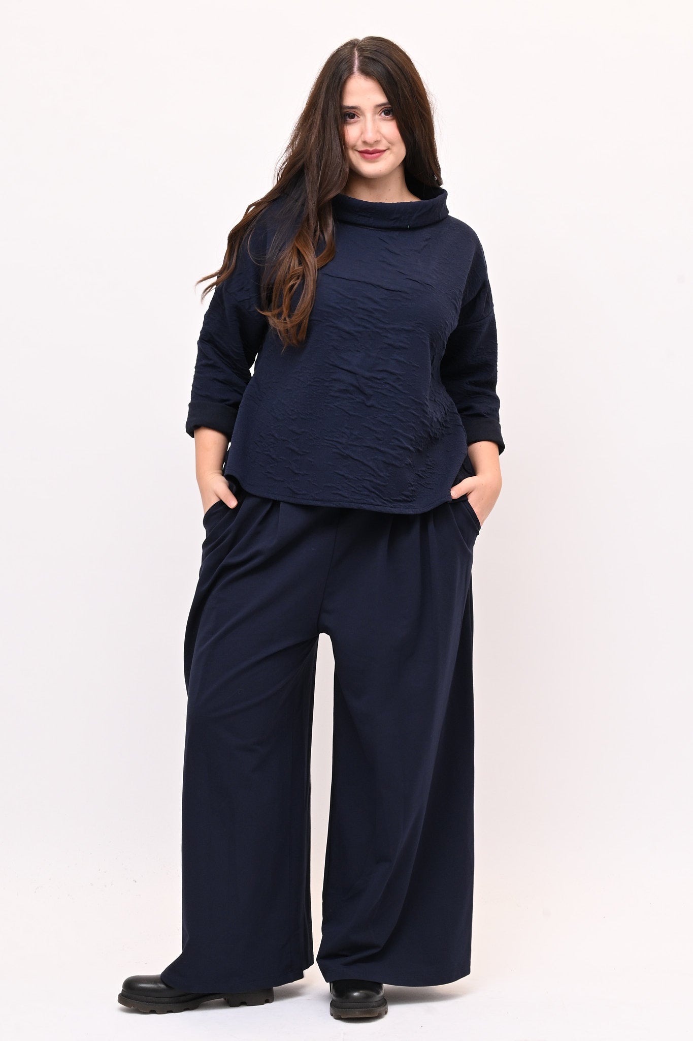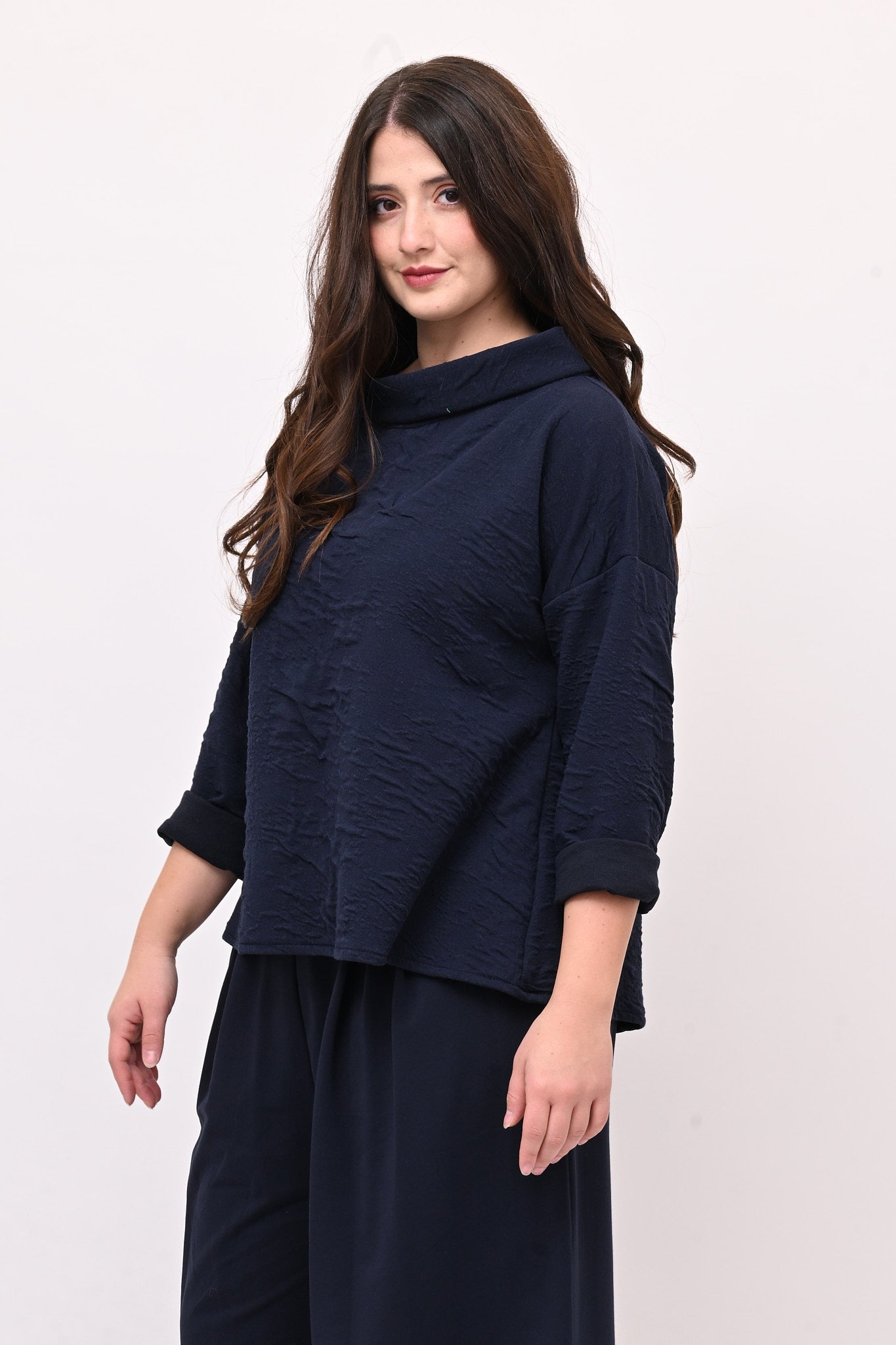 Maglia in tessuto goffrato, con colletto risvoltato ad anello e maniche lunghe. La parte posteriore è leggermente più lunga per una vestibilità comoda e moderna, perfetta per uno stile easy chic, dal design ricercato.