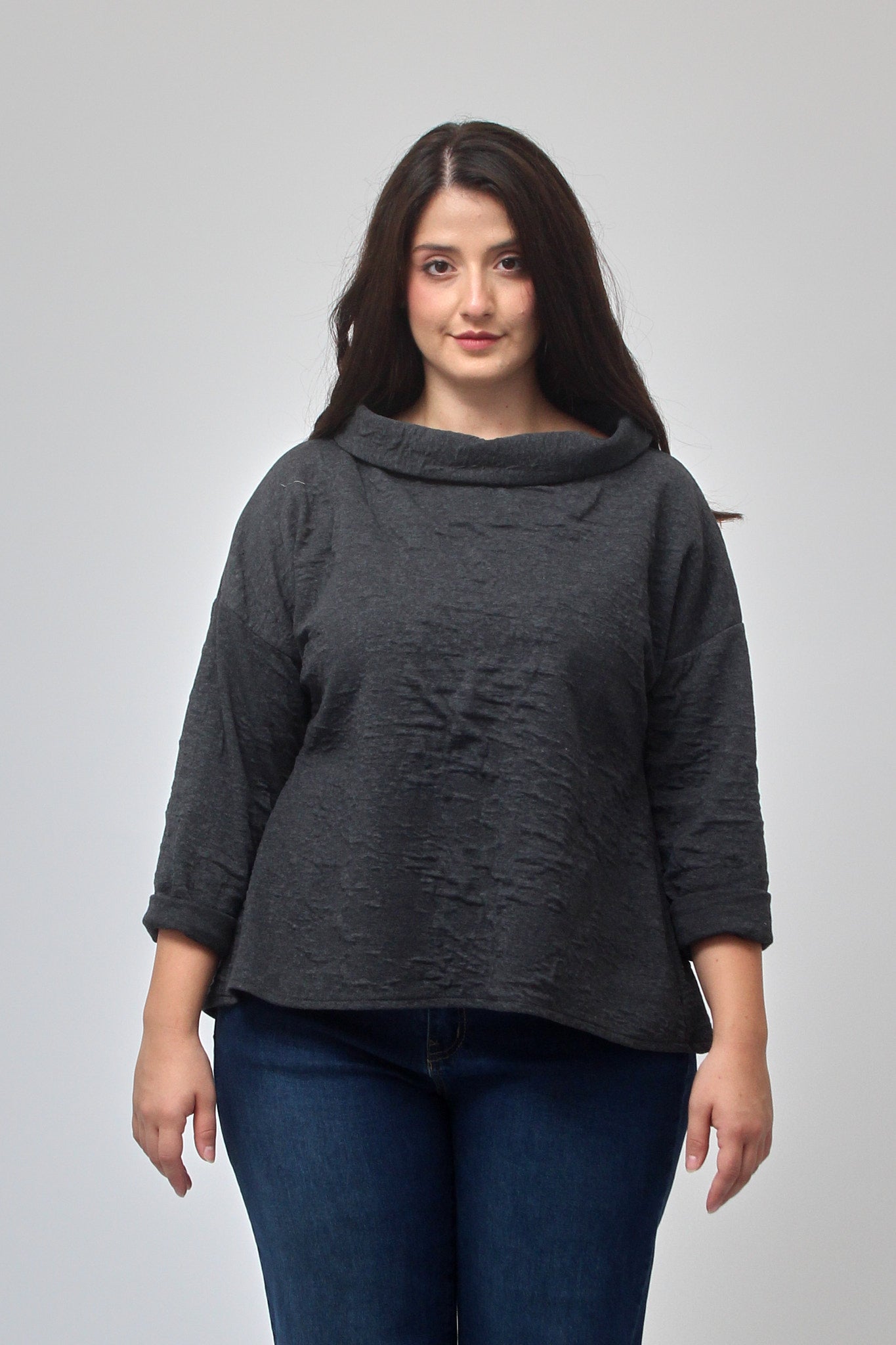 Maglia in tessuto goffrato, con colletto risvoltato ad anello e maniche lunghe. La parte posteriore è leggermente più lunga per una vestibilità comoda e moderna, perfetta per uno stile easy chic, dal design ricercato.