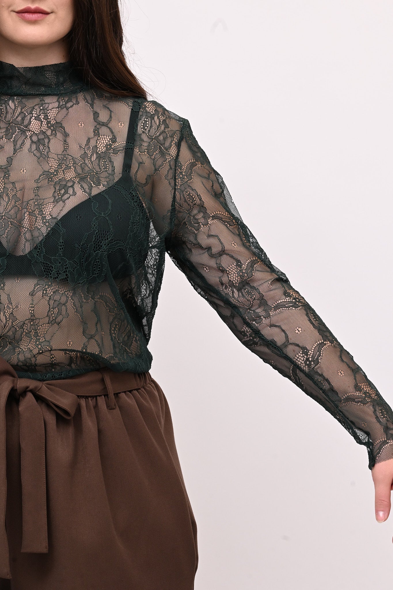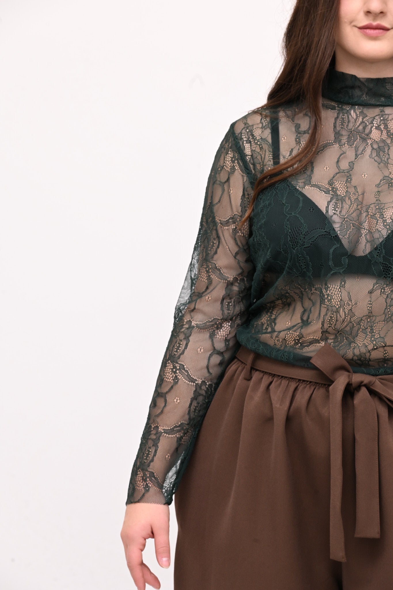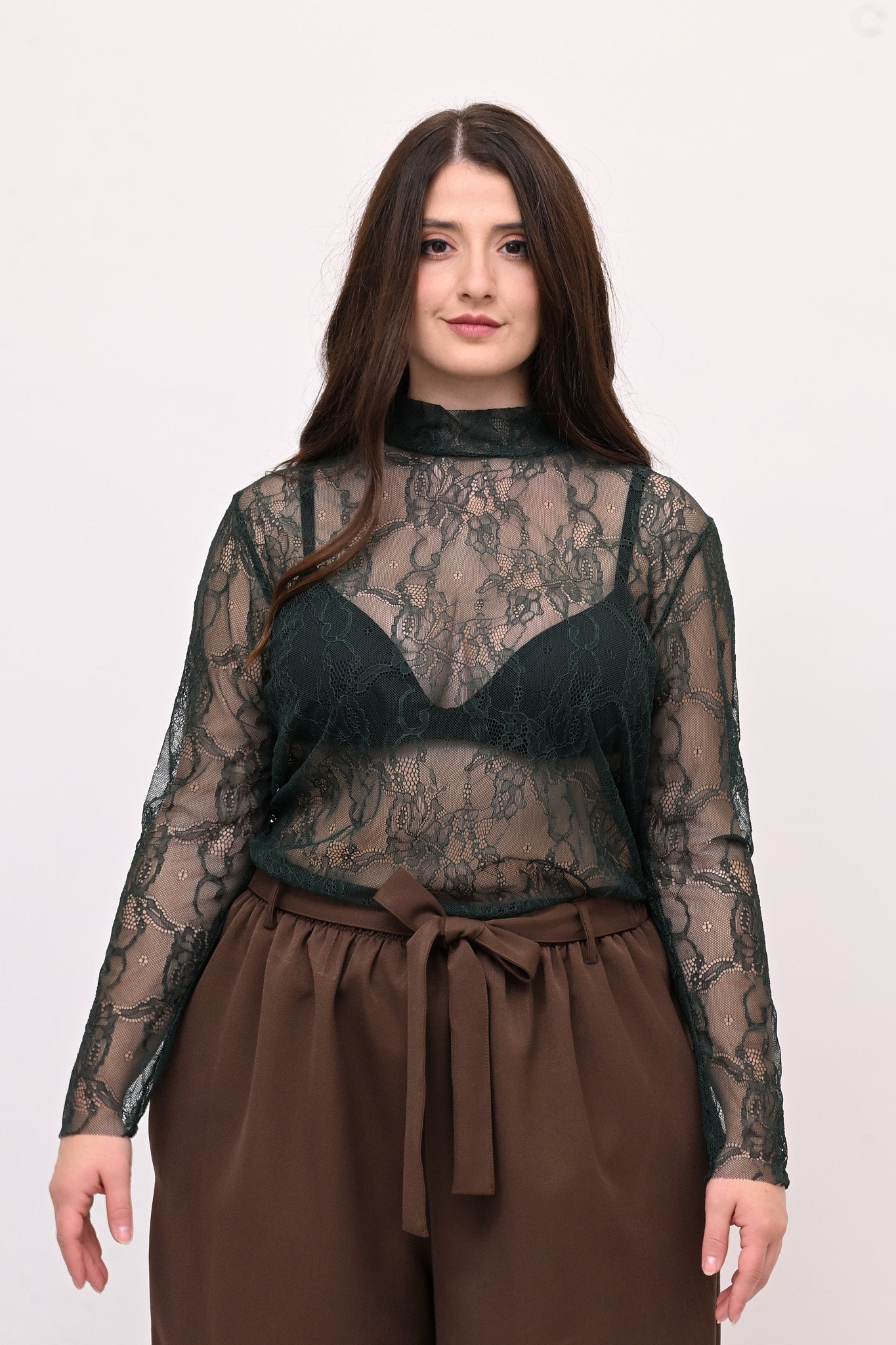 Lupetto in pizzo elasticizzato, trasparente, manica lunga. Il bottone sul retro aggiunge un tocco di eleganza discreta, mentre il tessuto elasticizzato garantisce comfort e libertà di movimento. Ideale da abbinare a diversi look, è una base versatile per outfit femminili e raffinati.