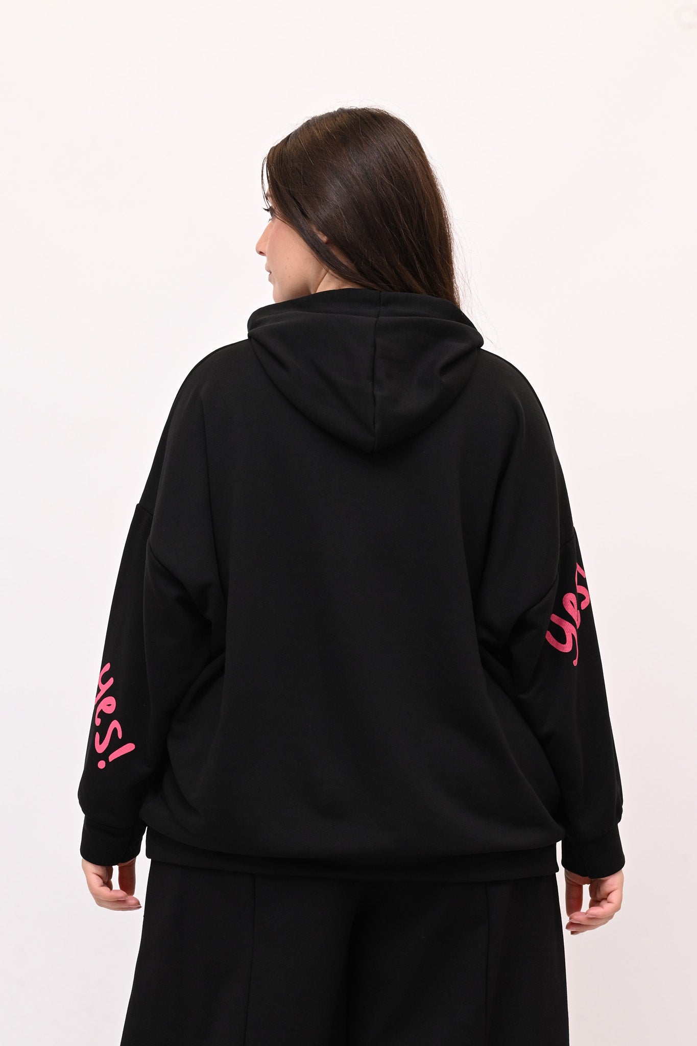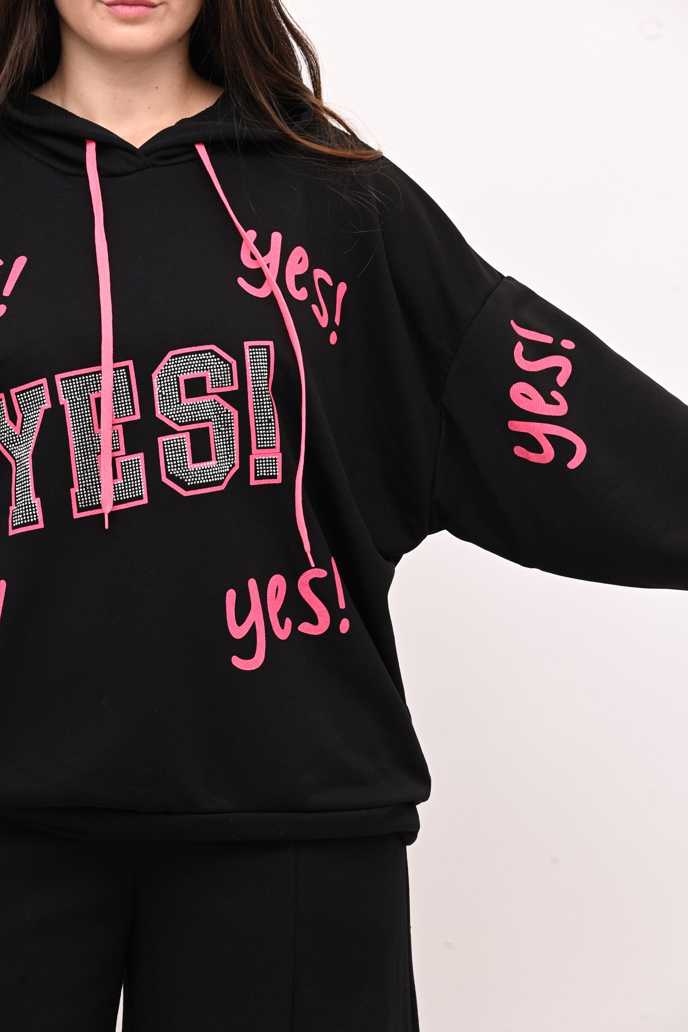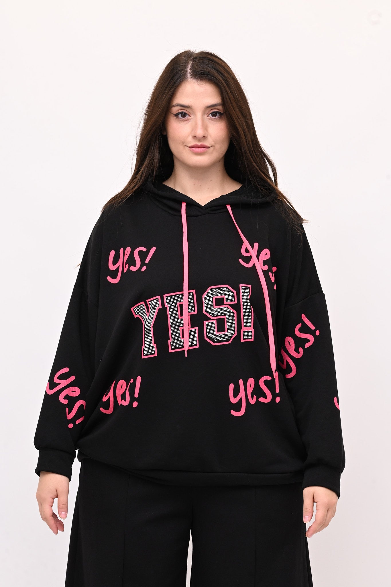 Felpa con cappuccio e maniche lunghe, caratterizzata dalla scritta “YES” in strass che dona un tocco moderno e luminoso. Comoda e versatile, è perfetta per look casual chic e stilosi.