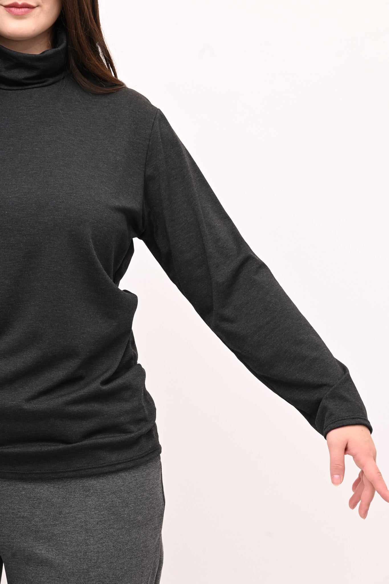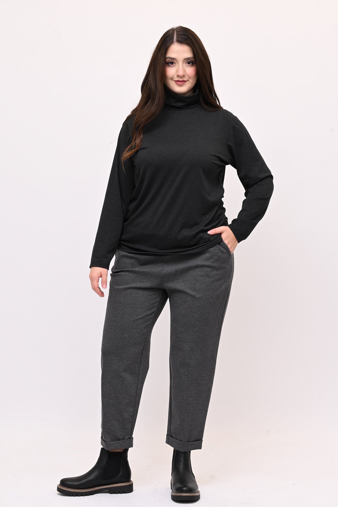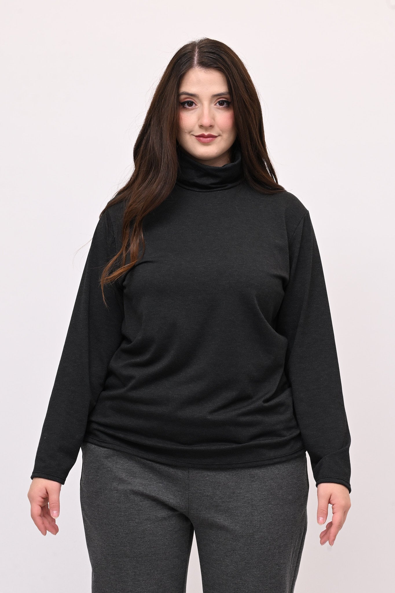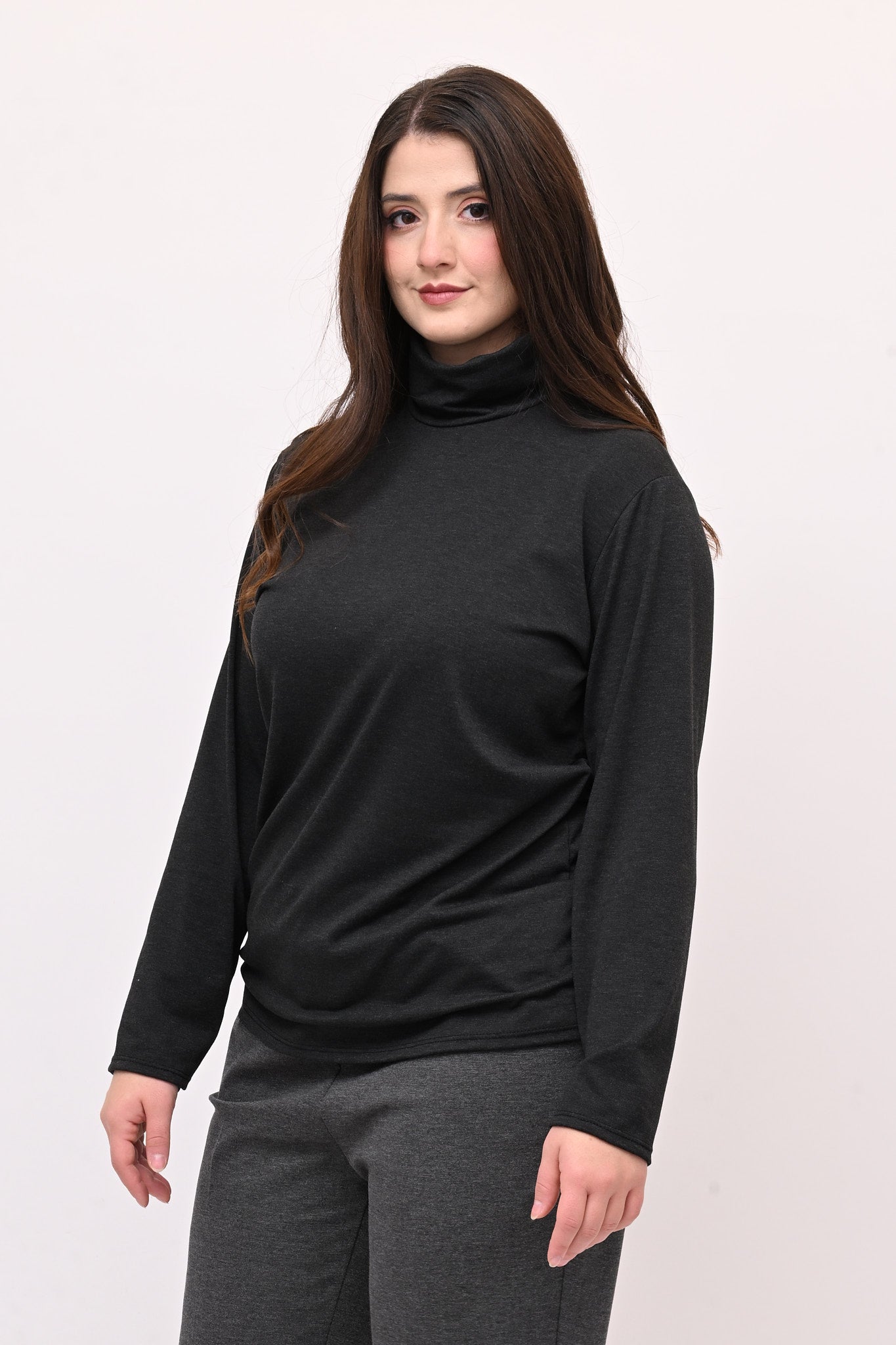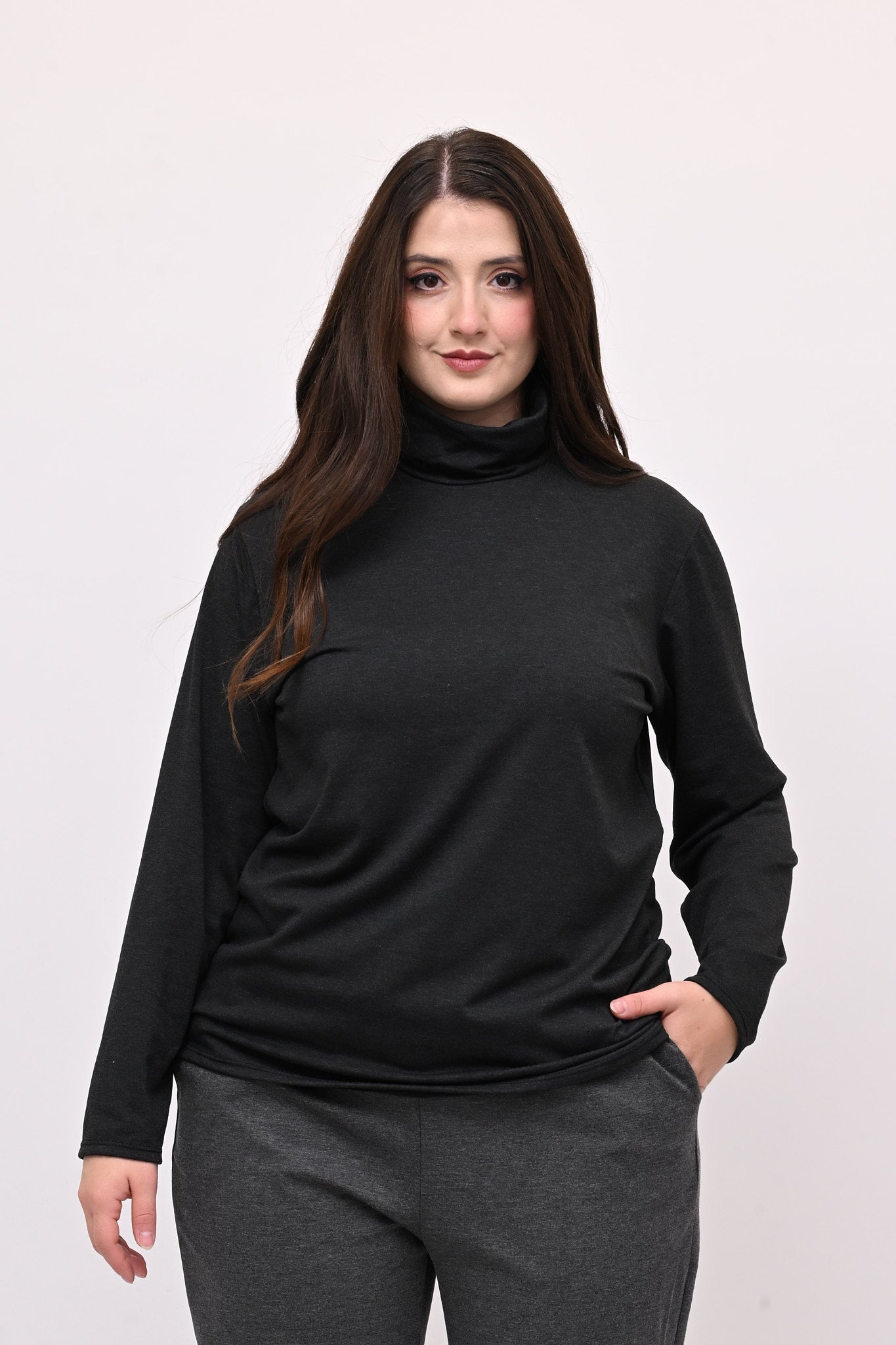 Lupetto in maglina di viscosa elasticizzata e felpata, manica lunga. Ideale come base per ogni outfit, è perfetto come sottotutto o indossato da solo. Un must have per chi cerca stile, praticità e comfort senza rinunciare a un look versatile.