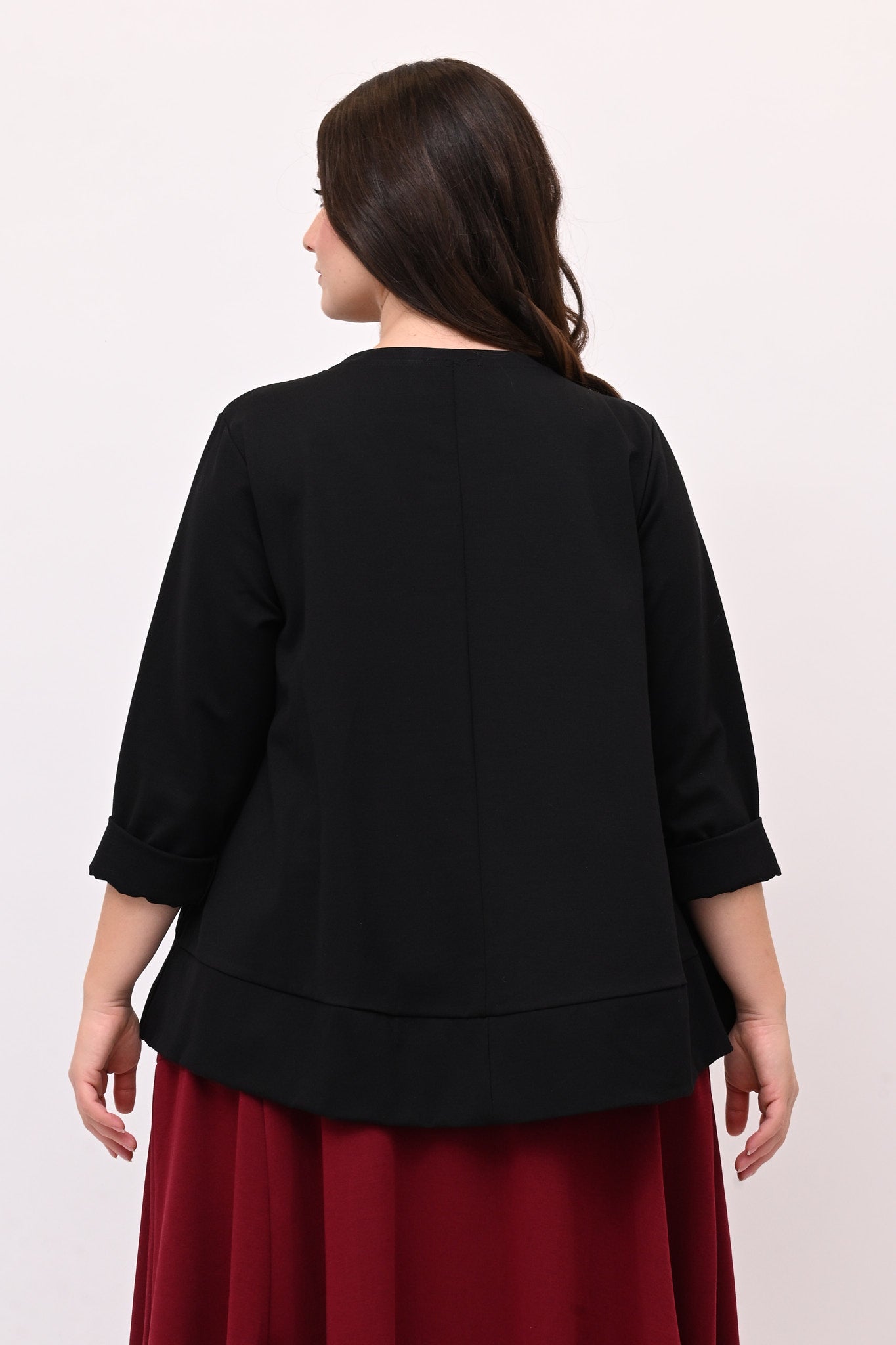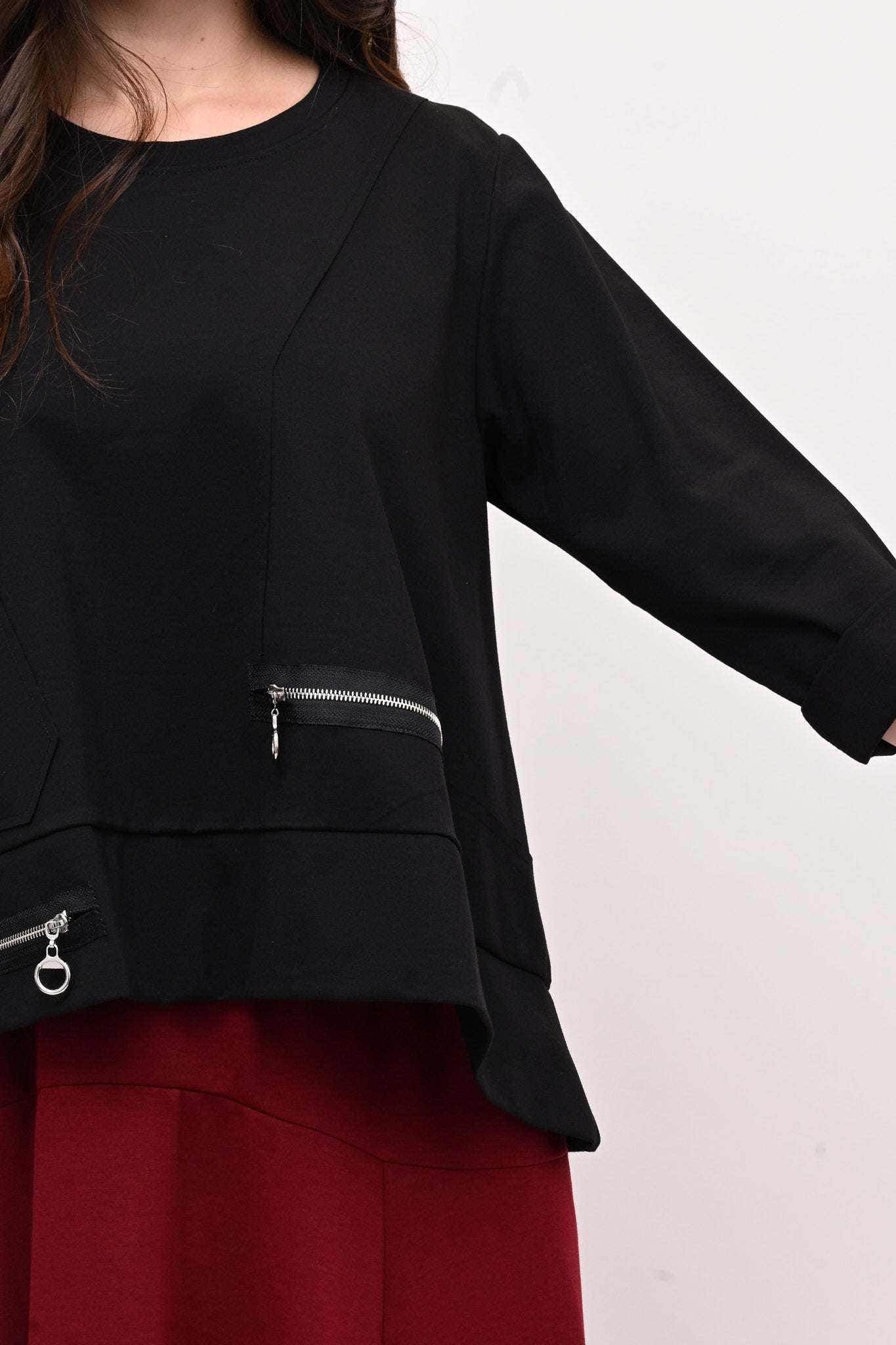 Maglia in punto Milano, girocollo, maniche lunghe, modello ad A, con zip frontali e impunture. Dal design sporty chic, unisce stile e praticità ed è versatile e confortevole per ogni occasione.