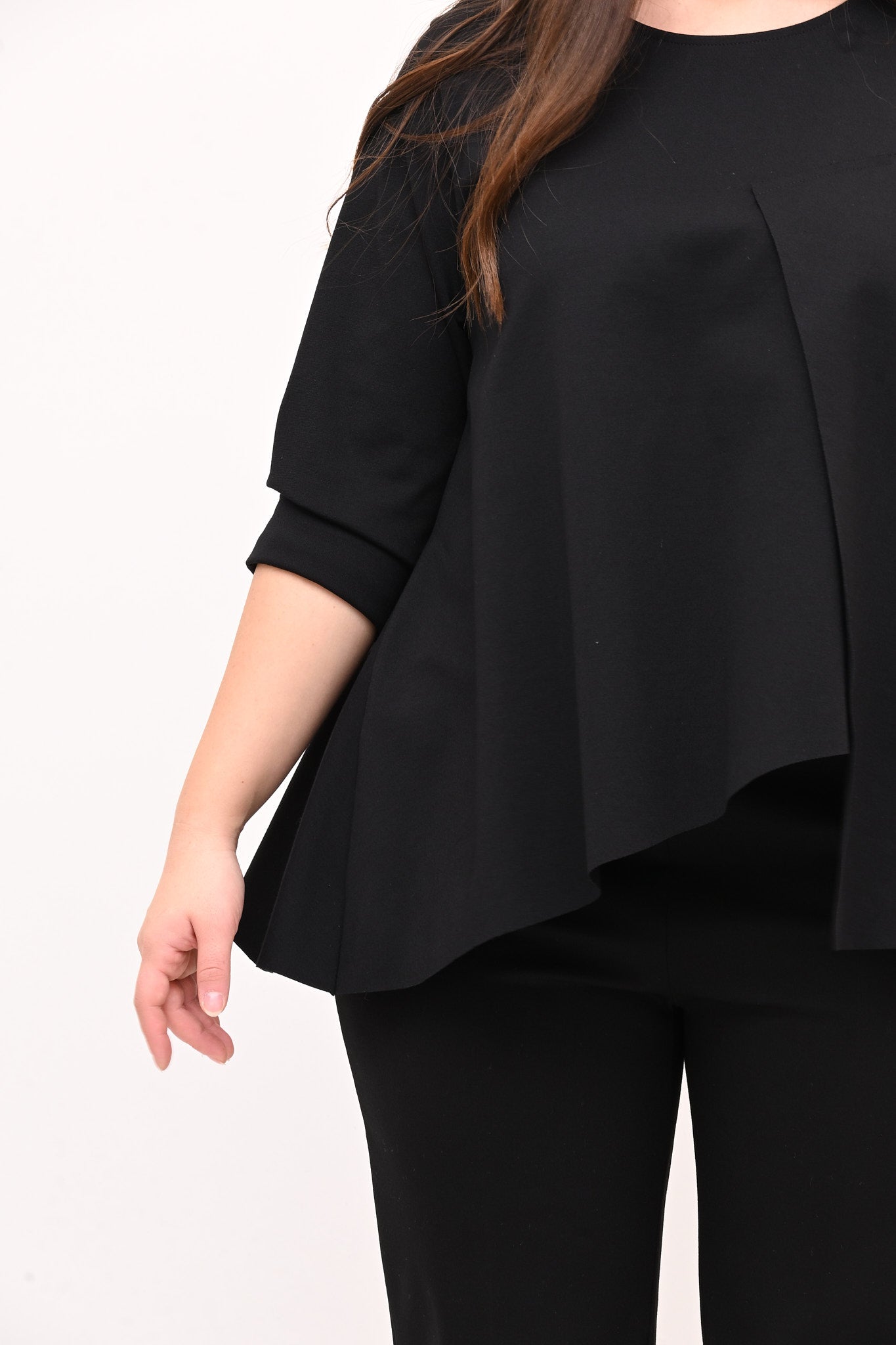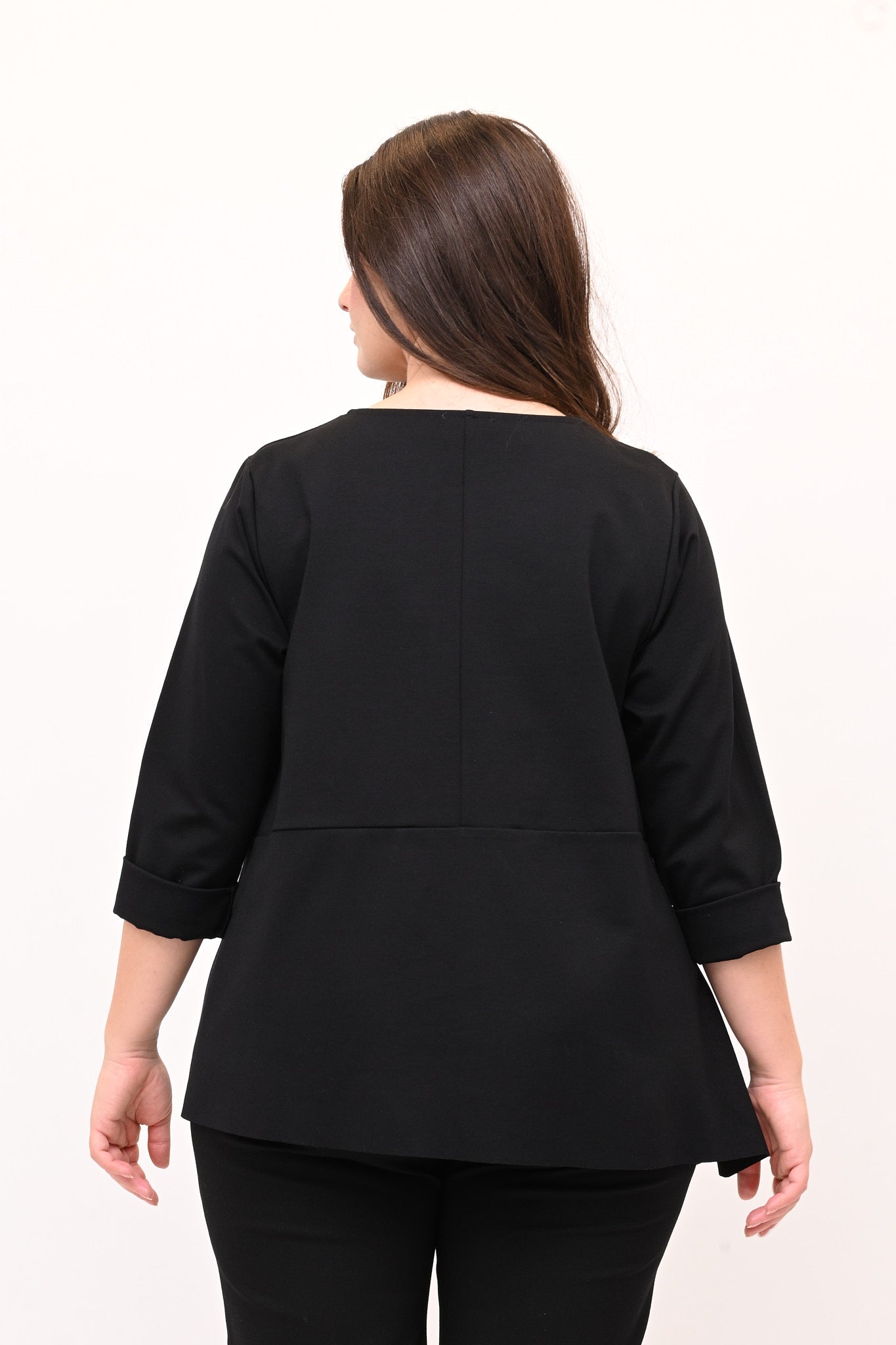 Maglia in punto Milano, girocollo, maniche lunghe, modello ad A. Il doppio pannello sovrapposto su un lato e l'asimmetria sul fondo aggiungono movimento e carattere. Un capo essenziale dal design contemporaneo e ricercato.