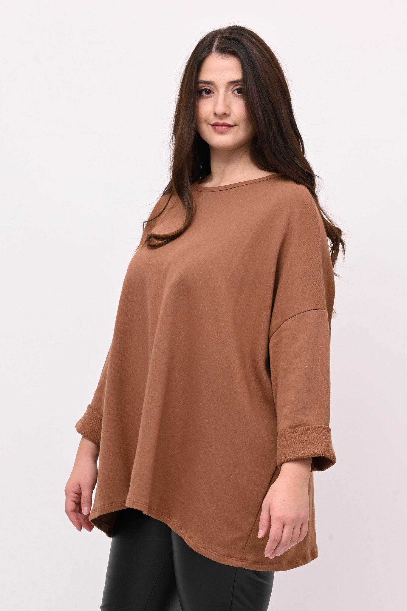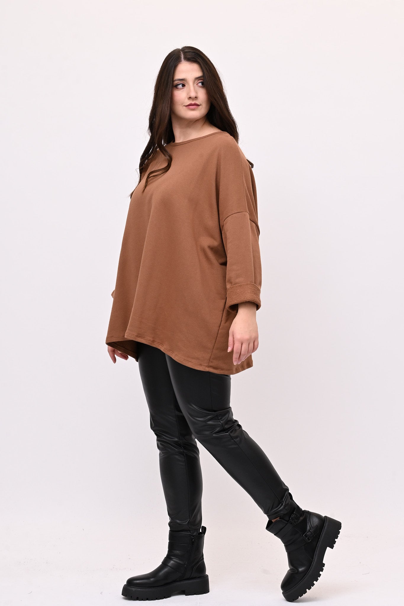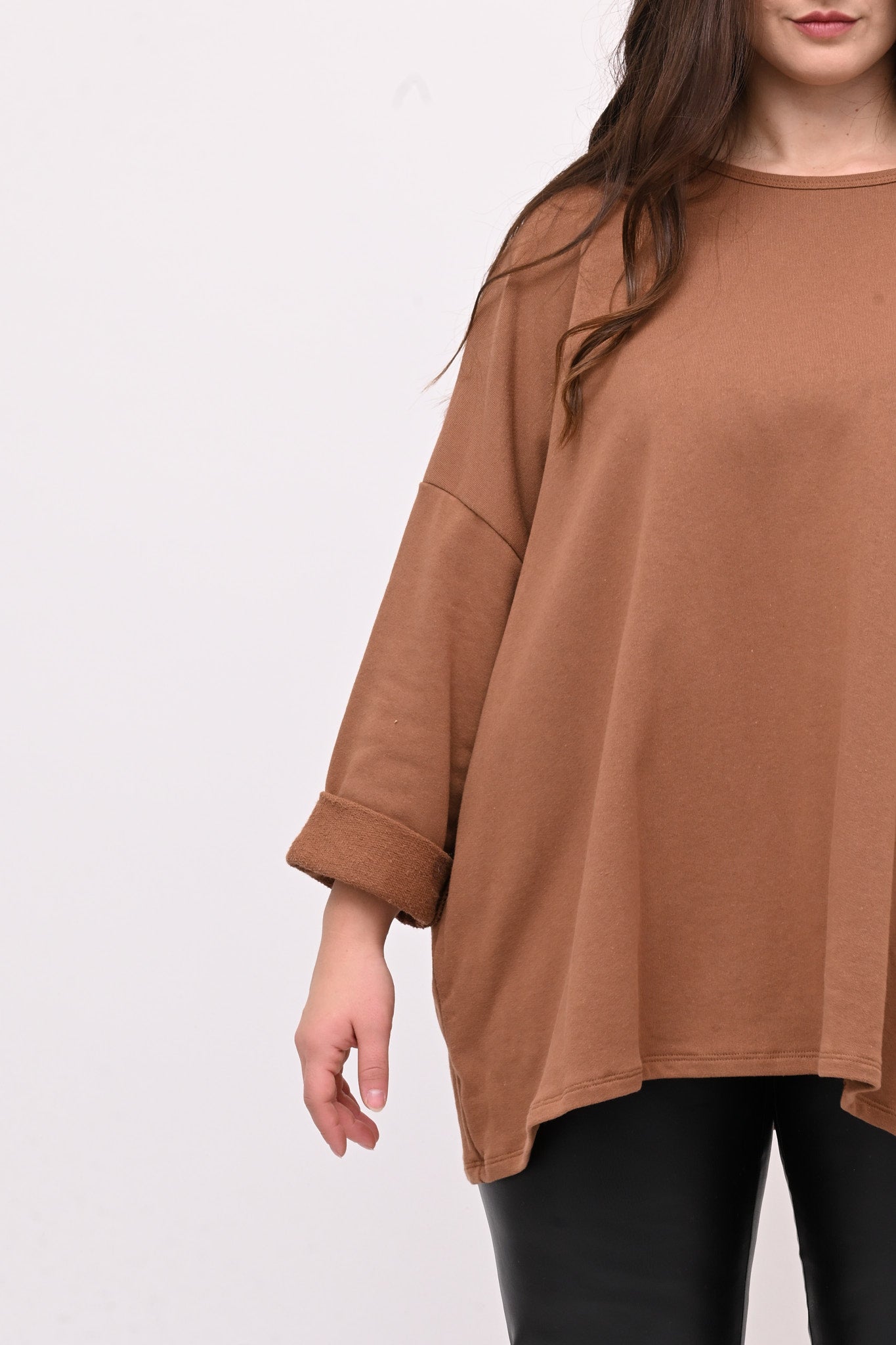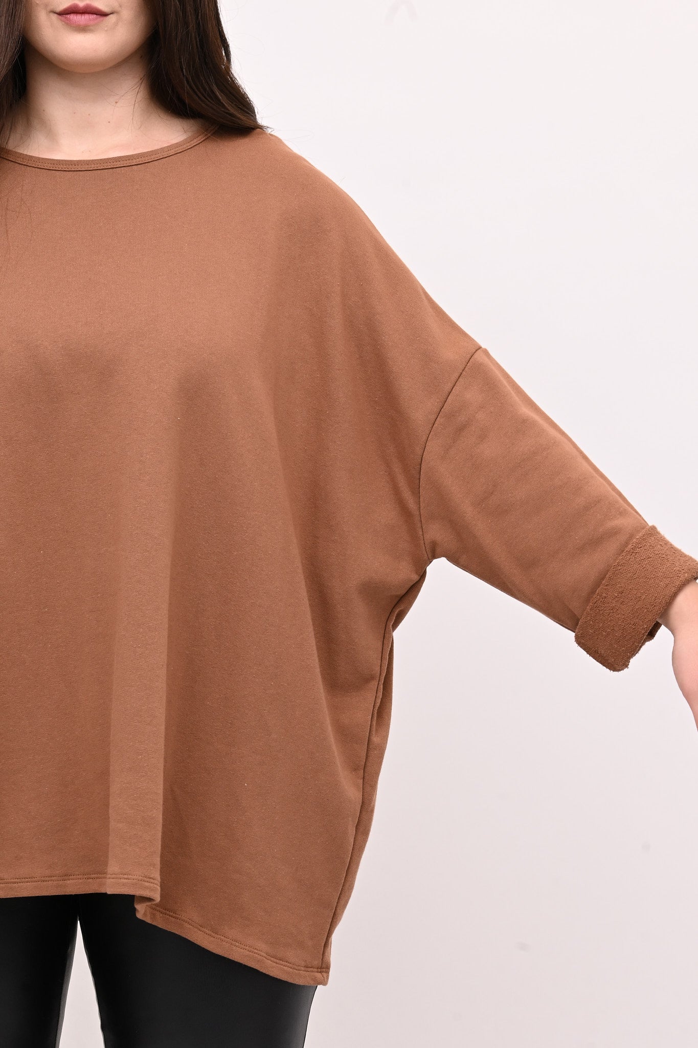 Maxi felpa 100% cotone, modello a scatoletta, con girocollo e maniche lunghe. Comoda e moderna, dalla linea pulita ed essenziale, è perfetta per look sportivi e casual.