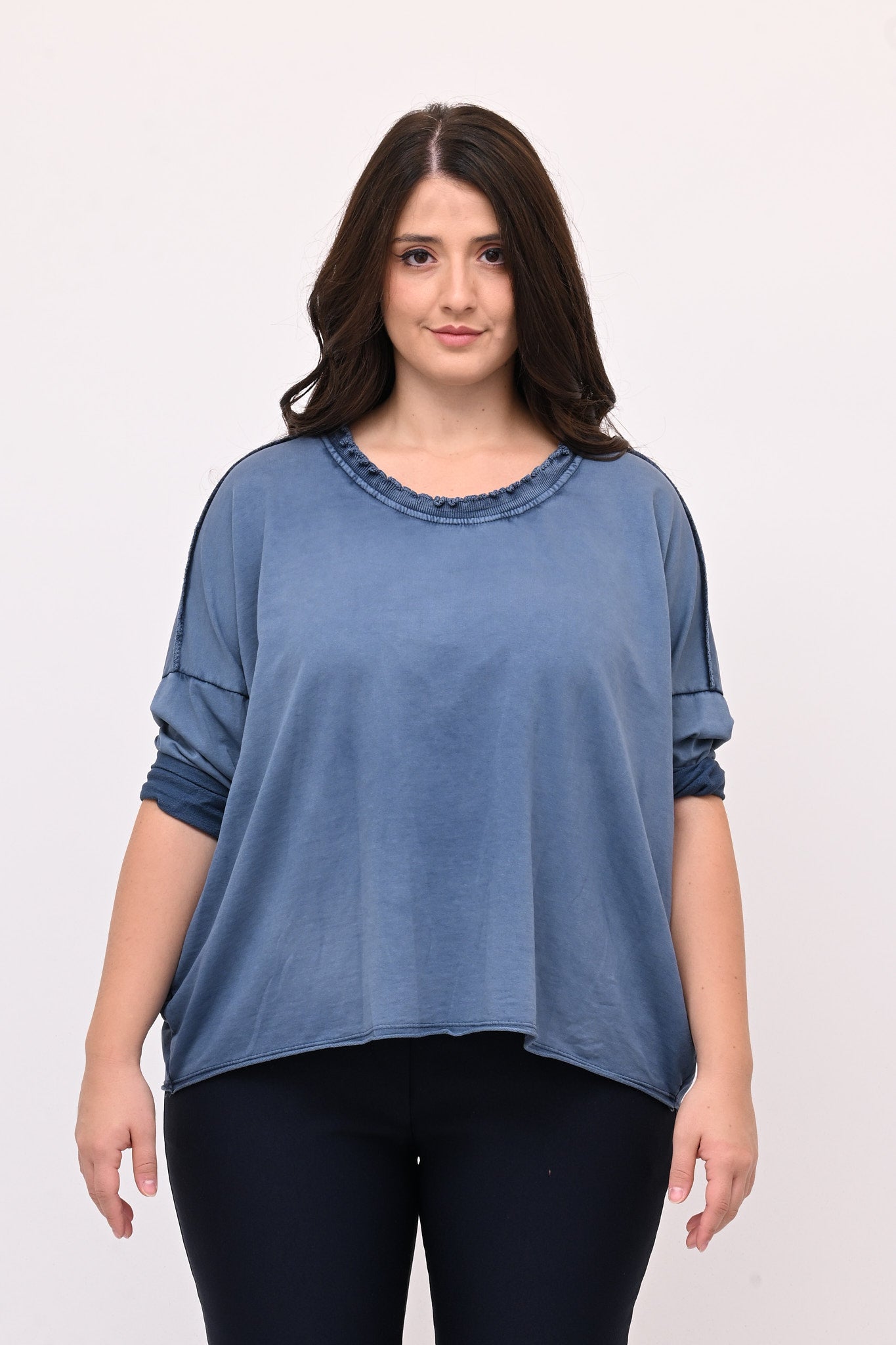 Maglia in cotone garzato elasticizzato, vestibilità over grazie alla silhouette ampia e alla spalla scesa. Il dettaglio originale e divertente dell’arriccio sul bordo del collo aggiunge un tocco distintivo al capo, rendendolo ideale per chi cerca un equilibrio tra comfort e stile raffinato.