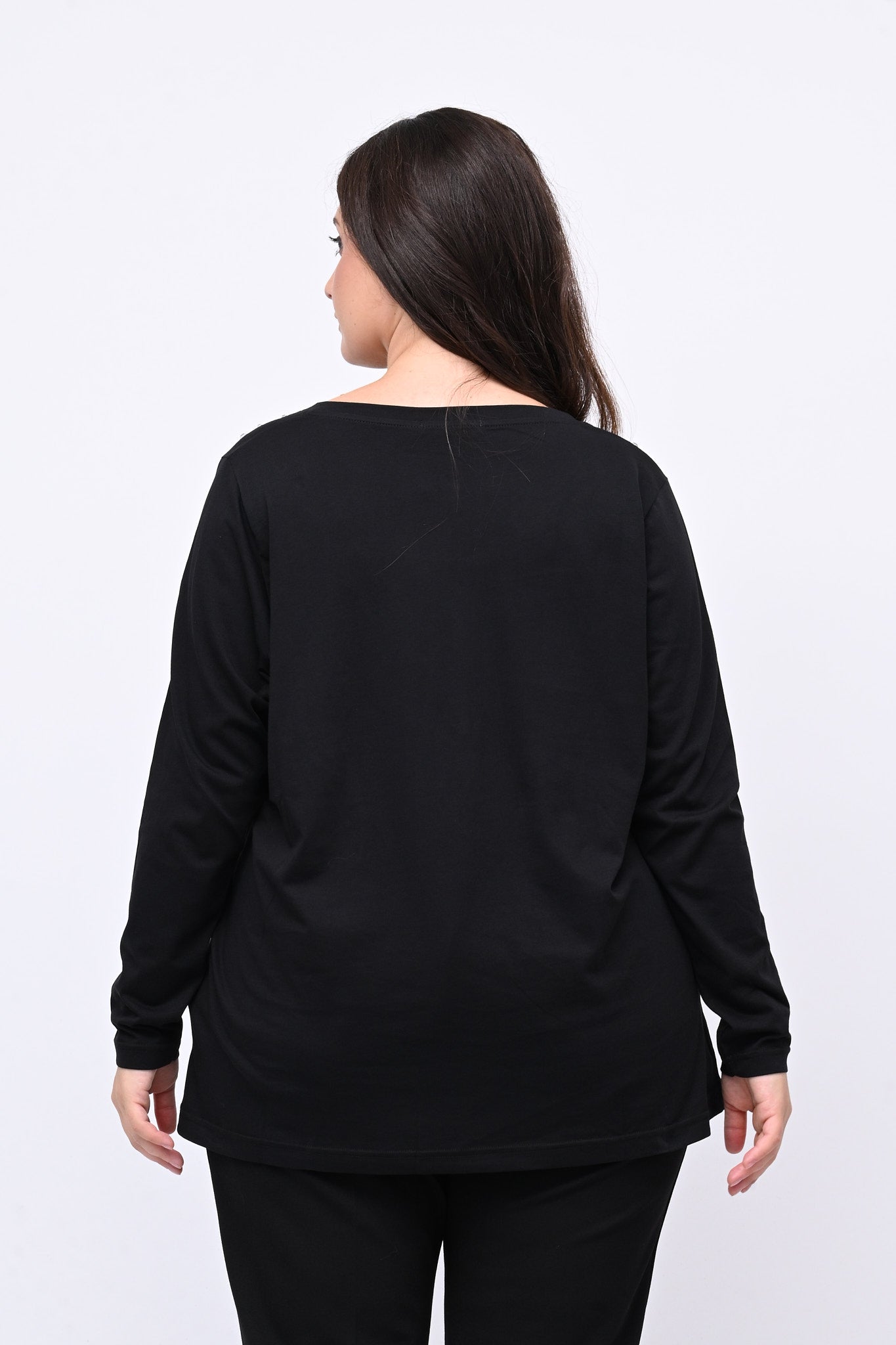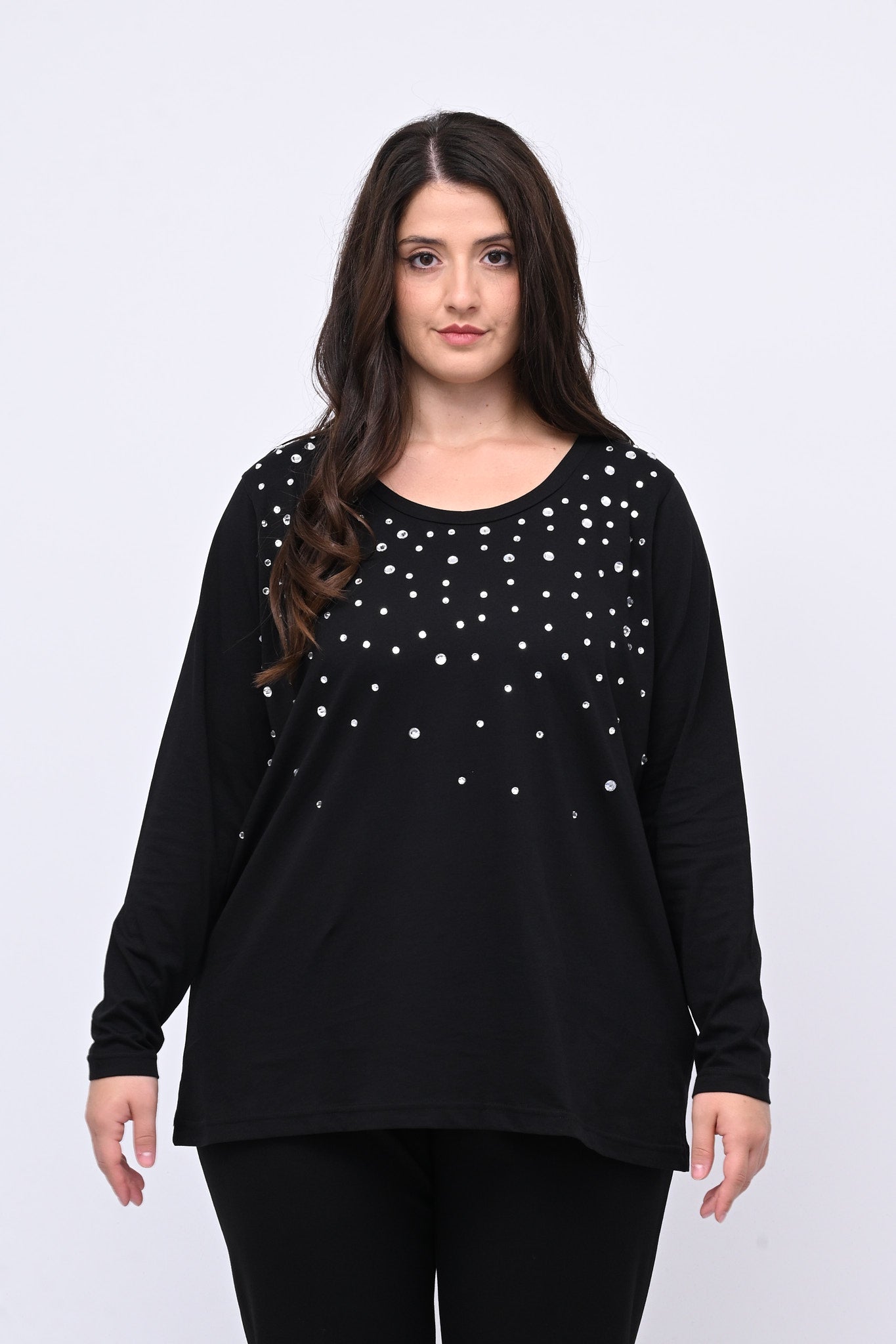 Maglia girocollo, manica lunga con pietre strass sul davanti, che aggiungono un tocco di eleganza sofisticata. Perfetta per chi cerca un capo comodo e luminoso, ideale per distinguersi senza rinunciare al comfort.