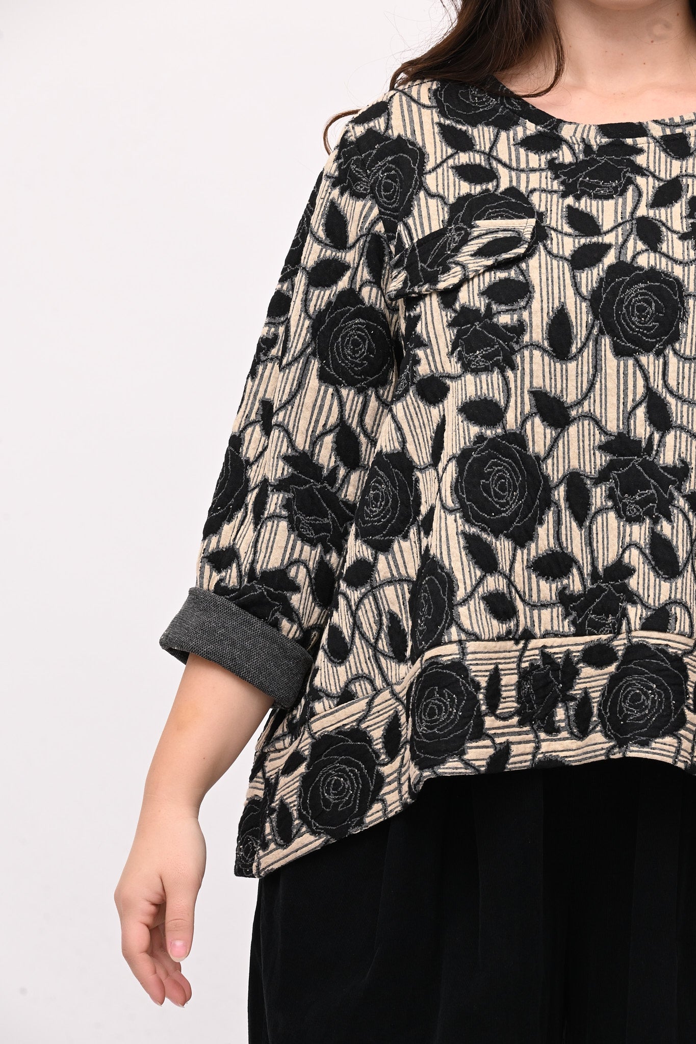 Maglia in tessuto goffrato a fantasia, girocollo, maniche lunghe e bordo alto sul fondo. La vestibilità ad A, leggermente più lunga dietro, la rende ideale per chi cerca praticità ed eleganza contemporanea dallo stile easy chic.