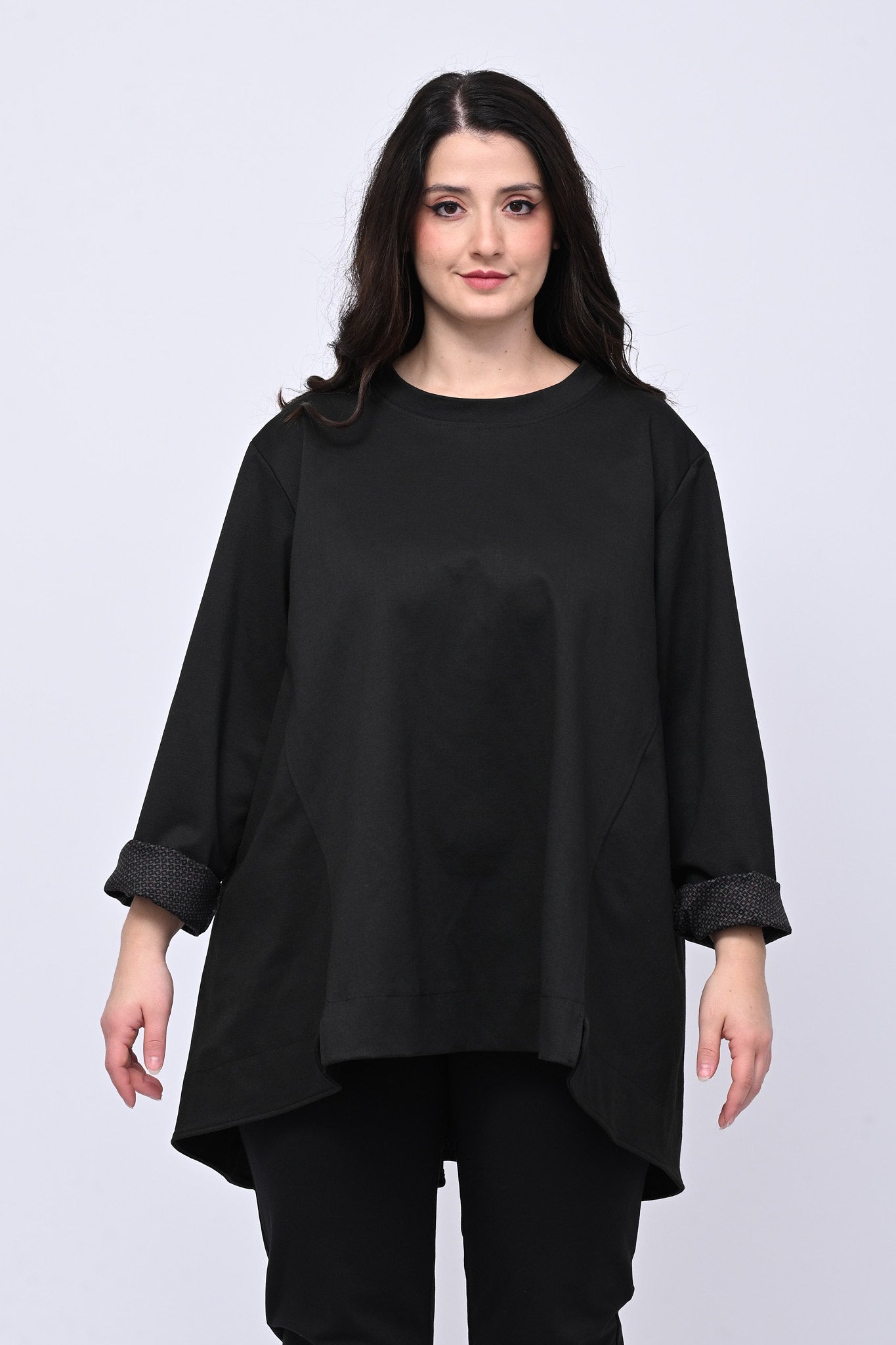 Maglia girocollo, silhouette ad A, con spacchetti frontali e più lunga dietro. La vestibilità over e rilassata assicura comfort, praticità e stile contemporaneo. Perfetta per creare look versatili e moderni.