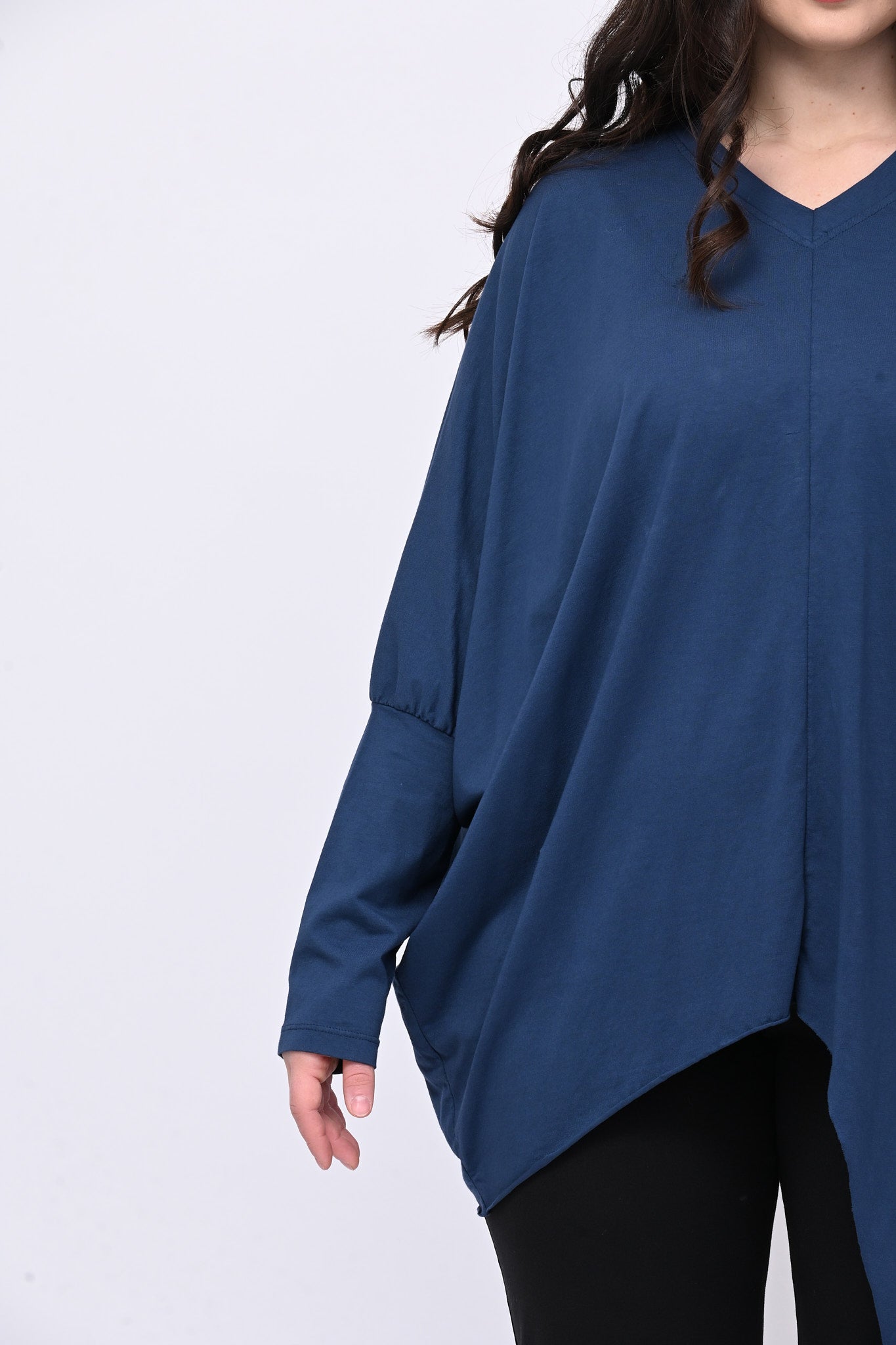 Maglia in cotone elasticizzato con scollo a V, spalle scese e polso alto, design asimmetrico con maxi punta laterale sul fondo. Perfetta per chi vuole uno stile moderno e originale, è ideale per look confortevoli e sofisticati.
