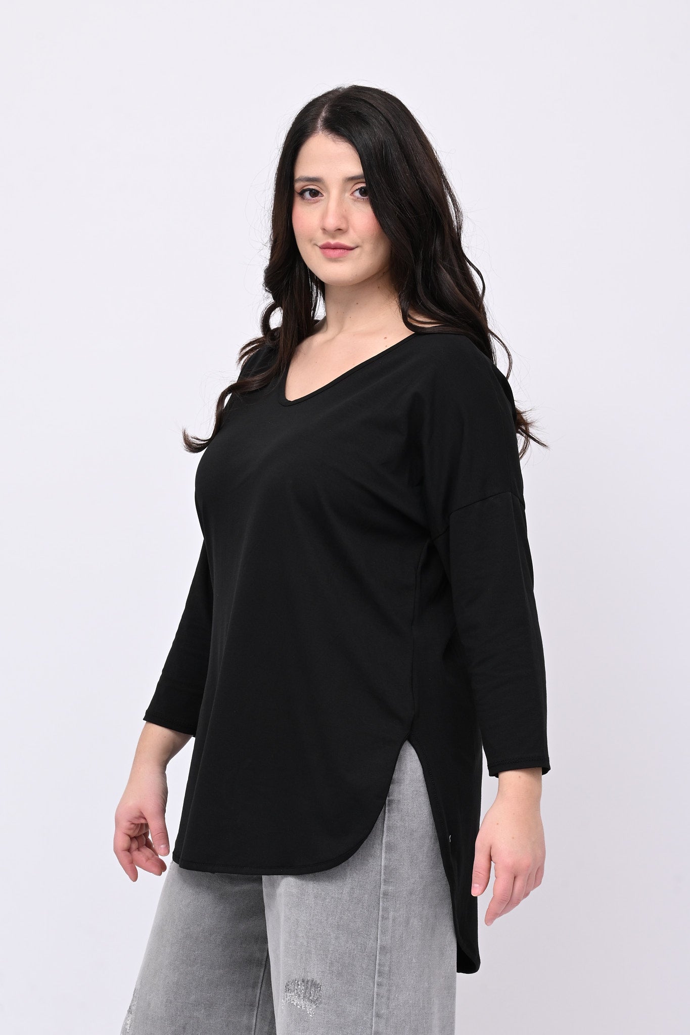 T-shirt in cotone, con scollo a V e maniche lunghe, fondo stondato e leggermente più lunga dietro. Versatile, moderna e dalla vestibilità impeccabile è perfetta per creare outfit confortevoli, pratici, senza rinunciare allo stile.