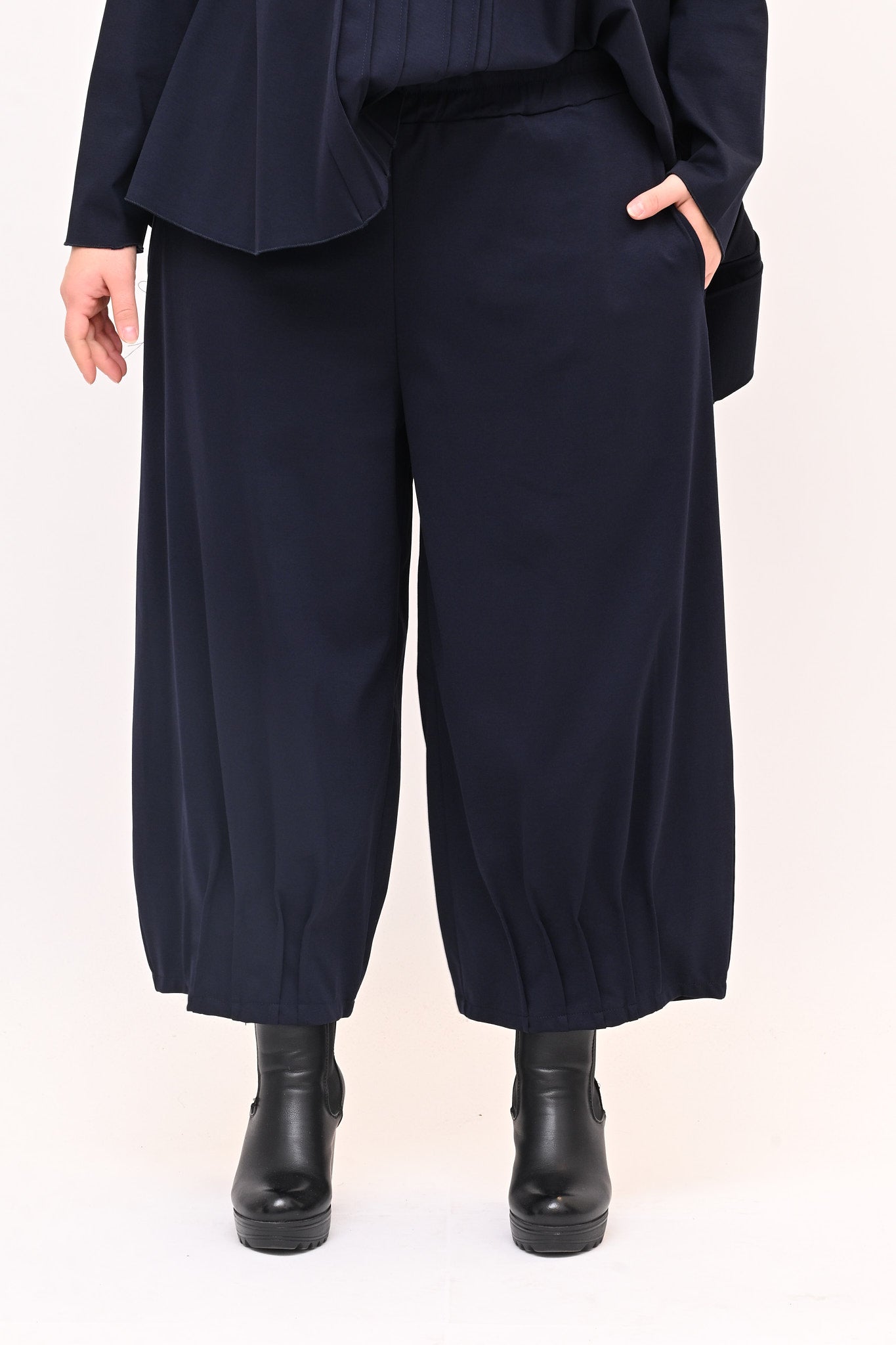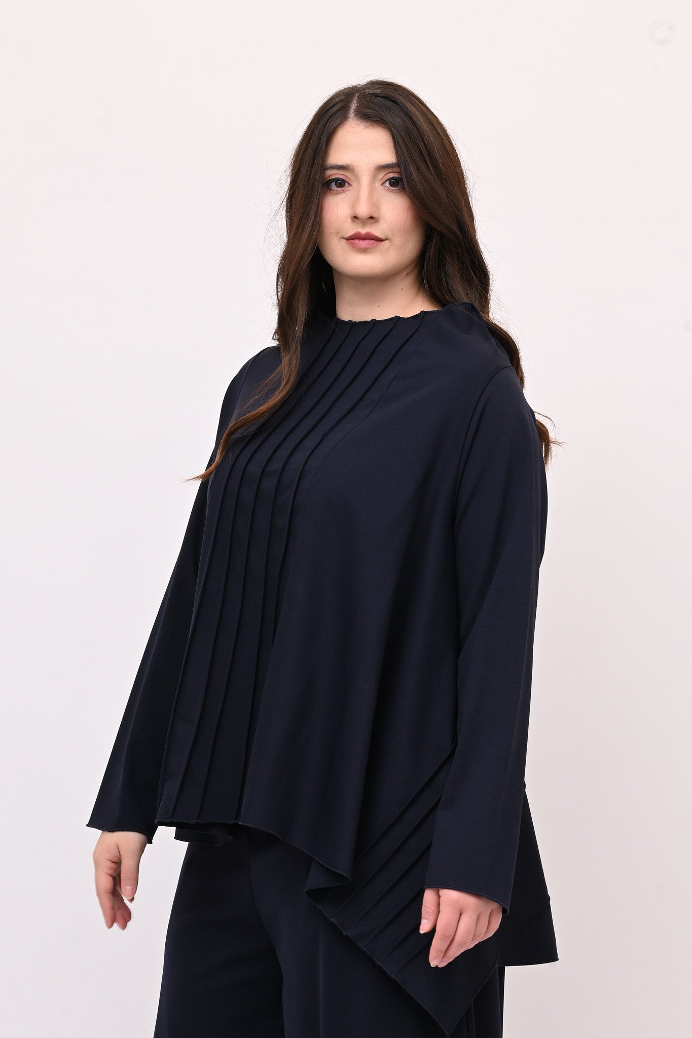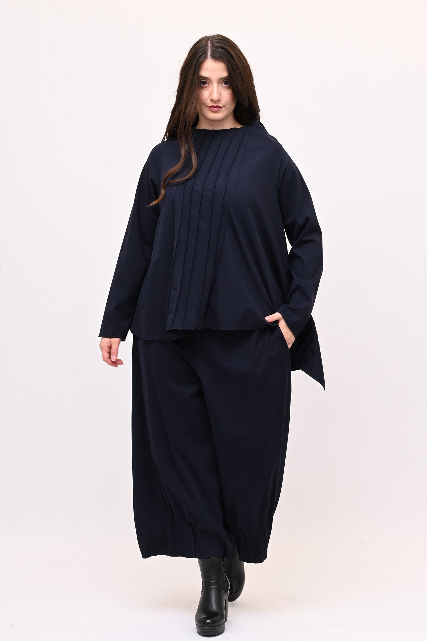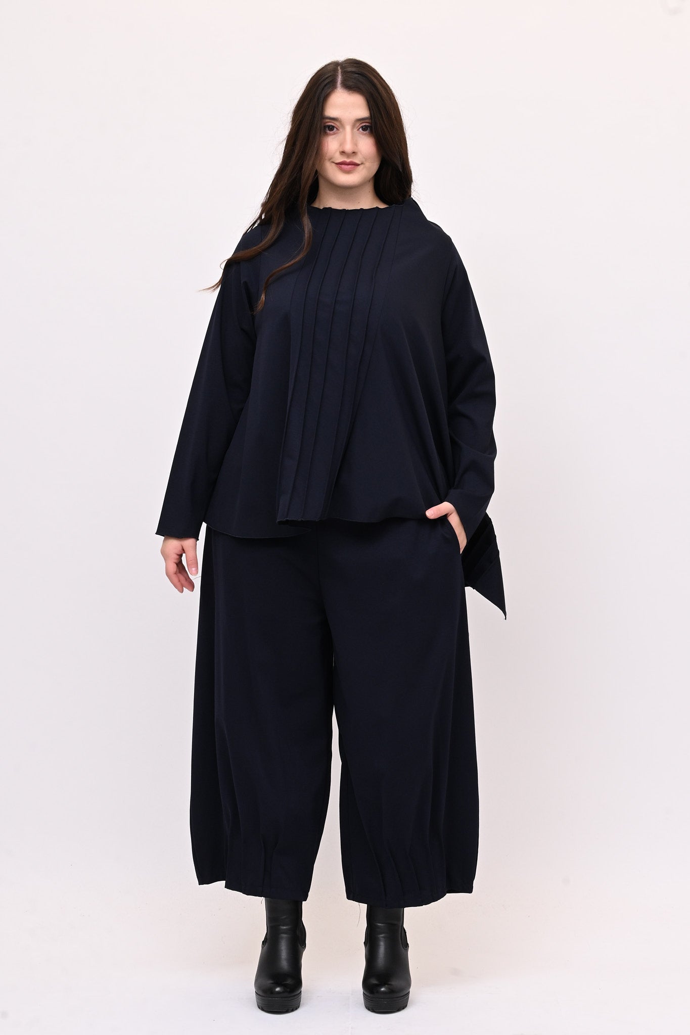 Completo in punto Milano, composto da: blusa manica lunga e pantalone modello Aladino. Il coordinato è caratterizzato da giochi di cuciture che creano pinces, punte e un motivo a vista. Originale e trendy, è ideale per un look casual grazie alla vestibilità ampia e alla gamba larga che si restringe sulla caviglia.