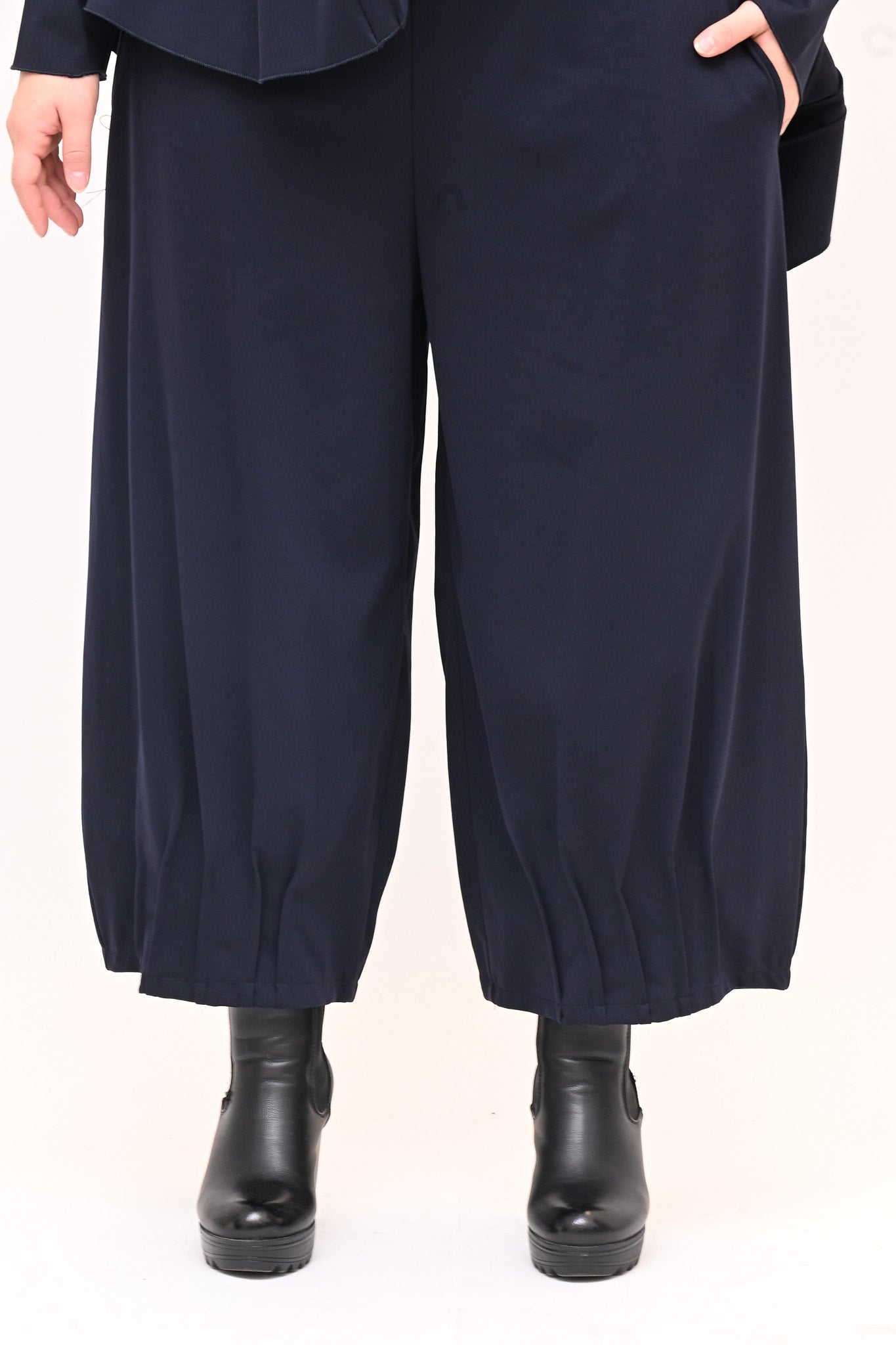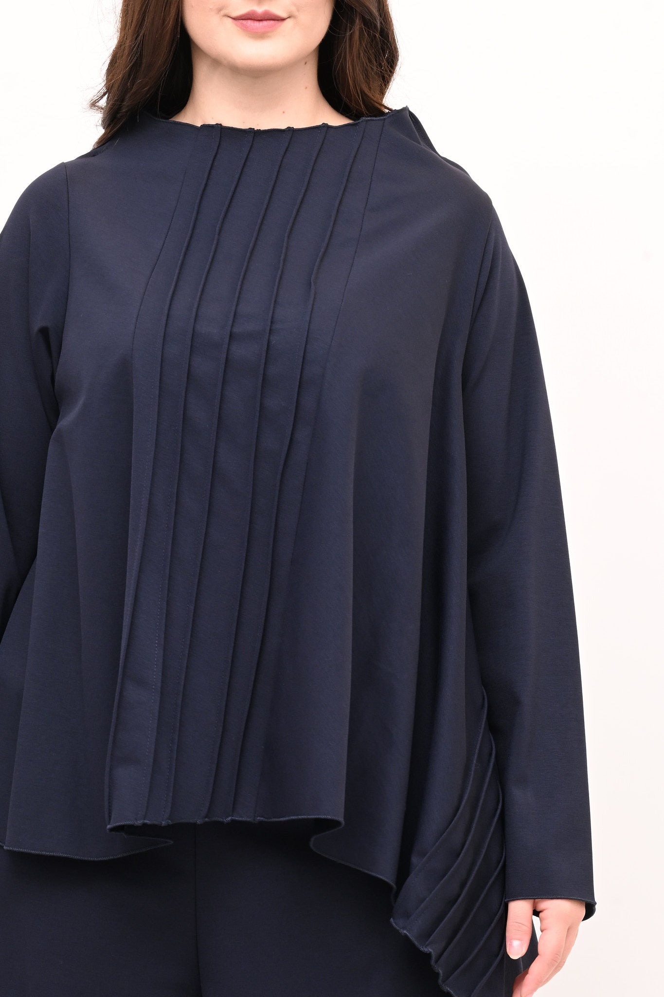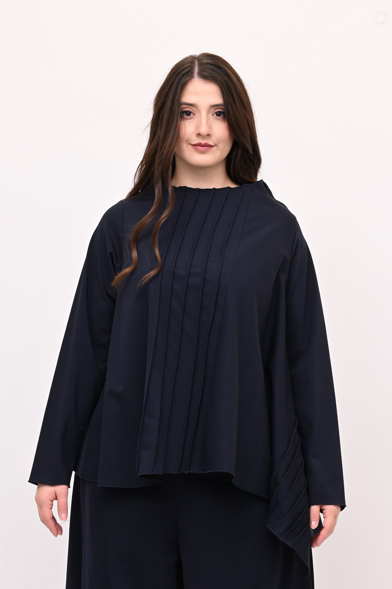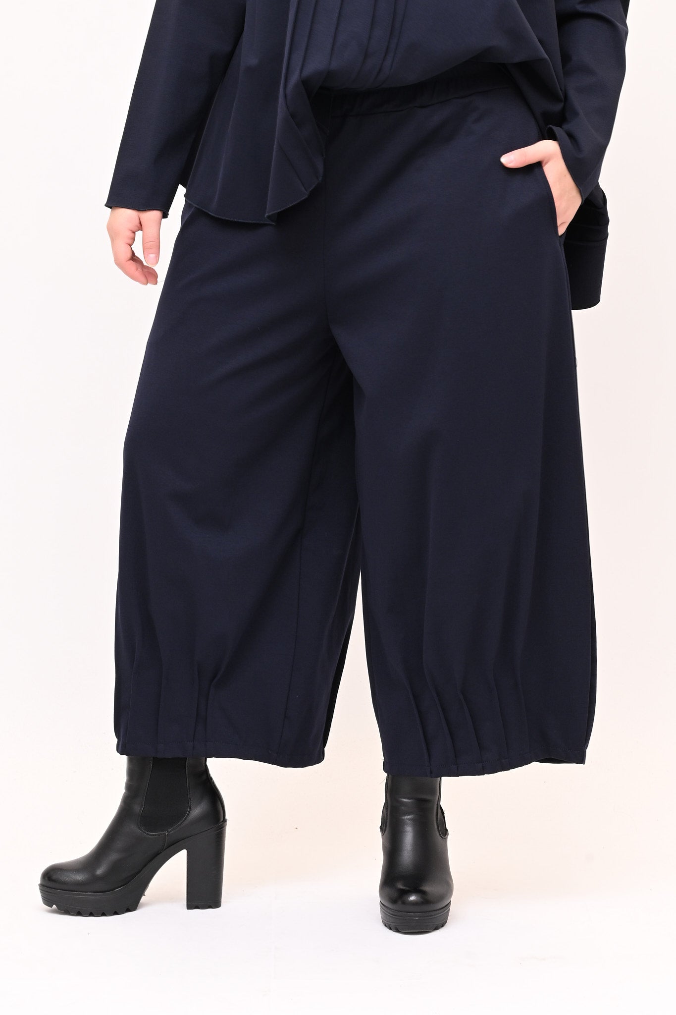 Completo in punto Milano, composto da: blusa manica lunga e pantalone modello Aladino. Il coordinato è caratterizzato da giochi di cuciture che creano pinces, punte e un motivo a vista. Originale e trendy, è ideale per un look casual grazie alla vestibilità ampia e alla gamba larga che si restringe sulla caviglia.