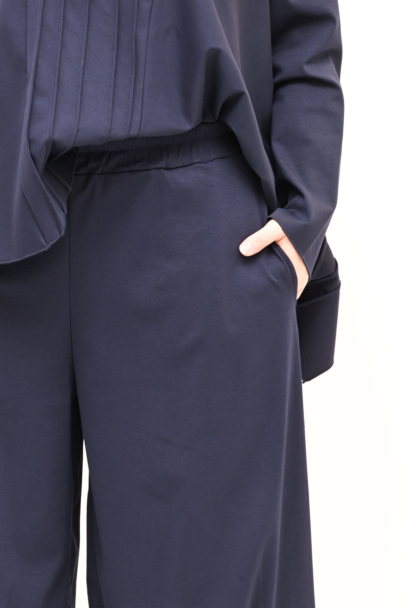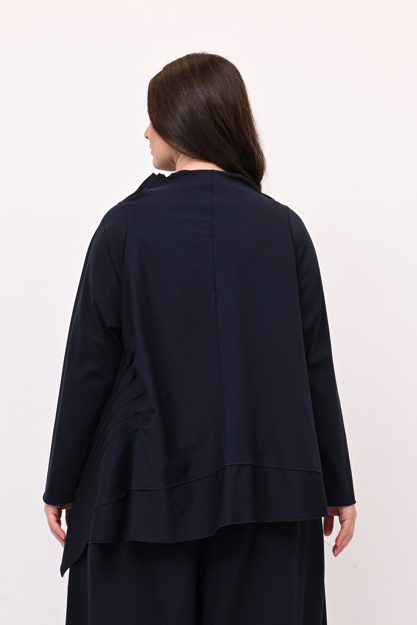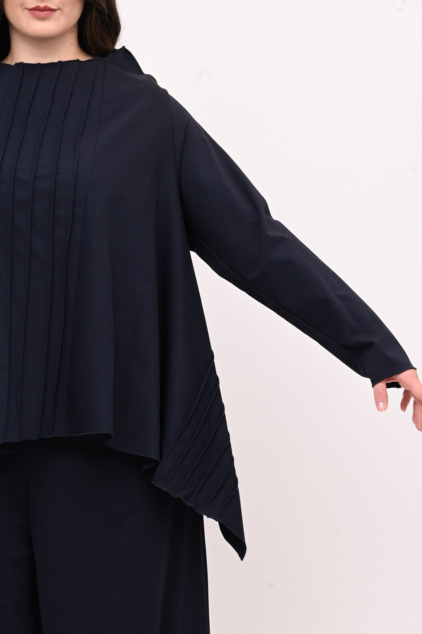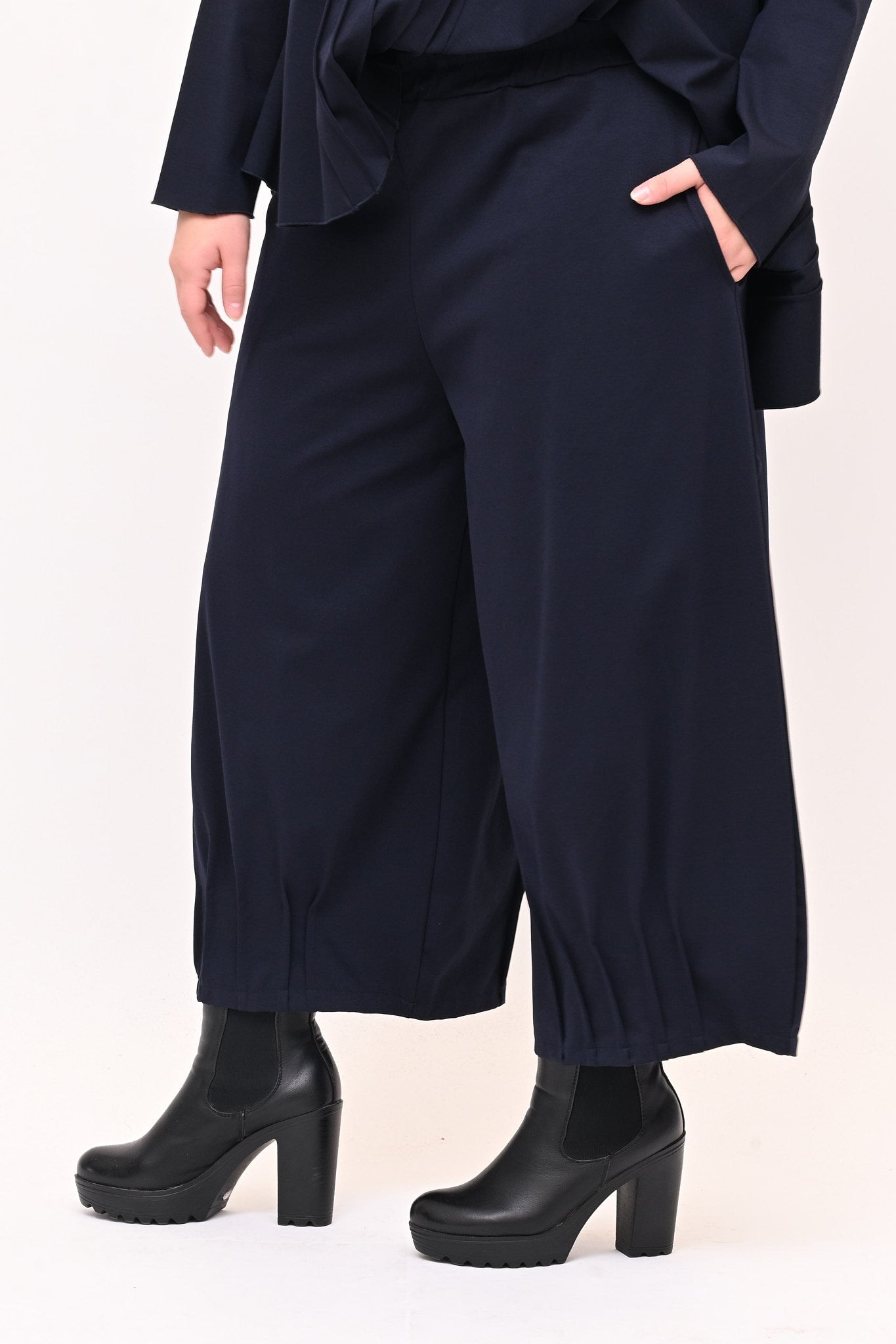 Completo in punto Milano, composto da: blusa manica lunga e pantalone modello Aladino. Il coordinato è caratterizzato da giochi di cuciture che creano pinces, punte e un motivo a vista. Originale e trendy, è ideale per un look casual grazie alla vestibilità ampia e alla gamba larga che si restringe sulla caviglia.