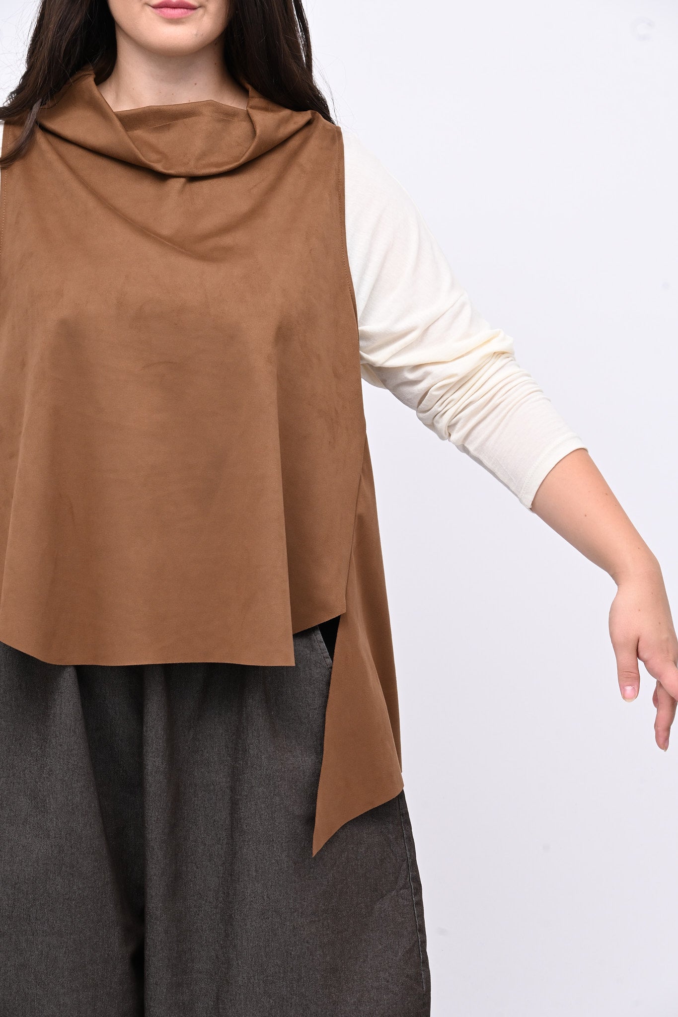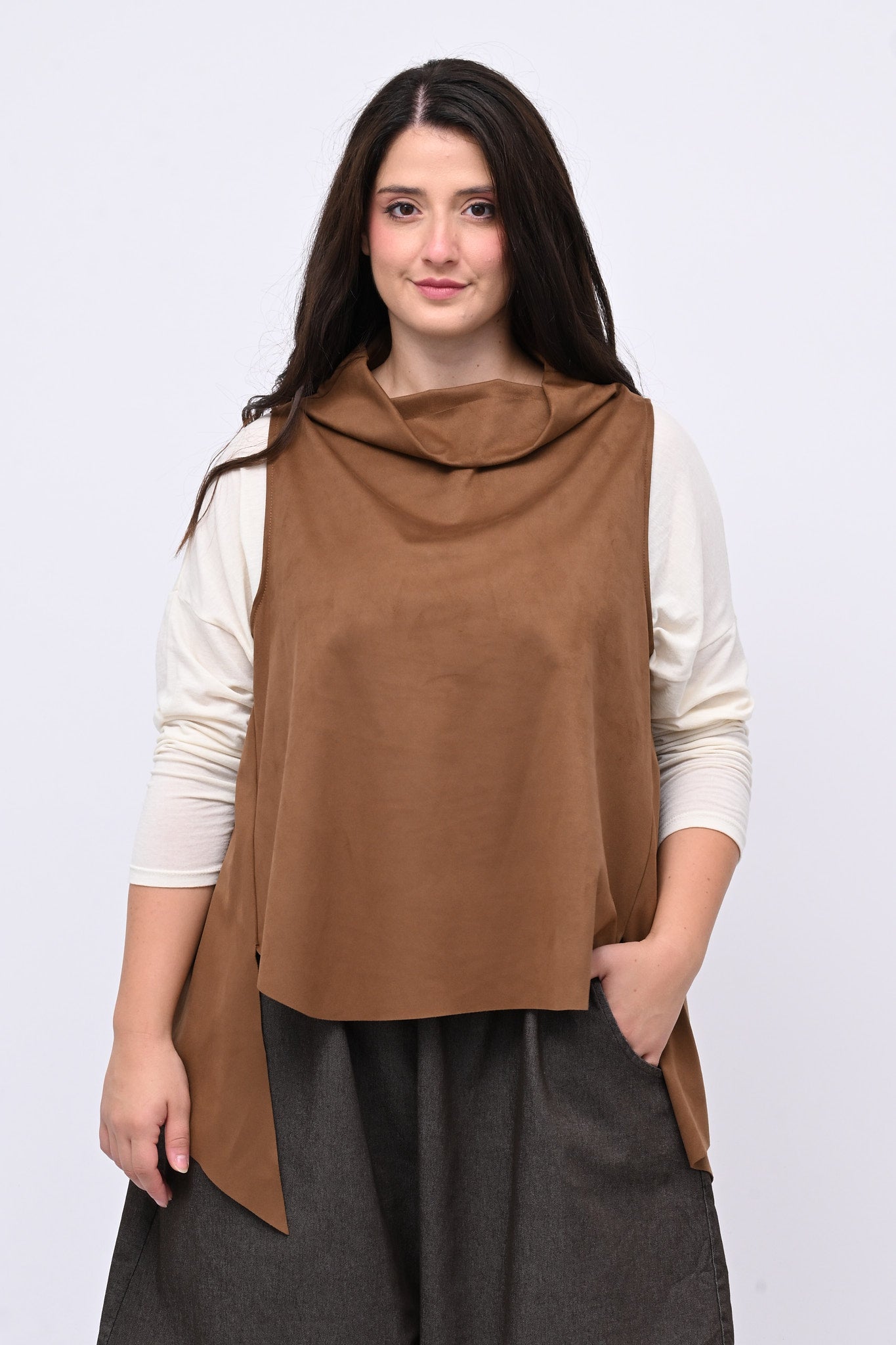 Il gilet in ecodainetto presenta una linea asimmetrica e un collo a cratere, offrendo un design contemporaneo e distintivo. Realizzato con materiali eco-sostenibili, è ideale per chi cerca un capo innovativo che unisce stile e modernità.