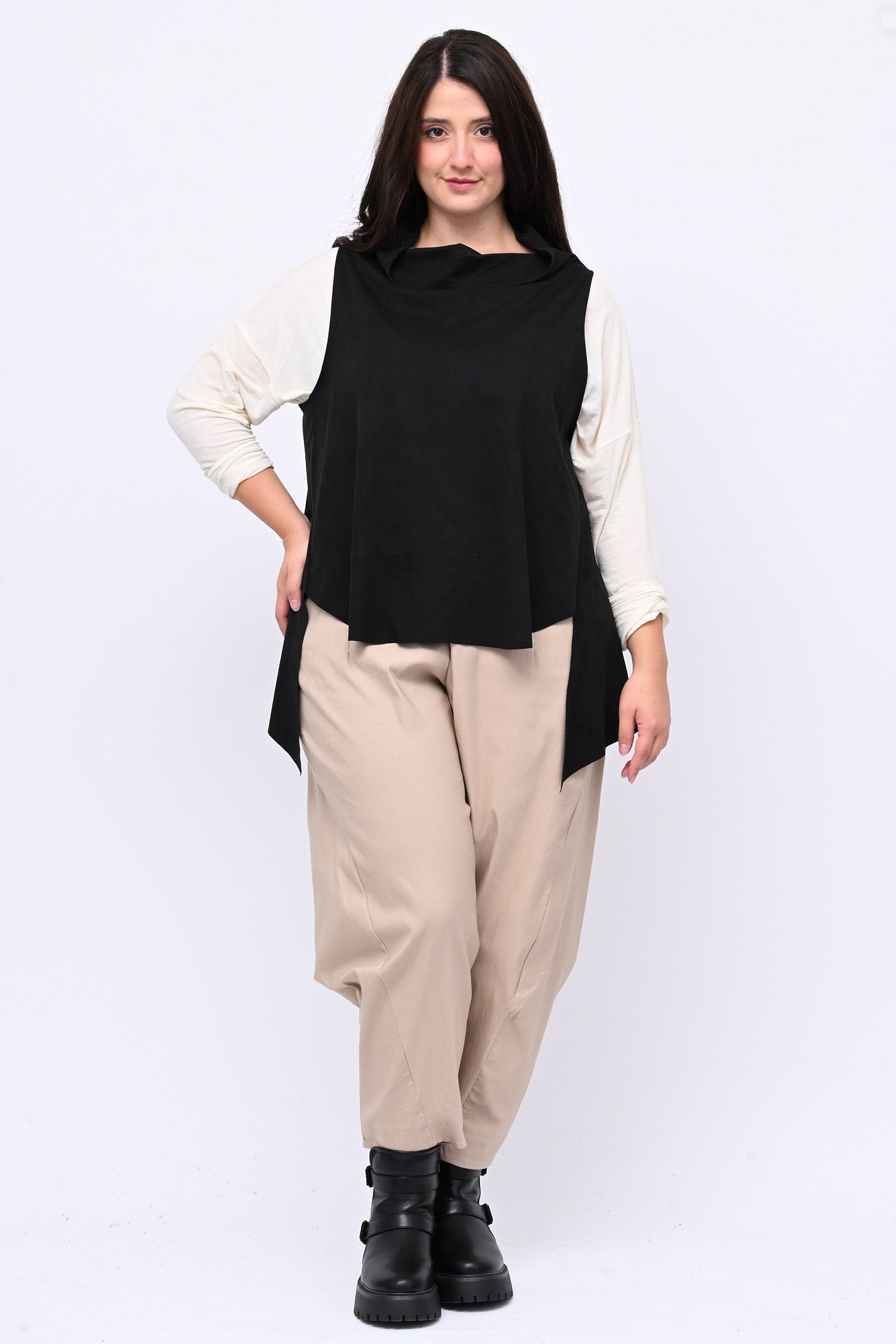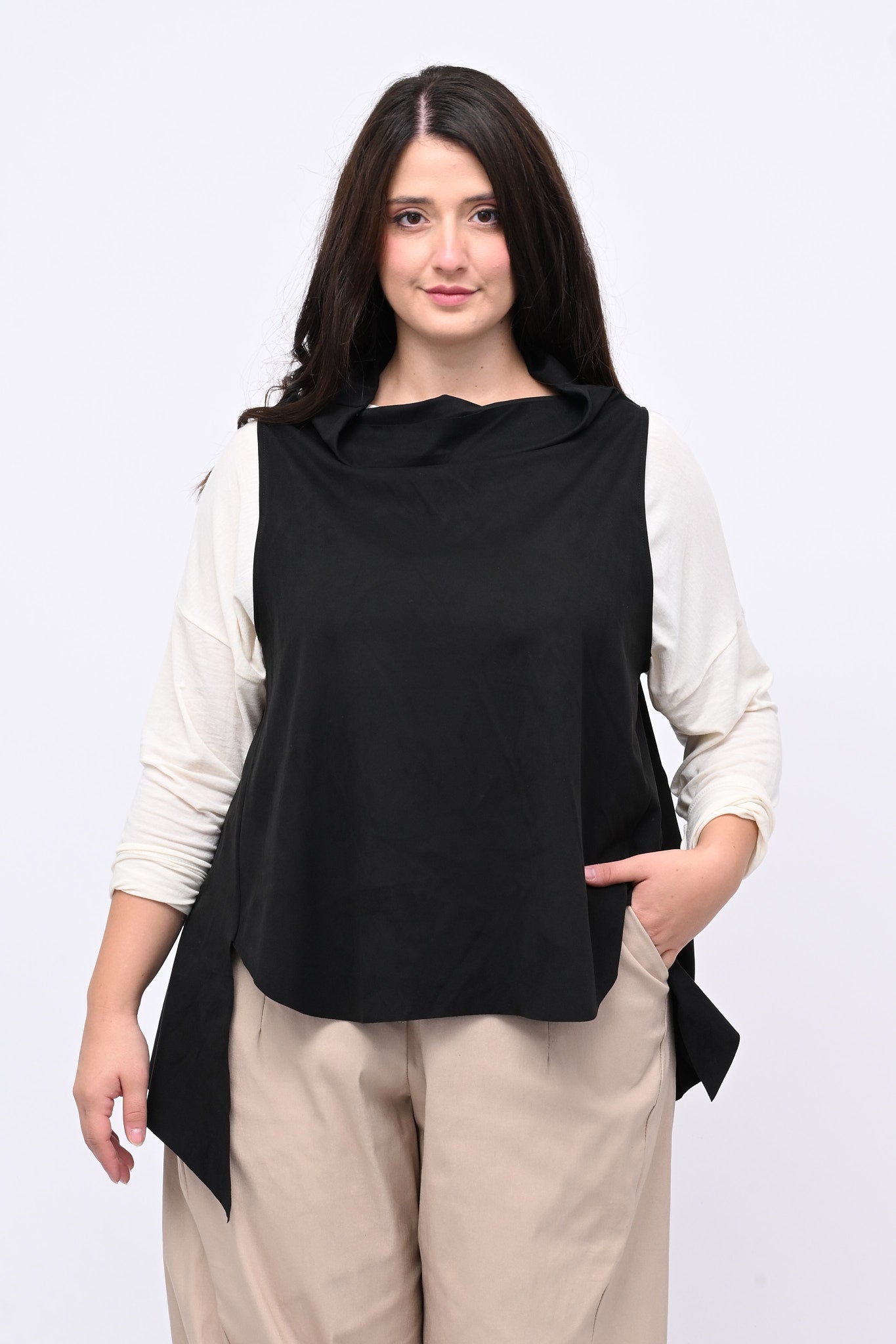 Il gilet in ecodainetto presenta una linea asimmetrica e un collo a cratere, offrendo un design contemporaneo e distintivo. Realizzato con materiali eco-sostenibili, è ideale per chi cerca un capo innovativo che unisce stile e modernità.