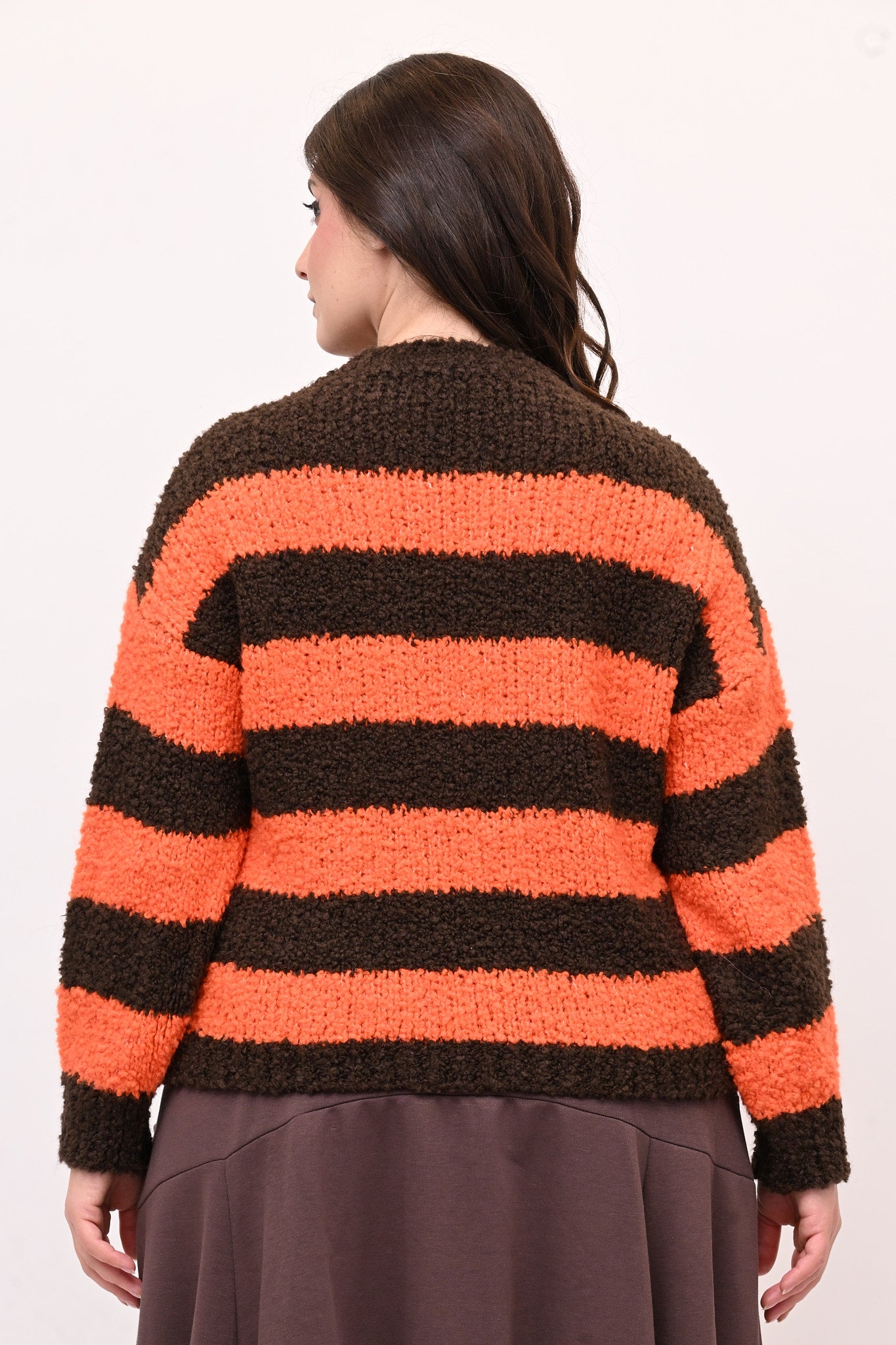 Pull boucle, misto lana, fantasia a righe, girocollo, manica lunga, lunghezza alla vita. Caldo e confortevole è capo divertente, versatile e facile da abbinare nel guardaroba invernale.