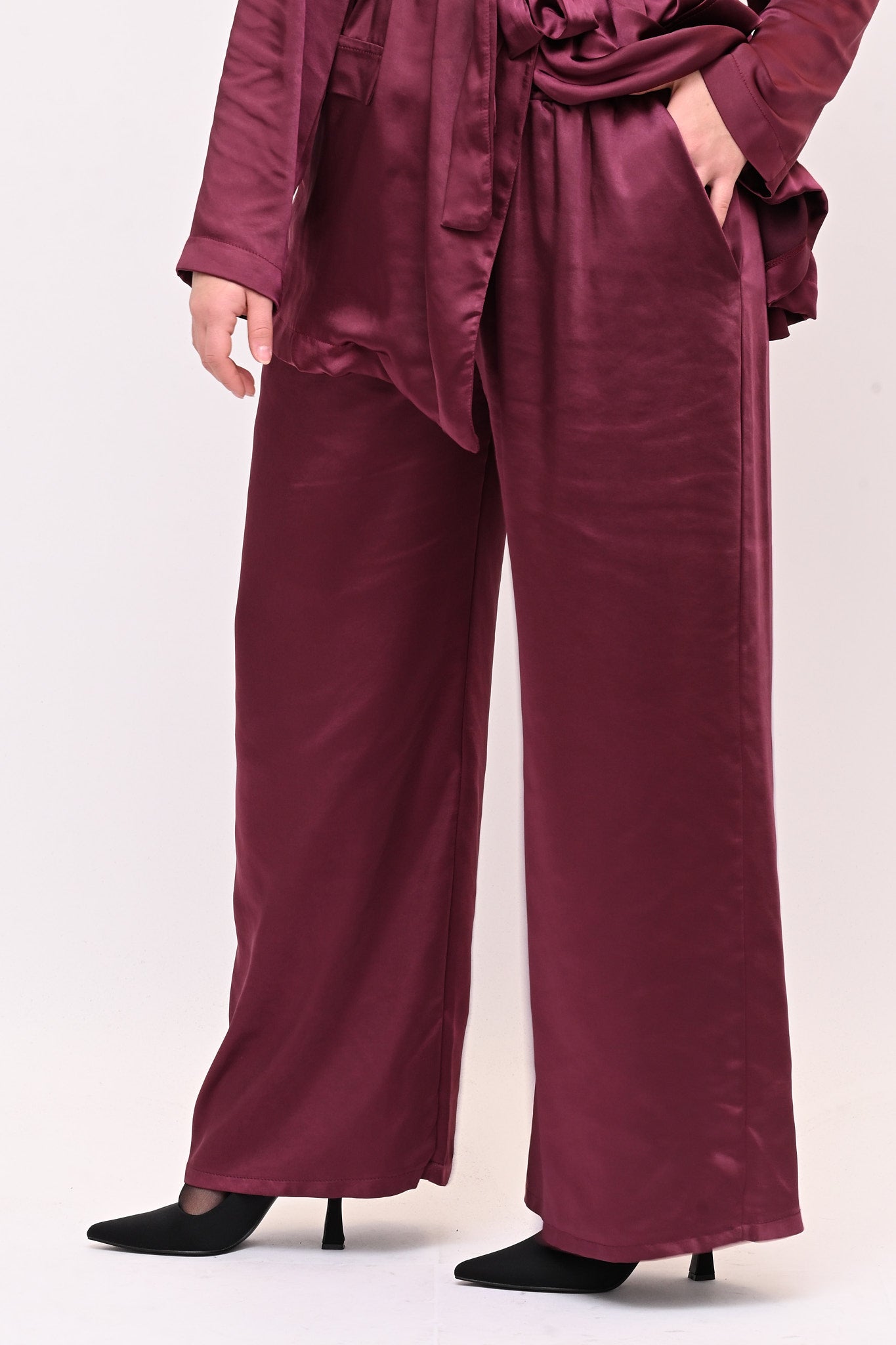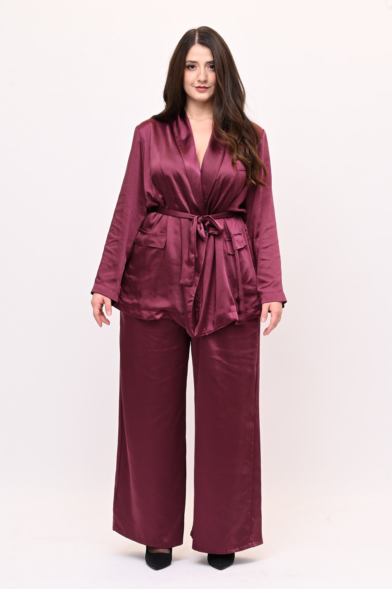 Tailleur "stile pigiama" in raso, composto da: giacca monobottone, con rever, spalline e cinta in vita. Il pantalone è modello palazzo, con elastico in vita e tasche laterali. La vestibilità del completo è morbida e scivolata e garantisce massima comodità ed eleganza contemporanea. Ideale per look easy chic raffinati e di tendenza.