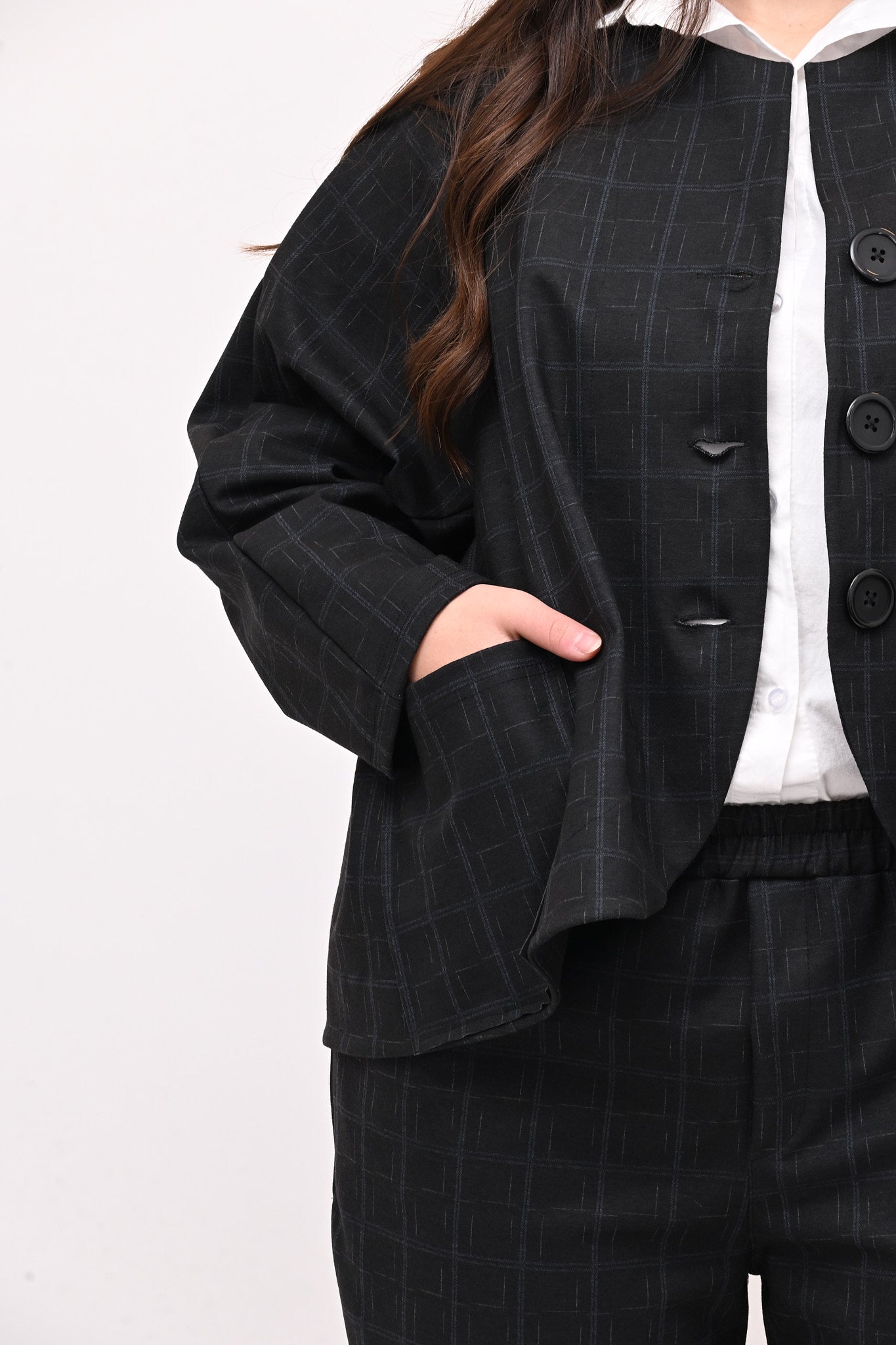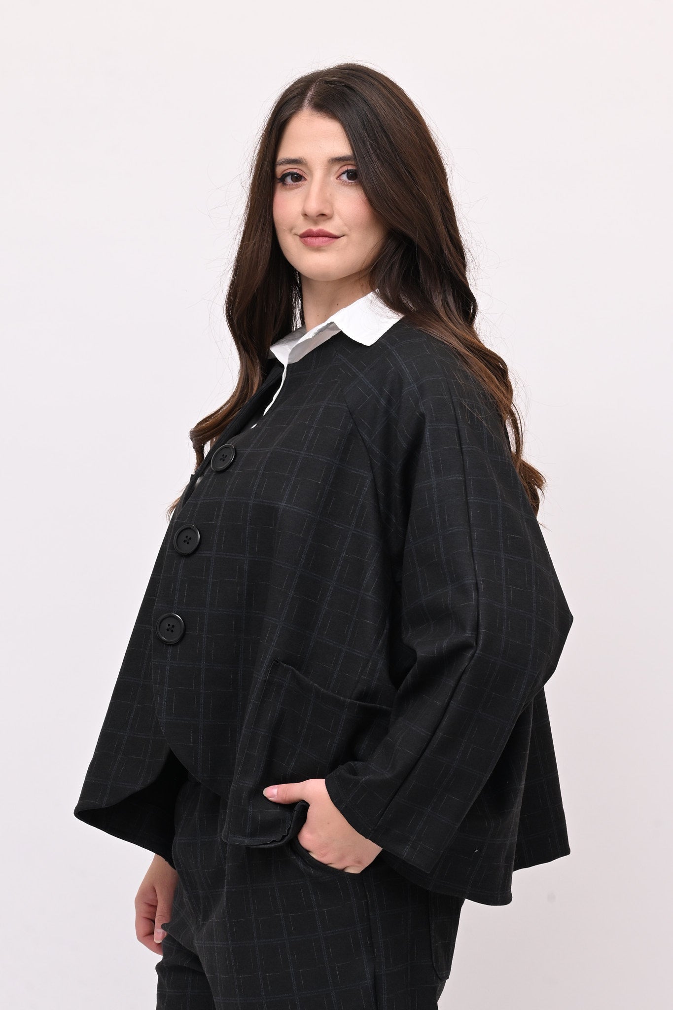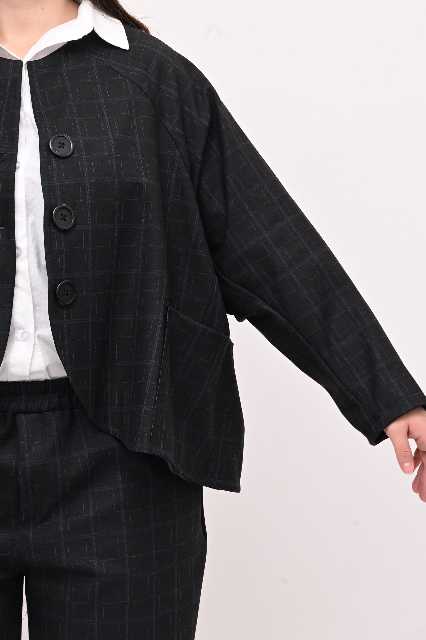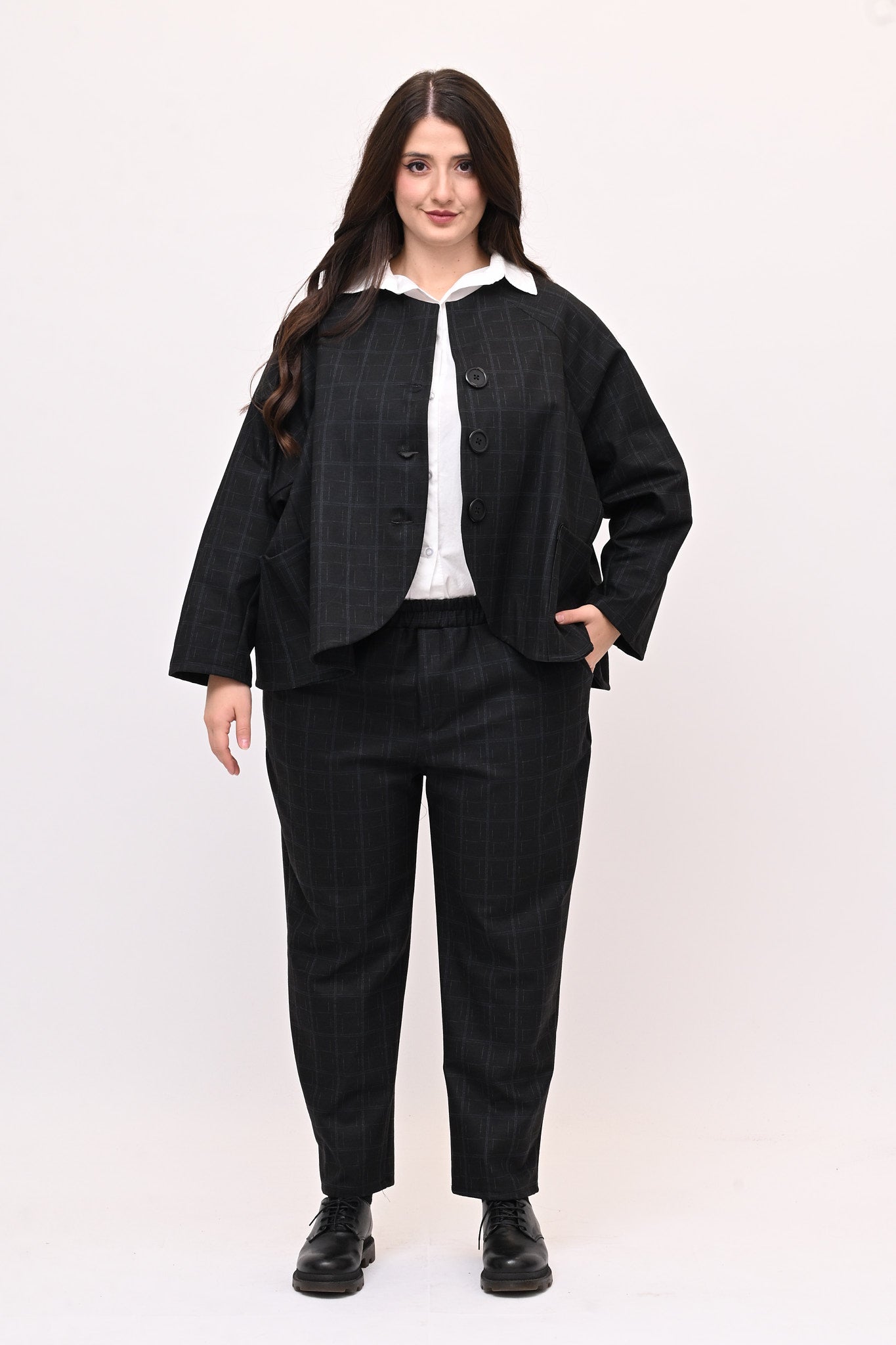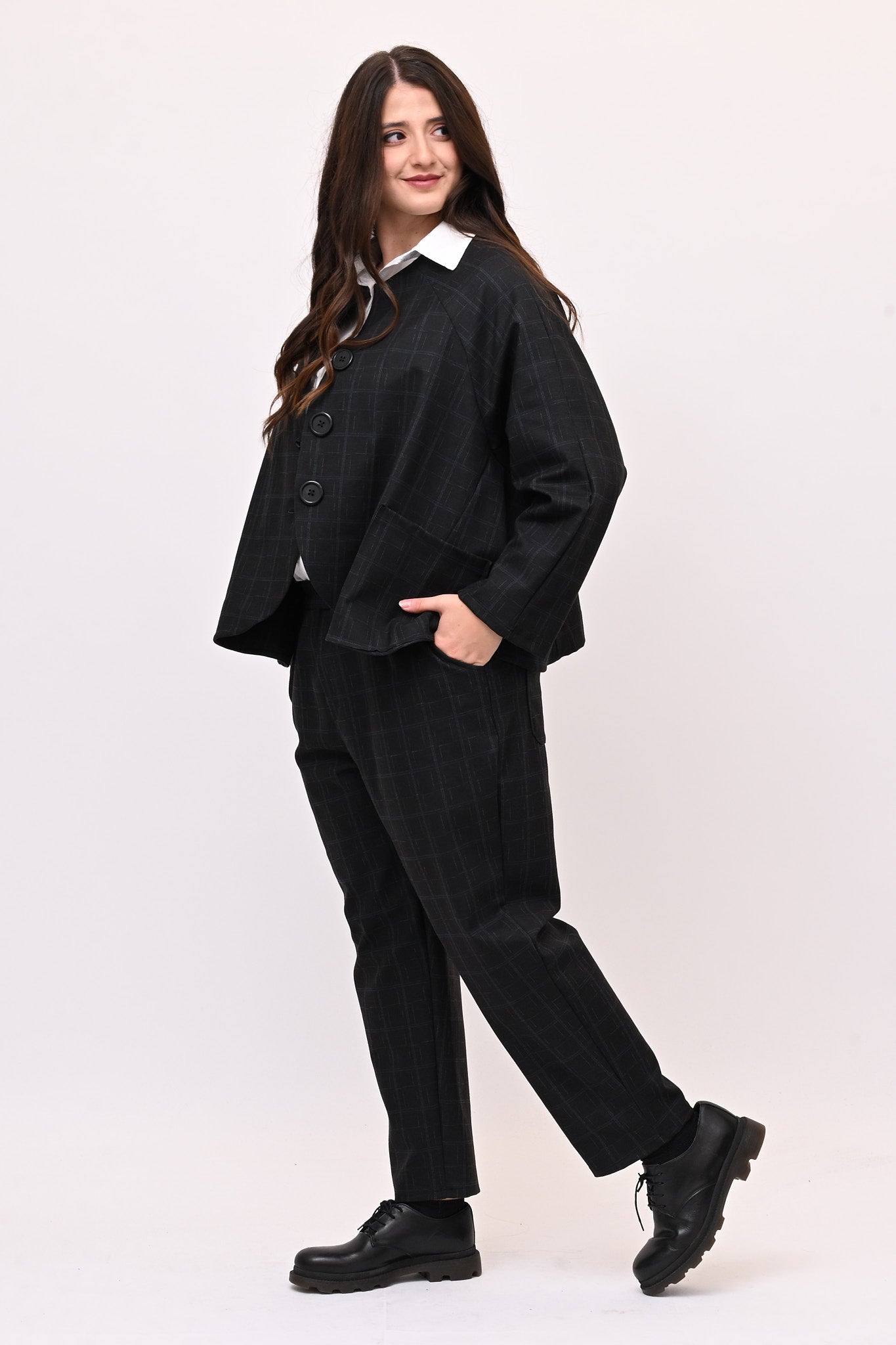 Completo in fustagno, fantasia a quadri, composto da: giacca con collo alla coreana, maniche lunghe, tasche a vista e grandi bottoni. Il pantalone crop ha elastico in vita e tasche laterali. Perfetto per un look sia casual che più formale, è ideale per chi apprezza i dettagli.
