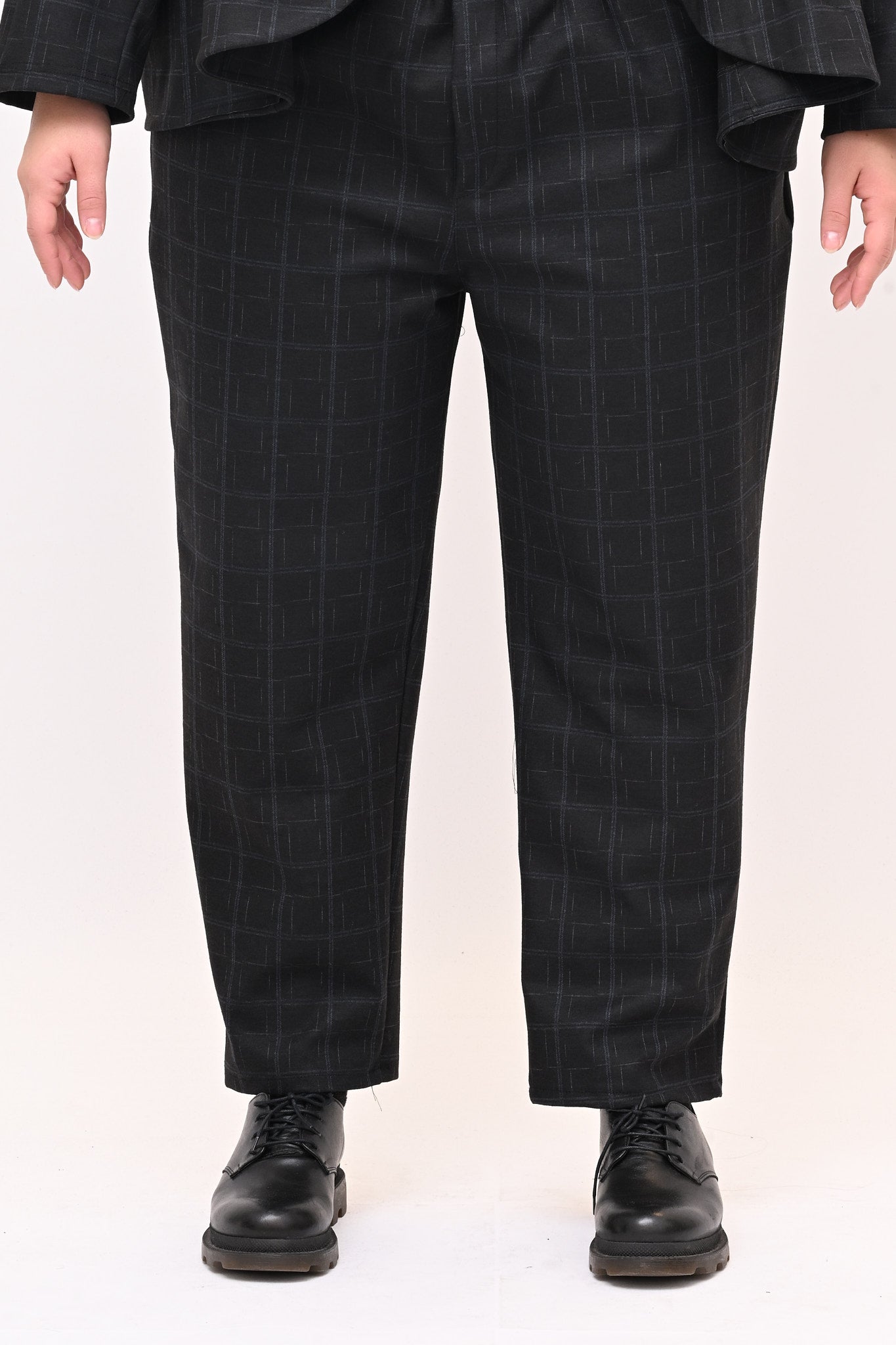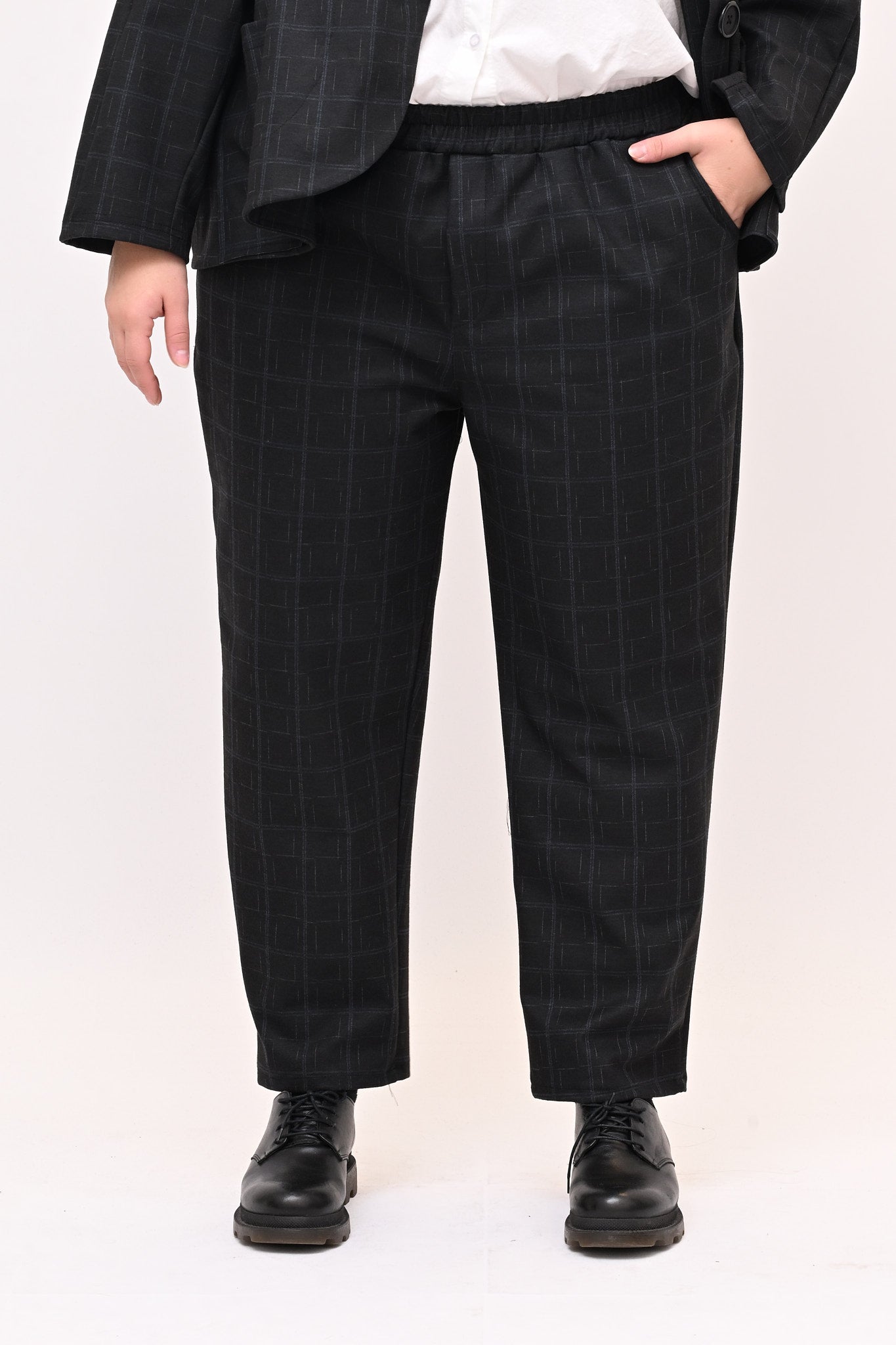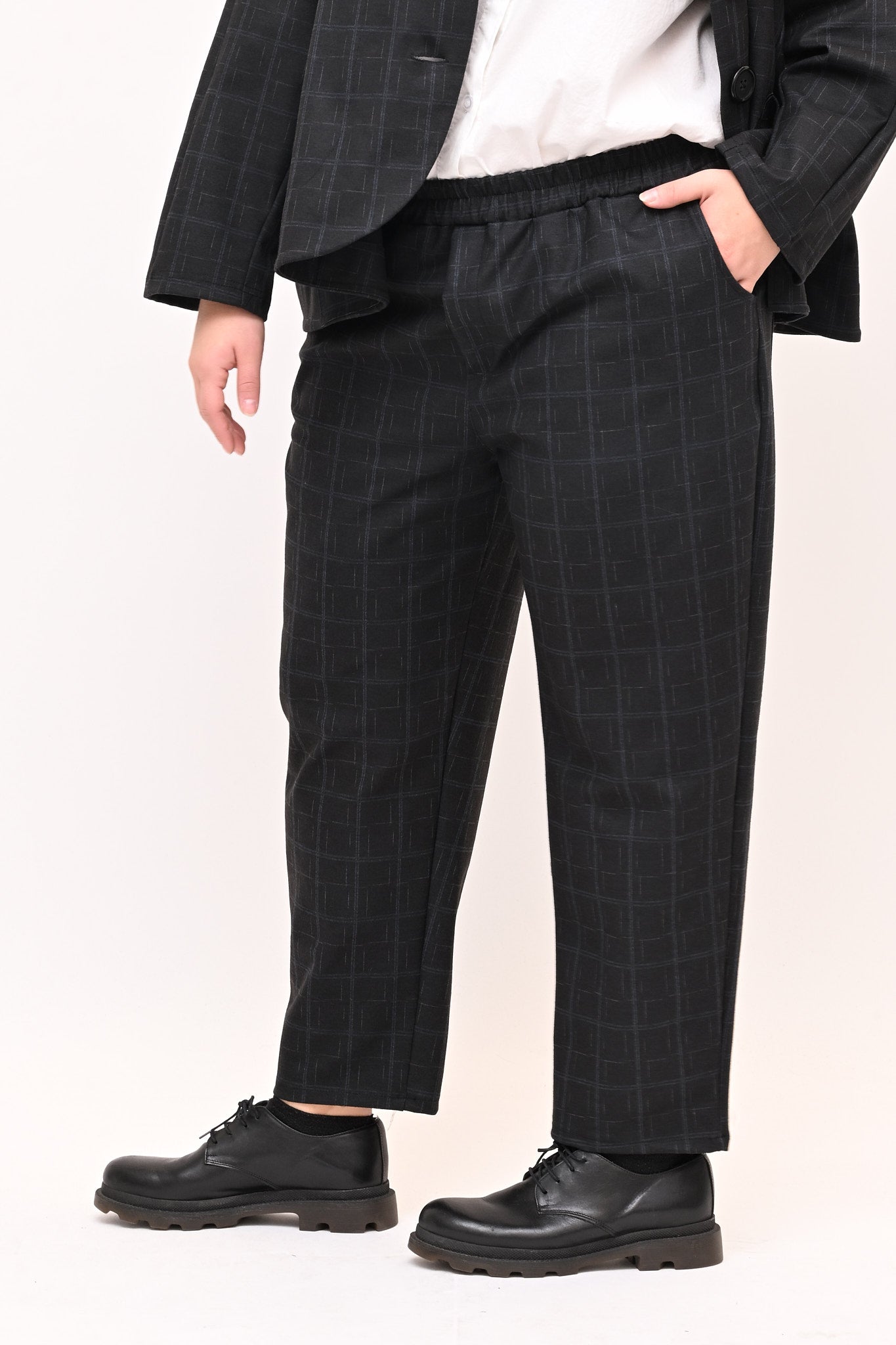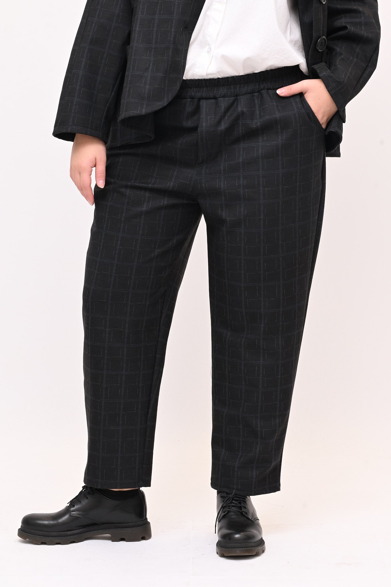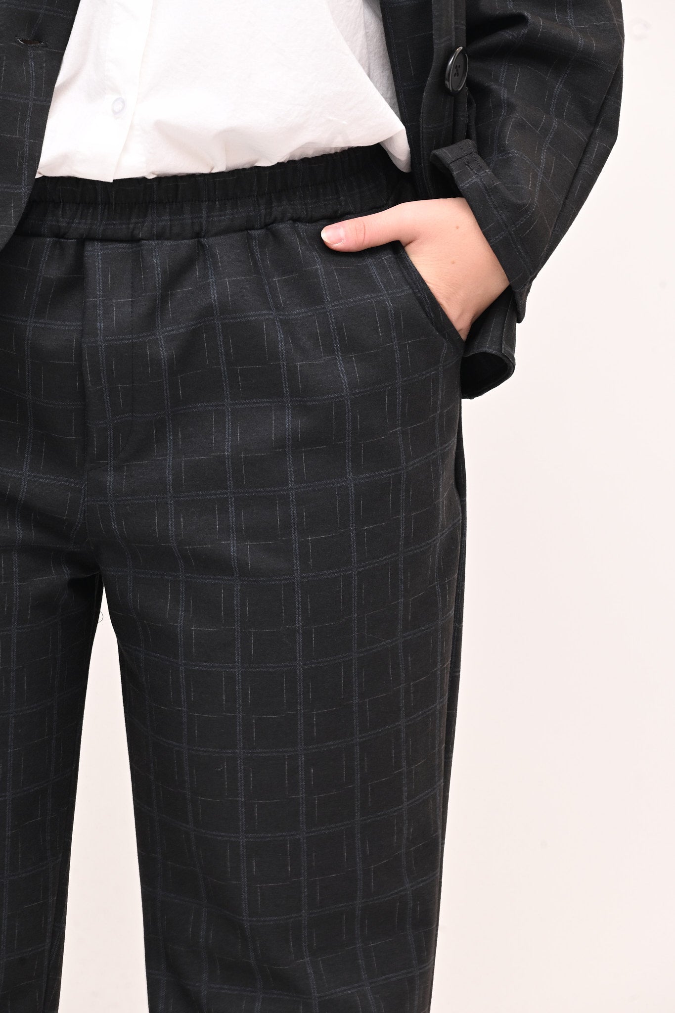 Completo in fustagno, fantasia a quadri, composto da: giacca con collo alla coreana, maniche lunghe, tasche a vista e grandi bottoni. Il pantalone crop ha elastico in vita e tasche laterali. Perfetto per un look sia casual che più formale, è ideale per chi apprezza i dettagli.