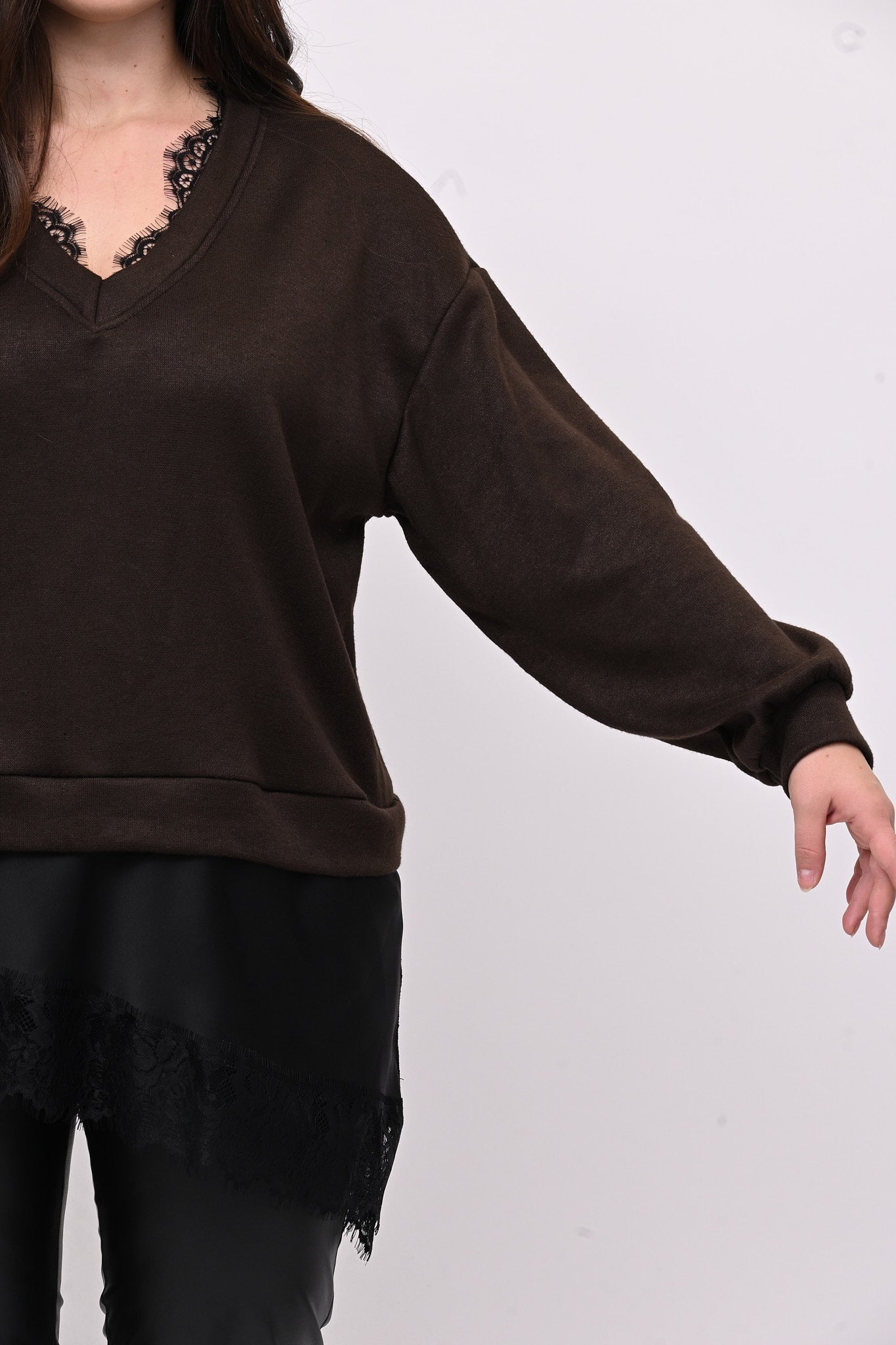 Pull in maglia, con scollo a V profondo e maniche lunghe rifinite con polsini. Il capo presenta un delicato pizzo integrato sulla scollatura, mentre un inserto asimmetrico in raso e pizzo sul fondo crea un effetto di sovrapposizione. Elegante e sofisticato, è ideale per look trendy e easy chic.