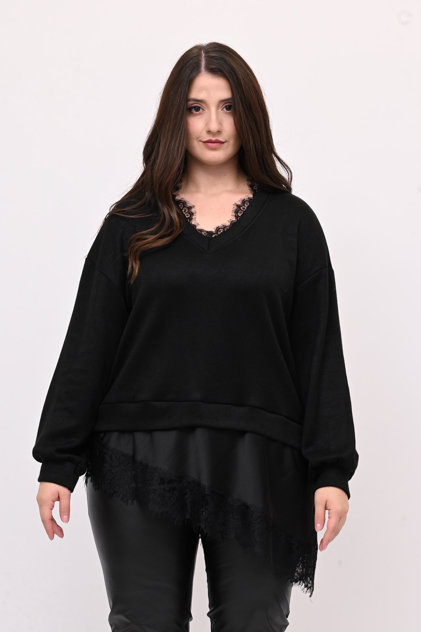 Pull in maglia, con scollo a V profondo e maniche lunghe rifinite con polsini. Il capo presenta un delicato pizzo integrato sulla scollatura, mentre un inserto asimmetrico in raso e pizzo sul fondo crea un effetto di sovrapposizione. Elegante e sofisticato, è ideale per look trendy e easy chic.