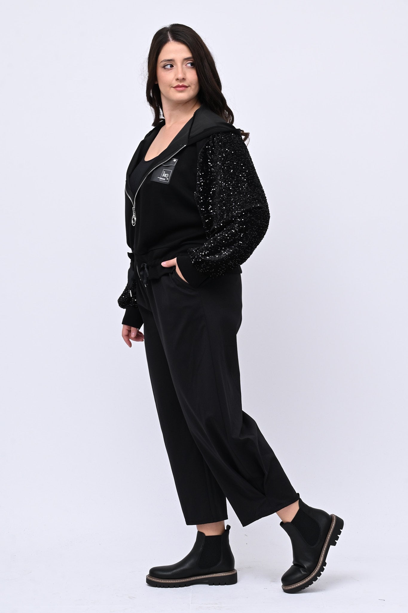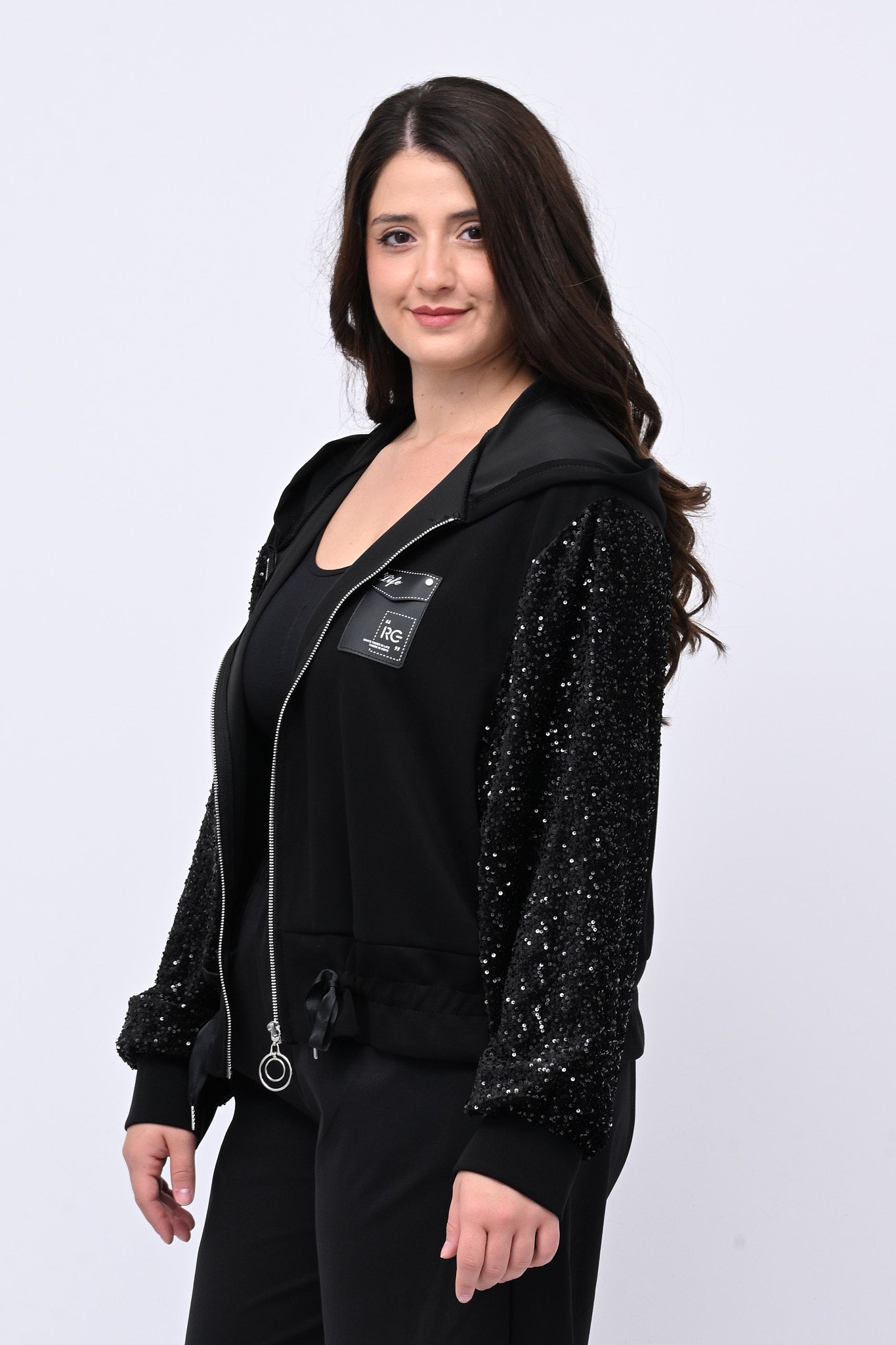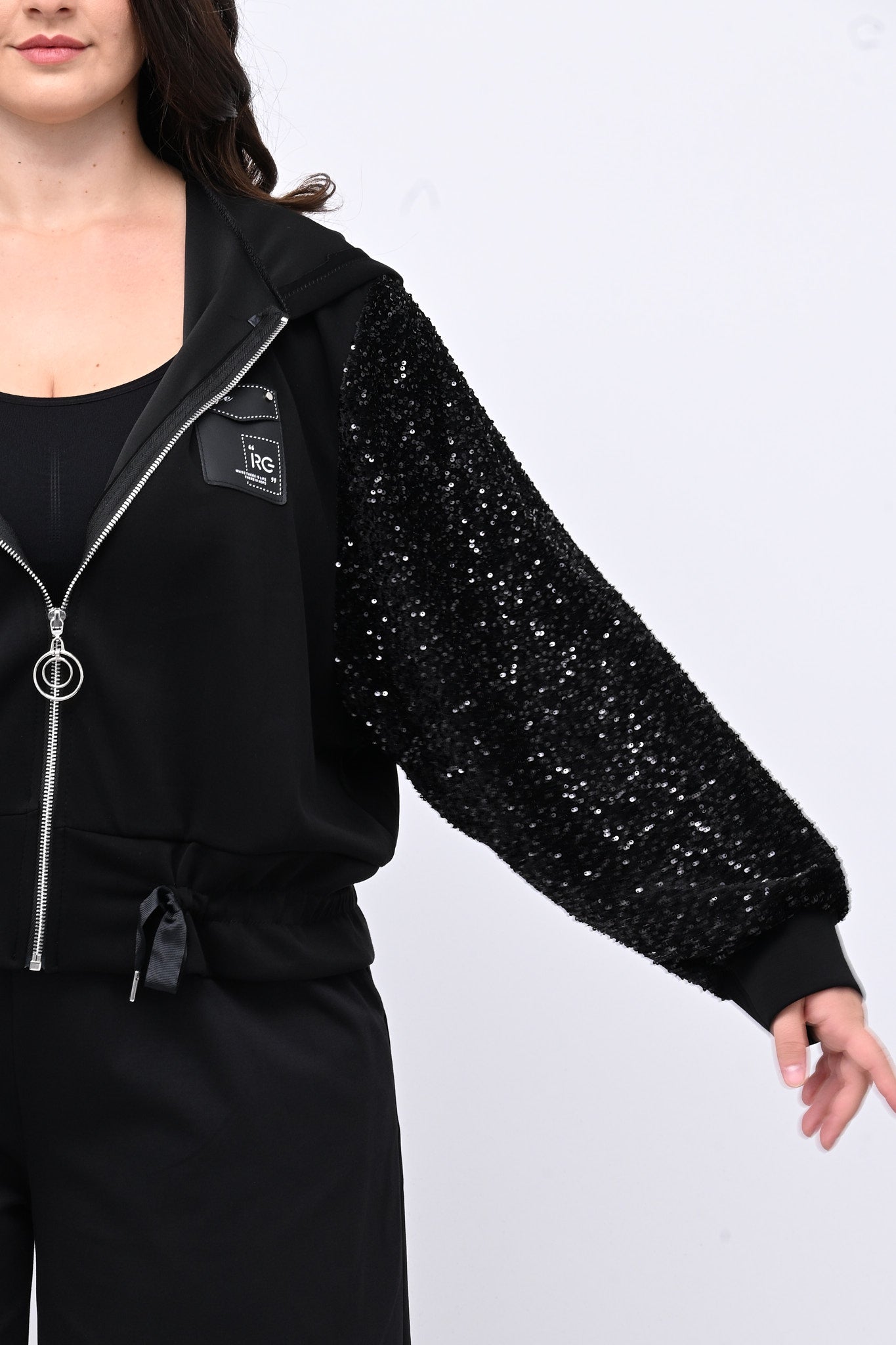 Felpa in neoprene, con zip frontale, cappuccio e laccio regolabile sul fondo per una vestibilità personalizzata. Le paillettes ton sur ton sulle maniche e il dettaglio sul seno la rendono raffinata ed elegante. Ideale per chi cerca un capo di carattere, femminile e dalla linea moderna.