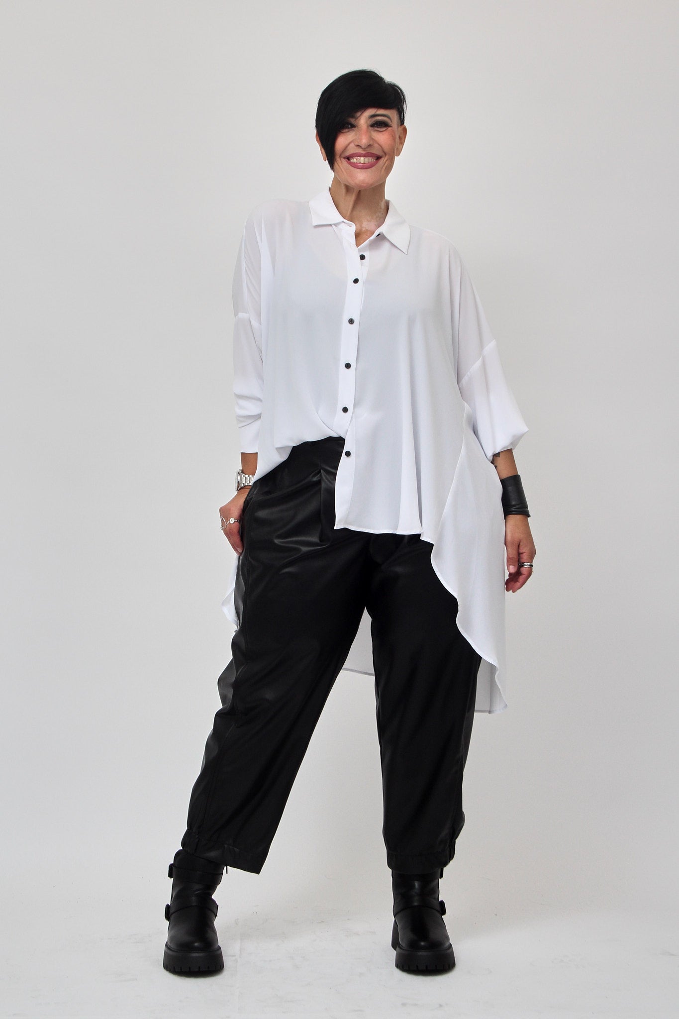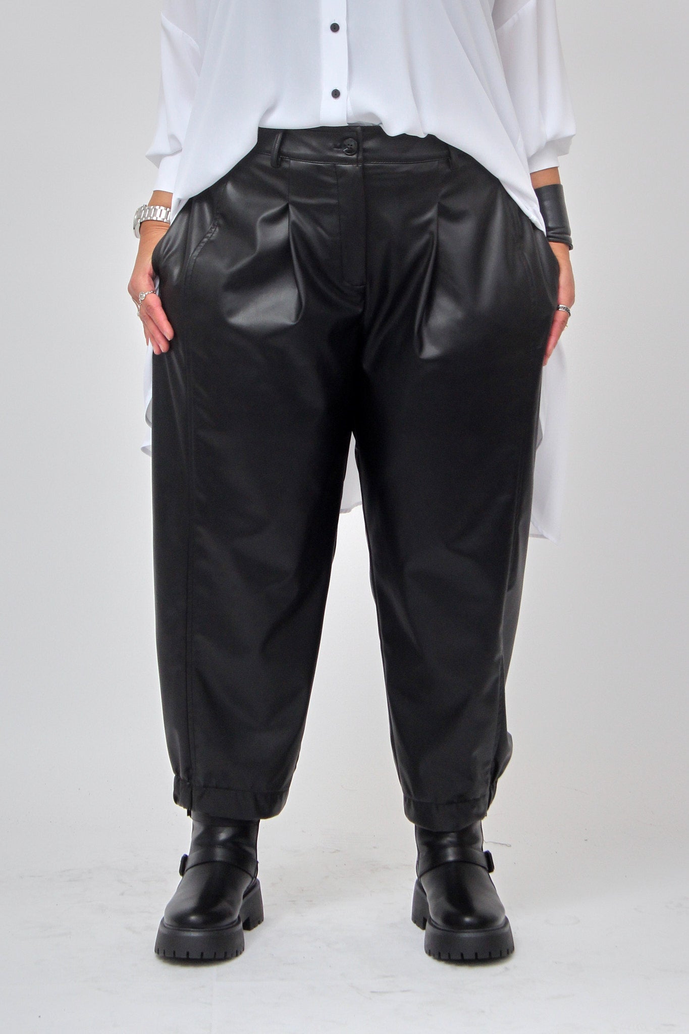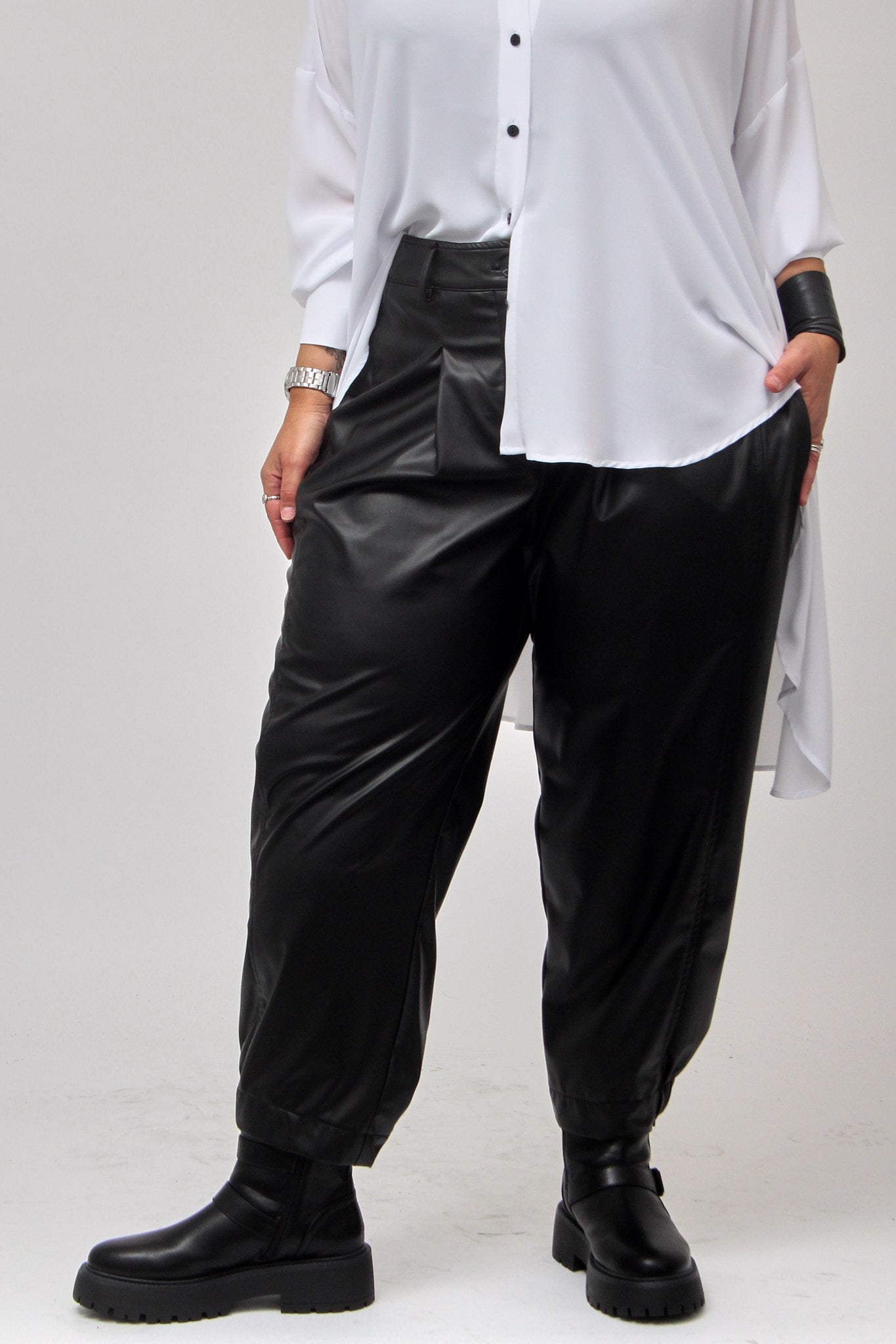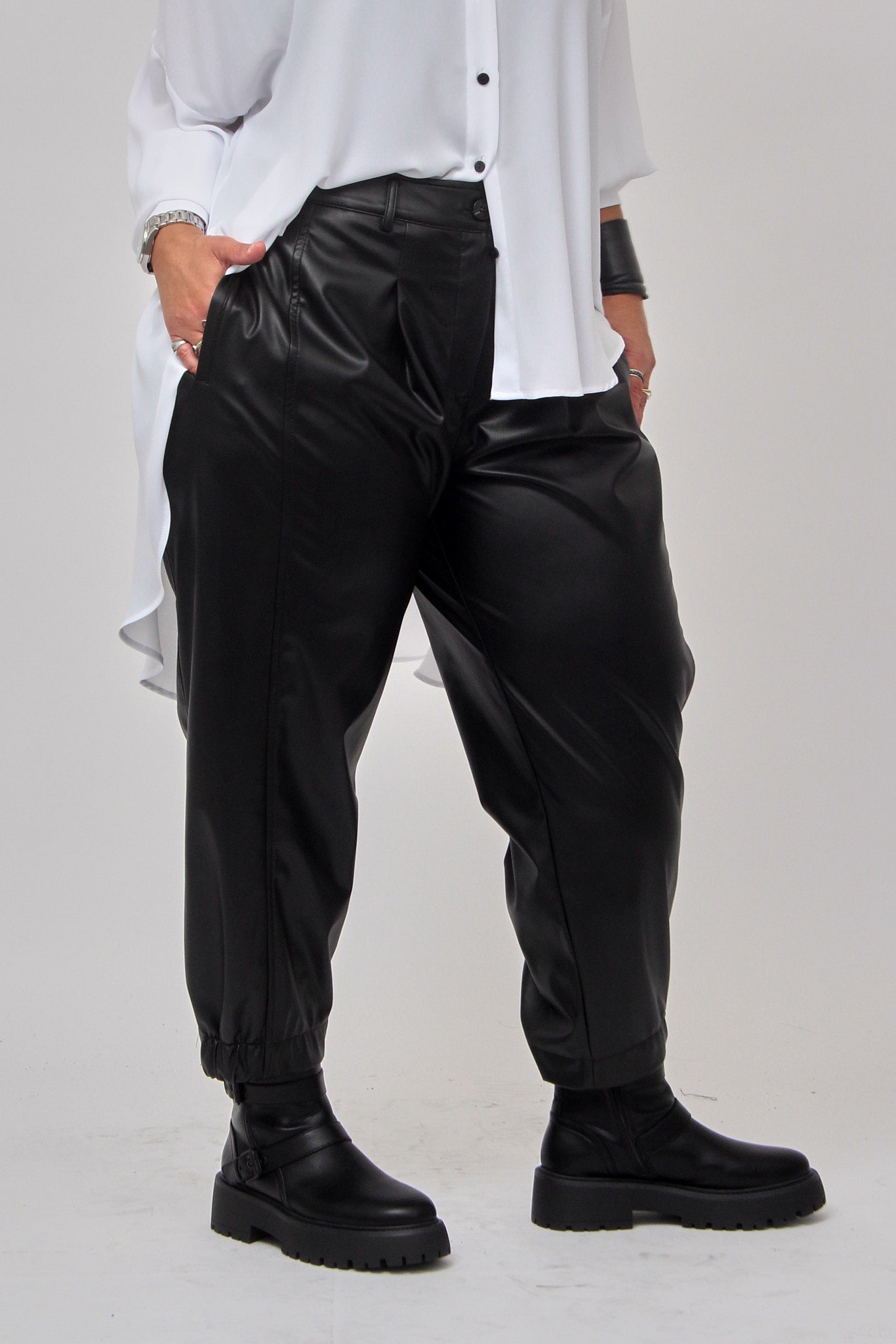 Questi pantaloni modello carota in ecopelle uniscono stile e funzionalità con dettagli sofisticati. Presentano un bottone frontale e un elastico sul retro per garantire comfort e una vestibilità perfetta. L’elastico in fondo alla gamba definisce la silhouette, mentre le pinces frontali aggiungono un tocco di eleganza sartoriale. Ideali per un look deciso e contemporaneo.