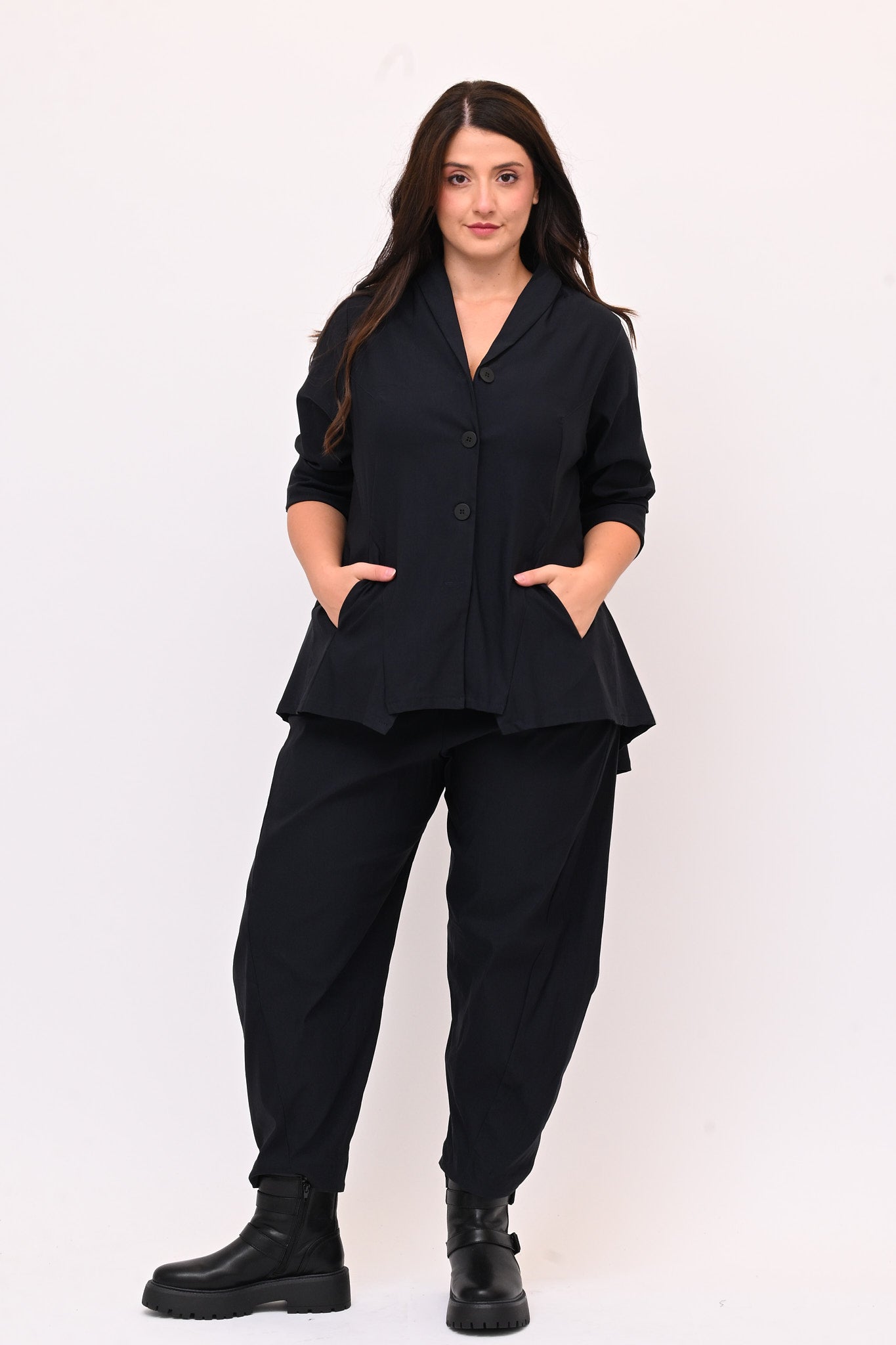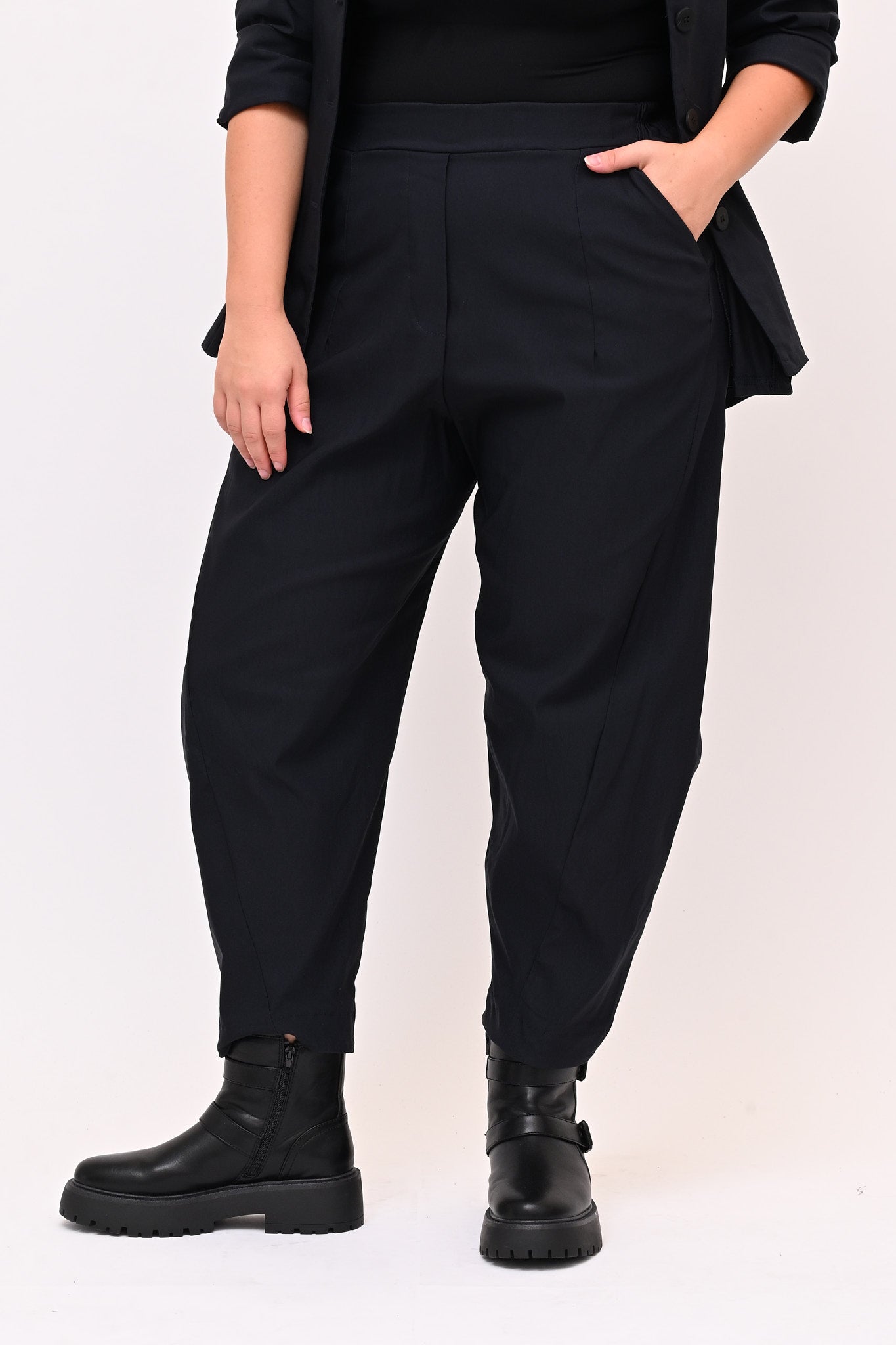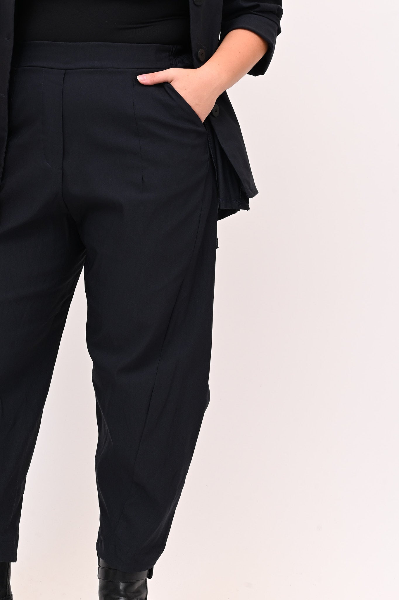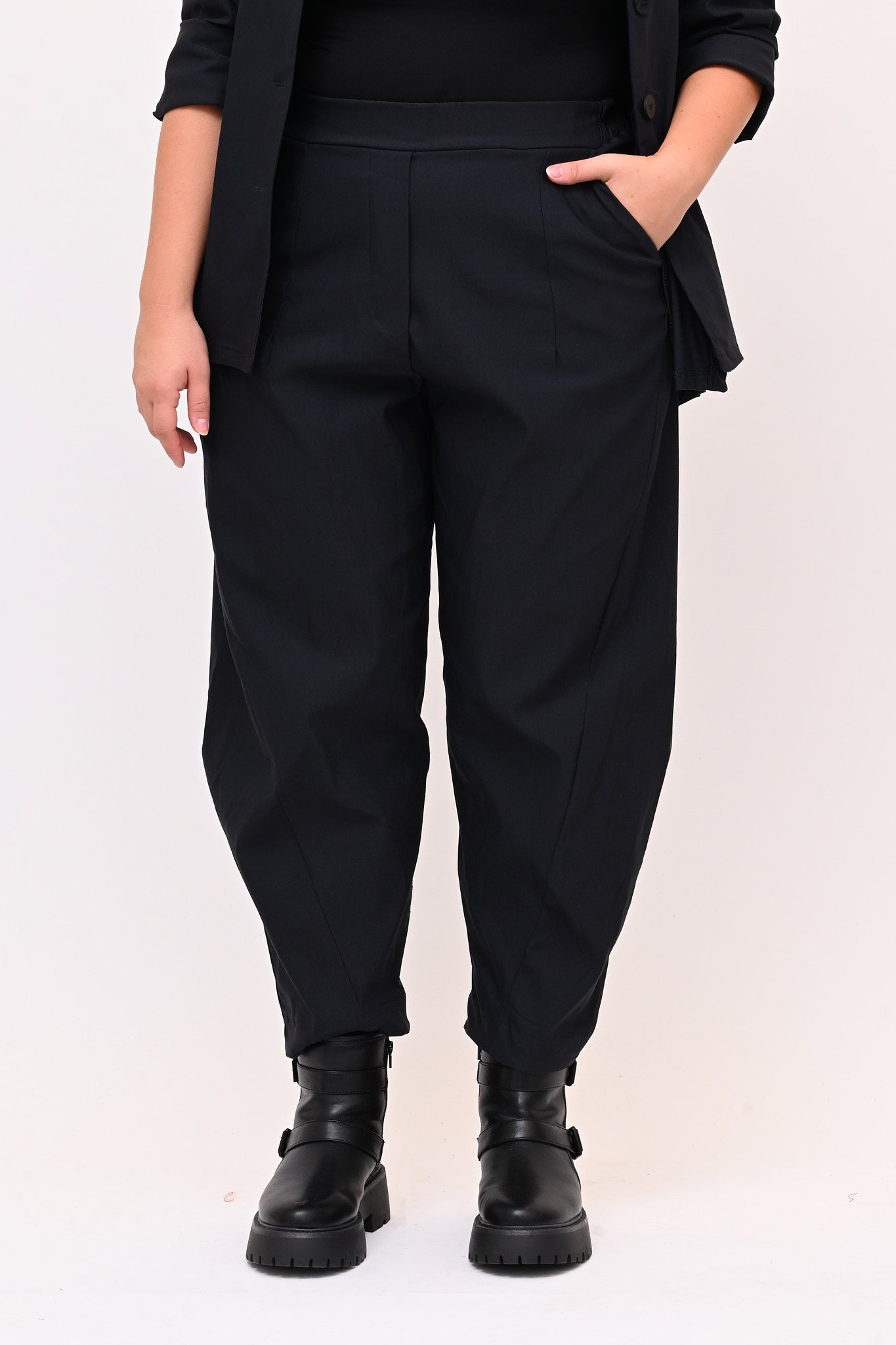 Questo pantalone crop in bengalina elasticizzata unisce comfort e stile. L'elastico in vita e le tasche a filo aggiungono praticità. La gamba larga si restringe sul fondo con giochi di cuciture, creando una linea moderna e distintiva. Ideale per chi cerca un capo versatile e raffinato.