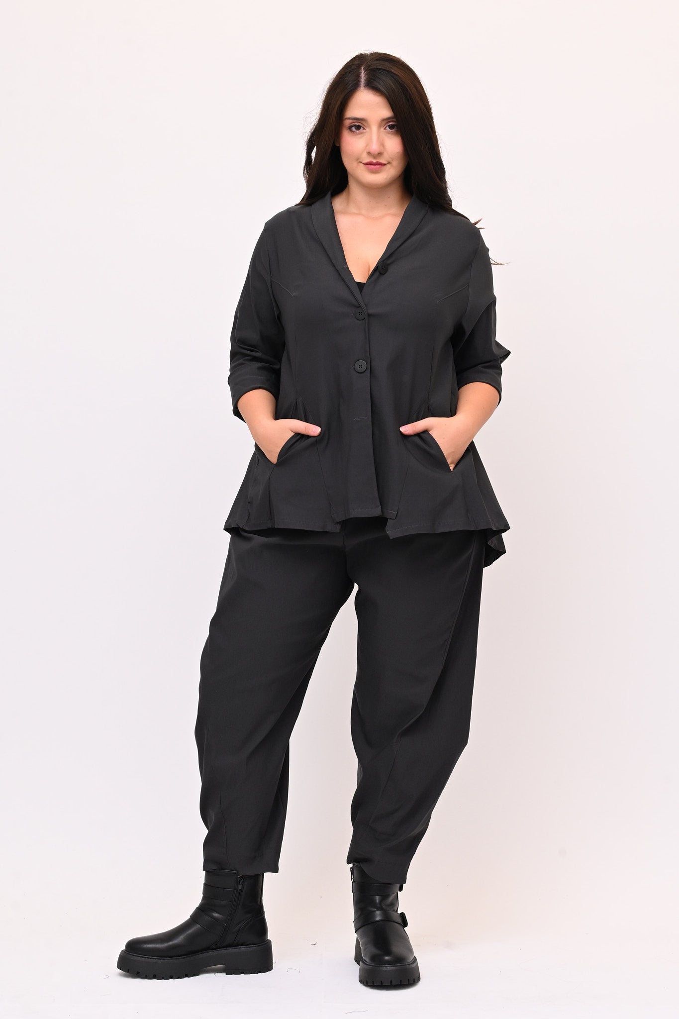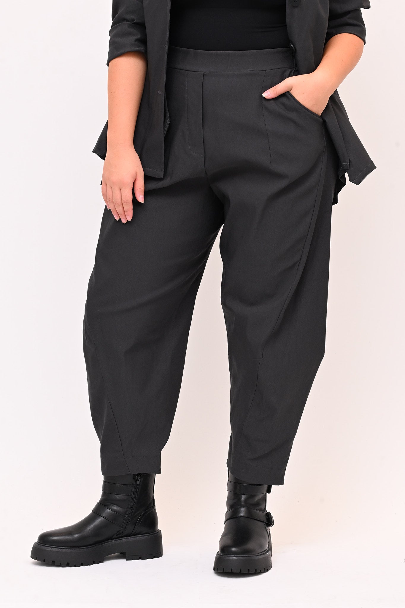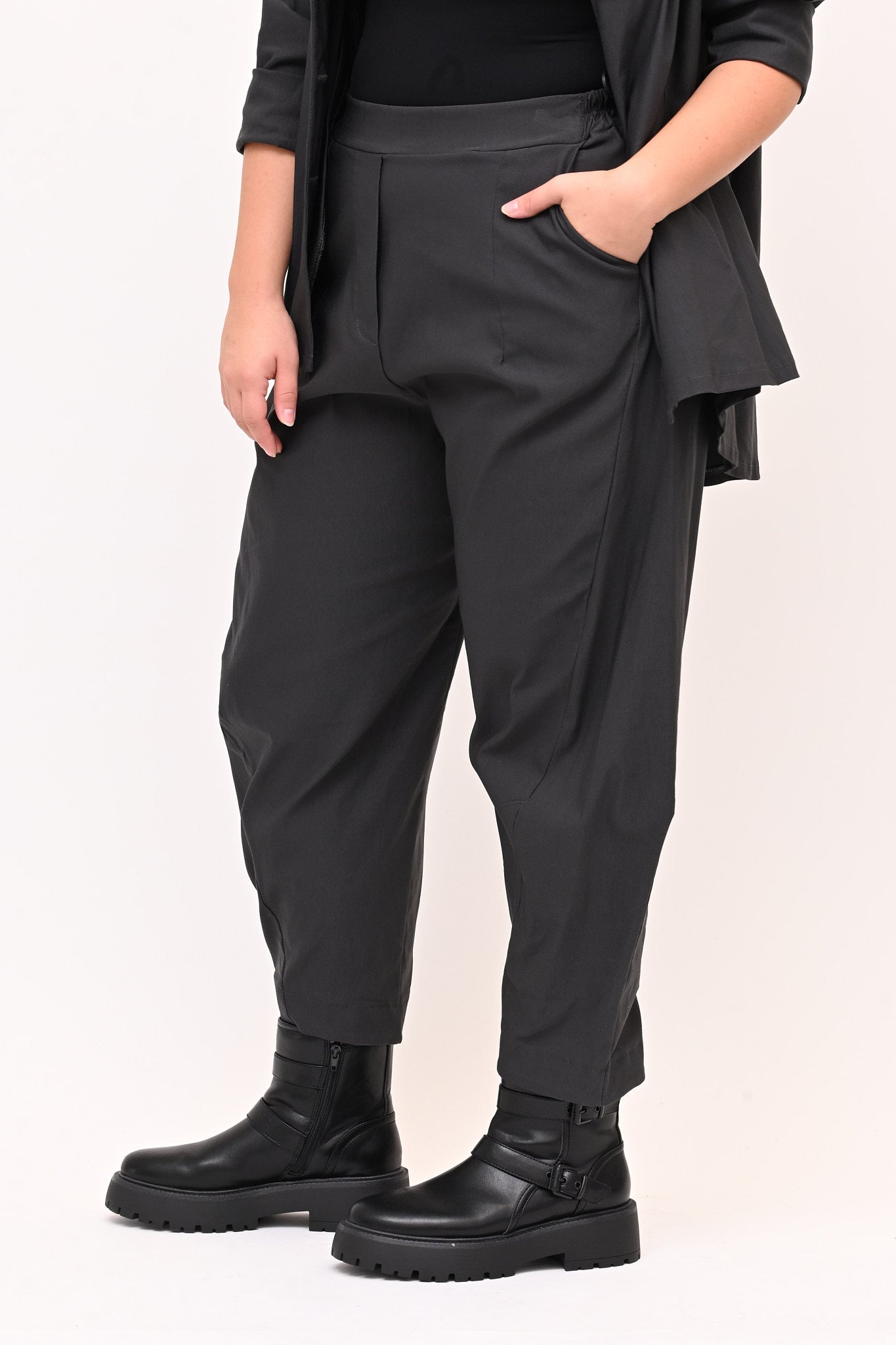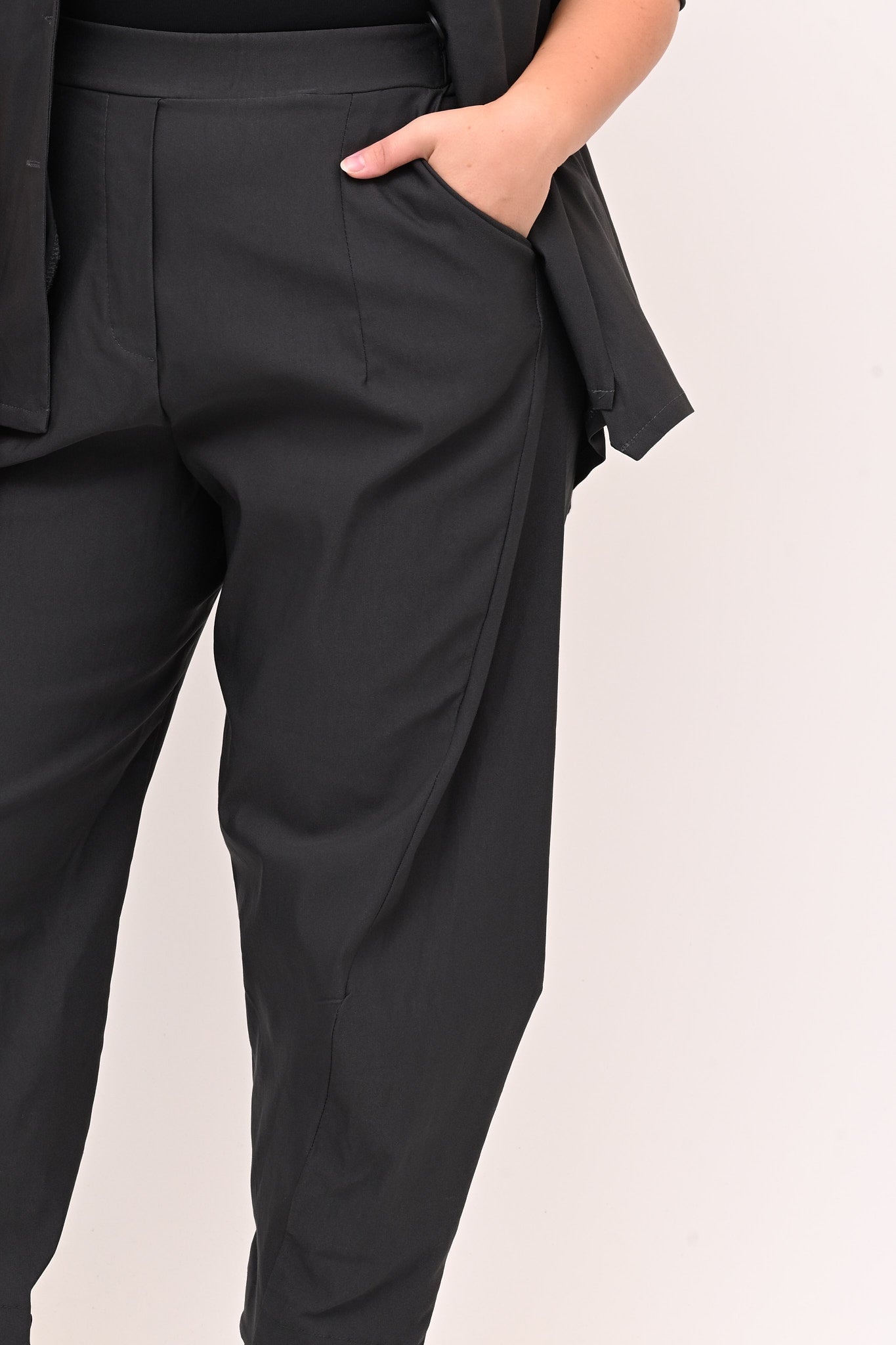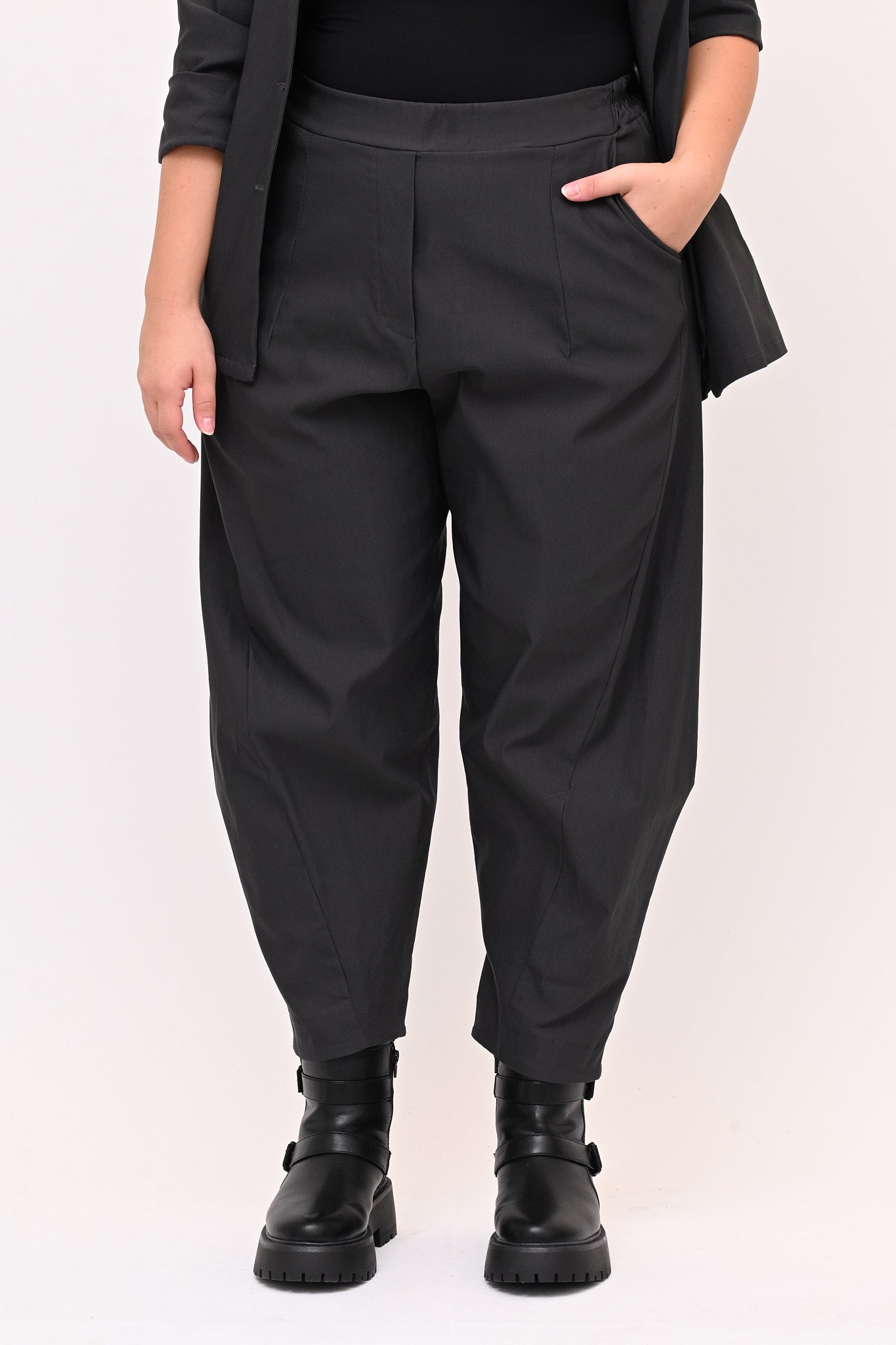 Questo pantalone crop in bengalina elasticizzata unisce comfort e stile. L'elastico in vita e le tasche a filo aggiungono praticità. La gamba larga si restringe sul fondo con giochi di cuciture, creando una linea moderna e distintiva. Ideale per chi cerca un capo versatile e raffinato.
