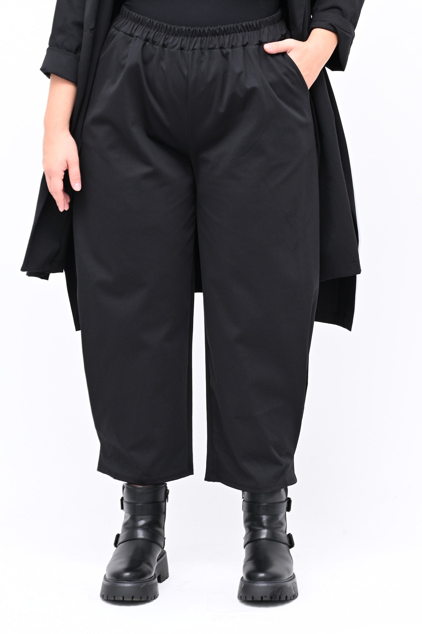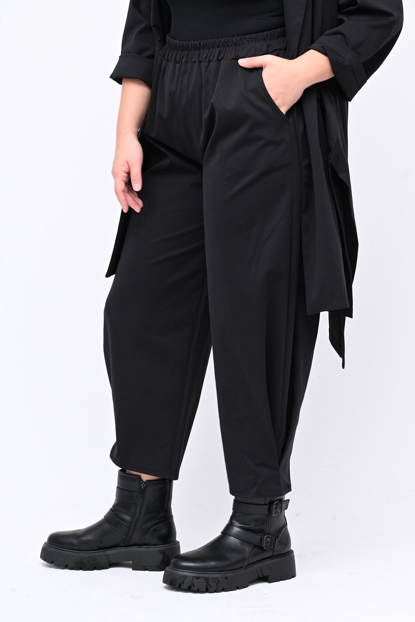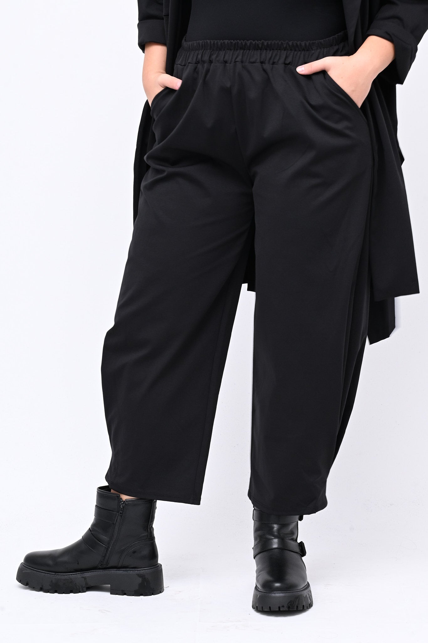 Pantalone modello baggy, con elastico in vita e tasche laterali. Le cuciture sulla caviglia creano un elegante gioco di pinces sulla gamba. Perfetto per un look sporty chic, versatile, pratico e contemporaneo.