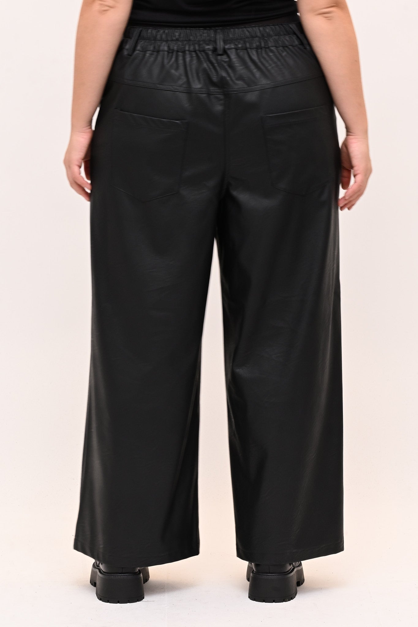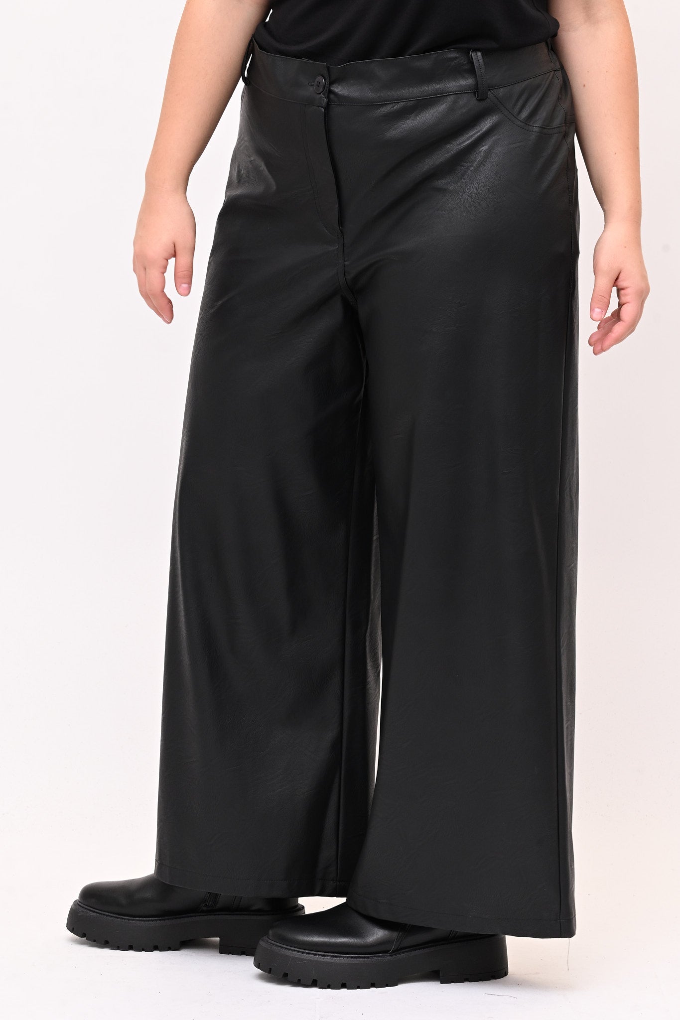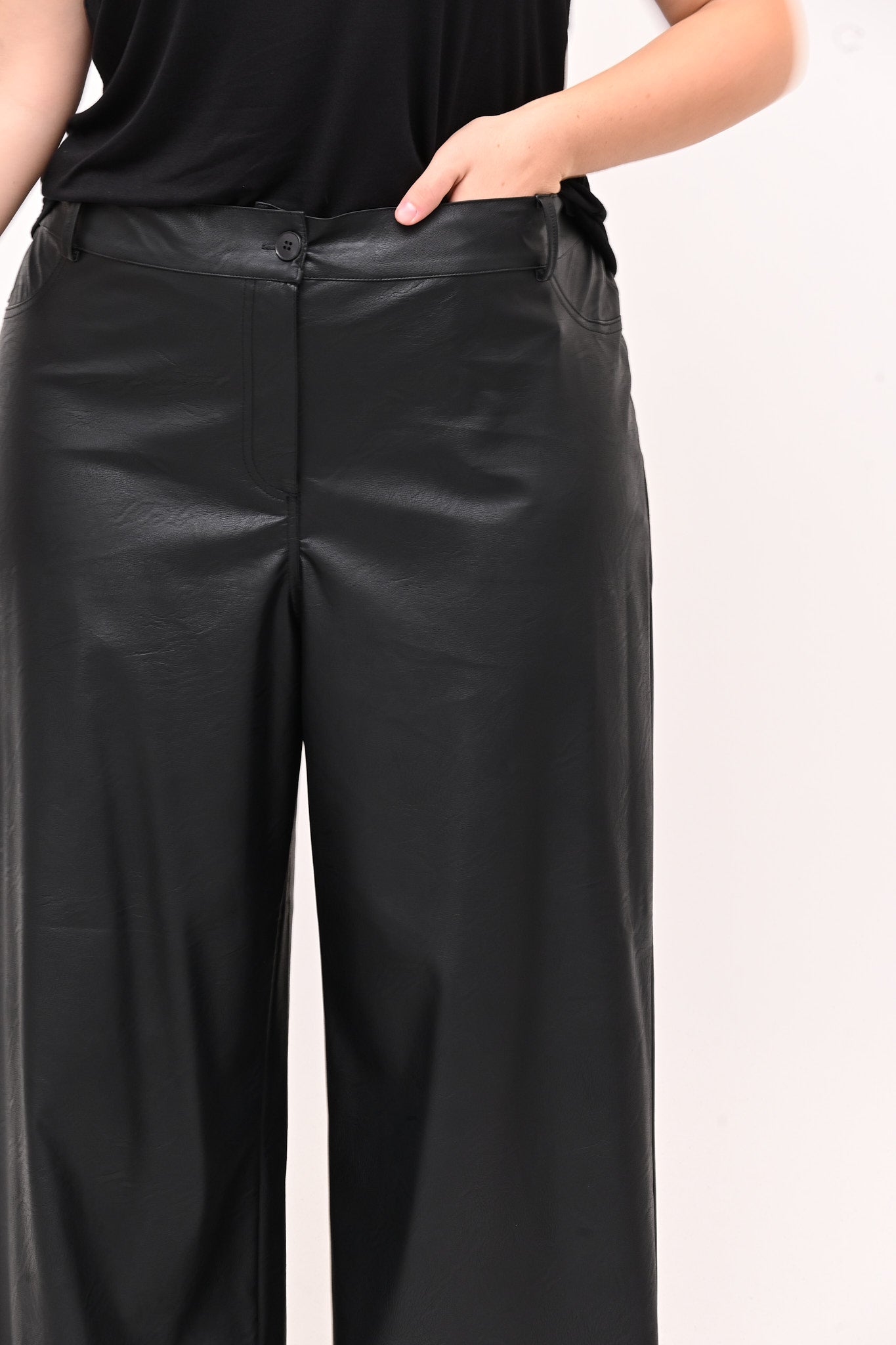 Pantapalazzo in ecopelle, con bottone frontale ed elastico sul retro. Versatili e di tendenza aggiungono un tocco grintoso e femminile a ogni outfit. Un must-have per chi desidera creare look contemporanei con personalità.