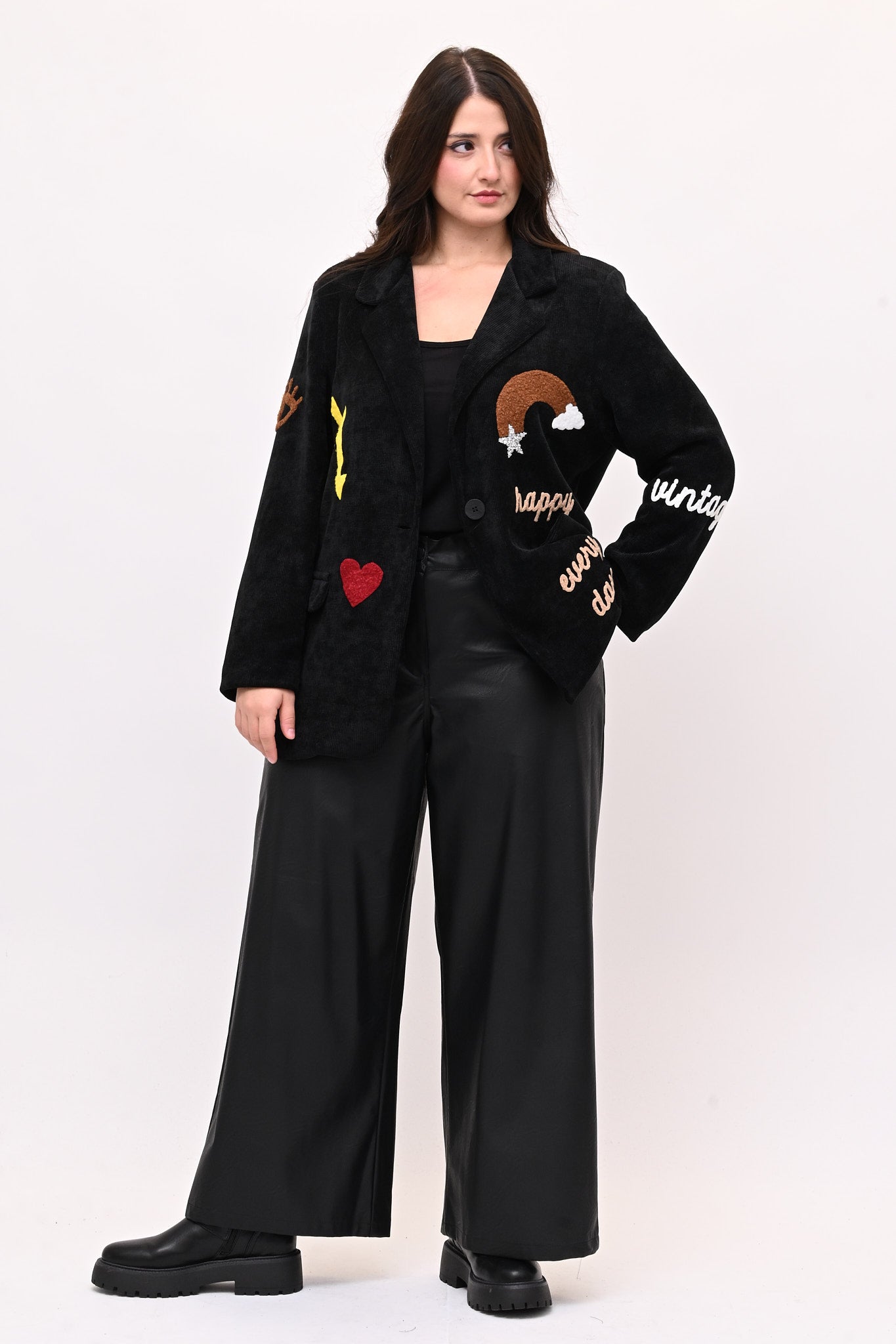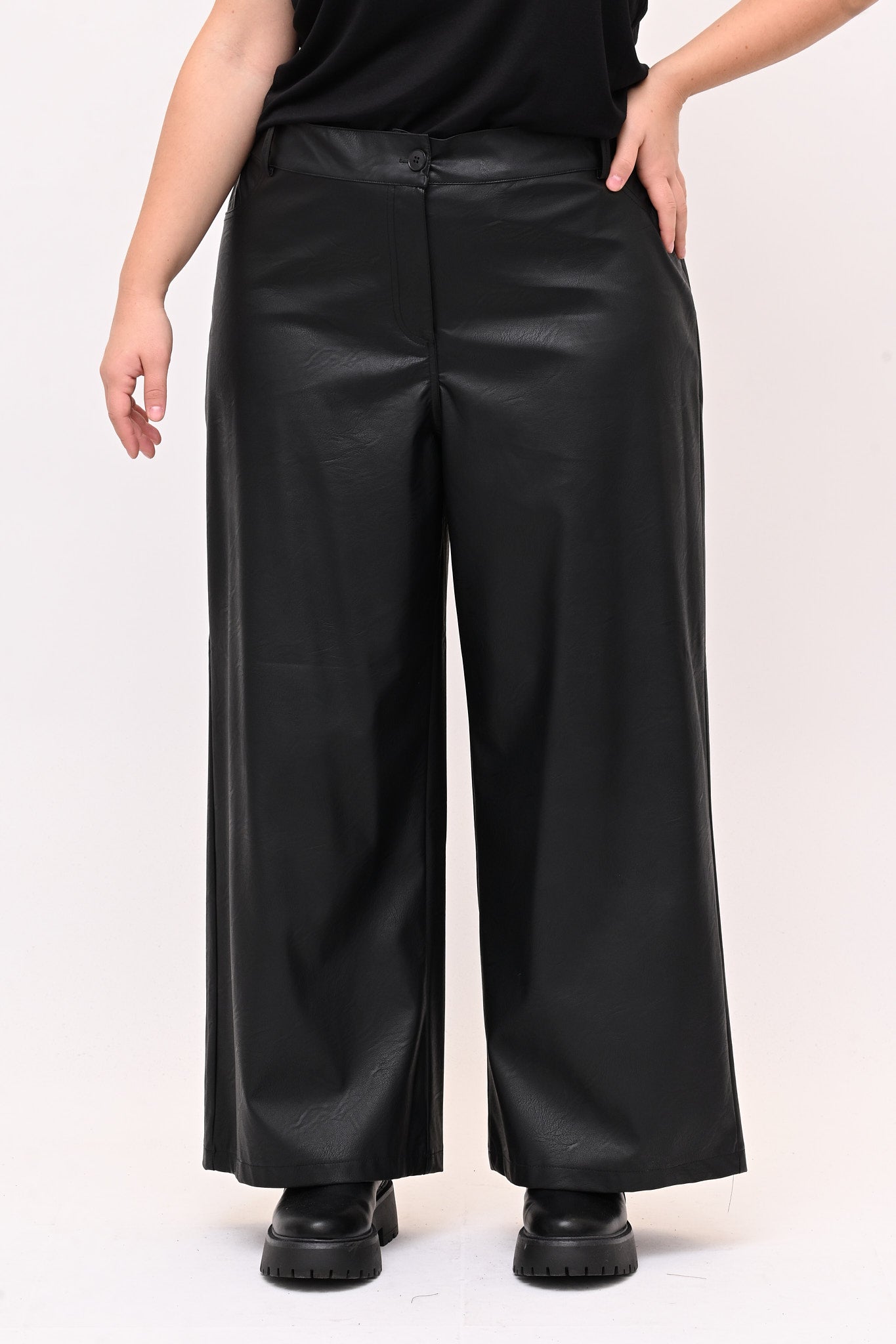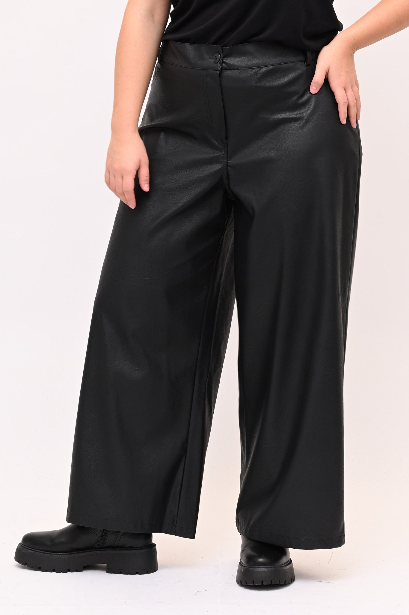 Pantapalazzo in ecopelle, con bottone frontale ed elastico sul retro. Versatili e di tendenza aggiungono un tocco grintoso e femminile a ogni outfit. Un must-have per chi desidera creare look contemporanei con personalità.