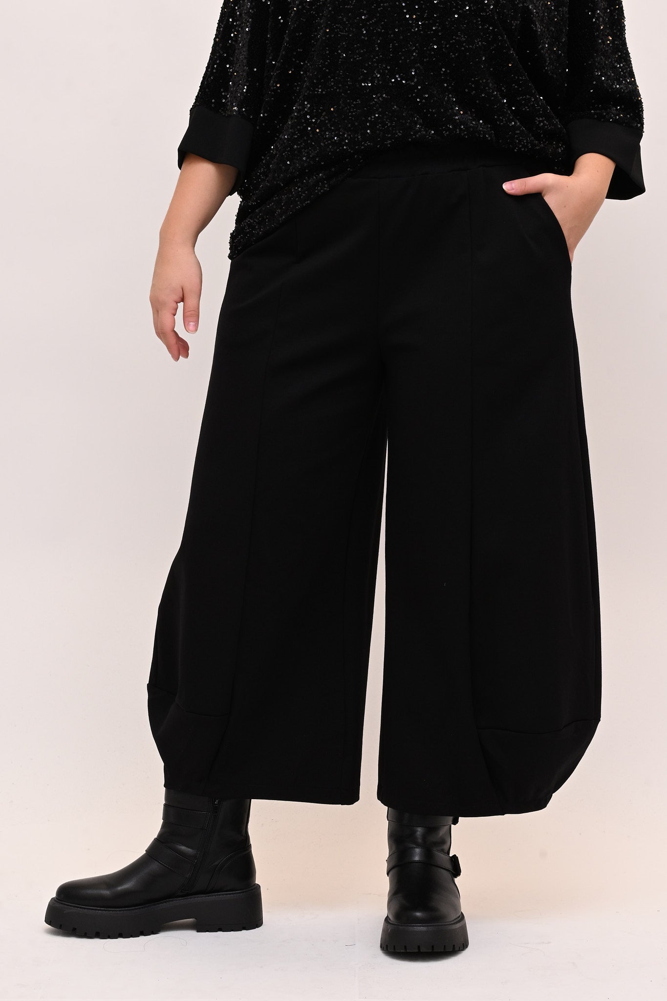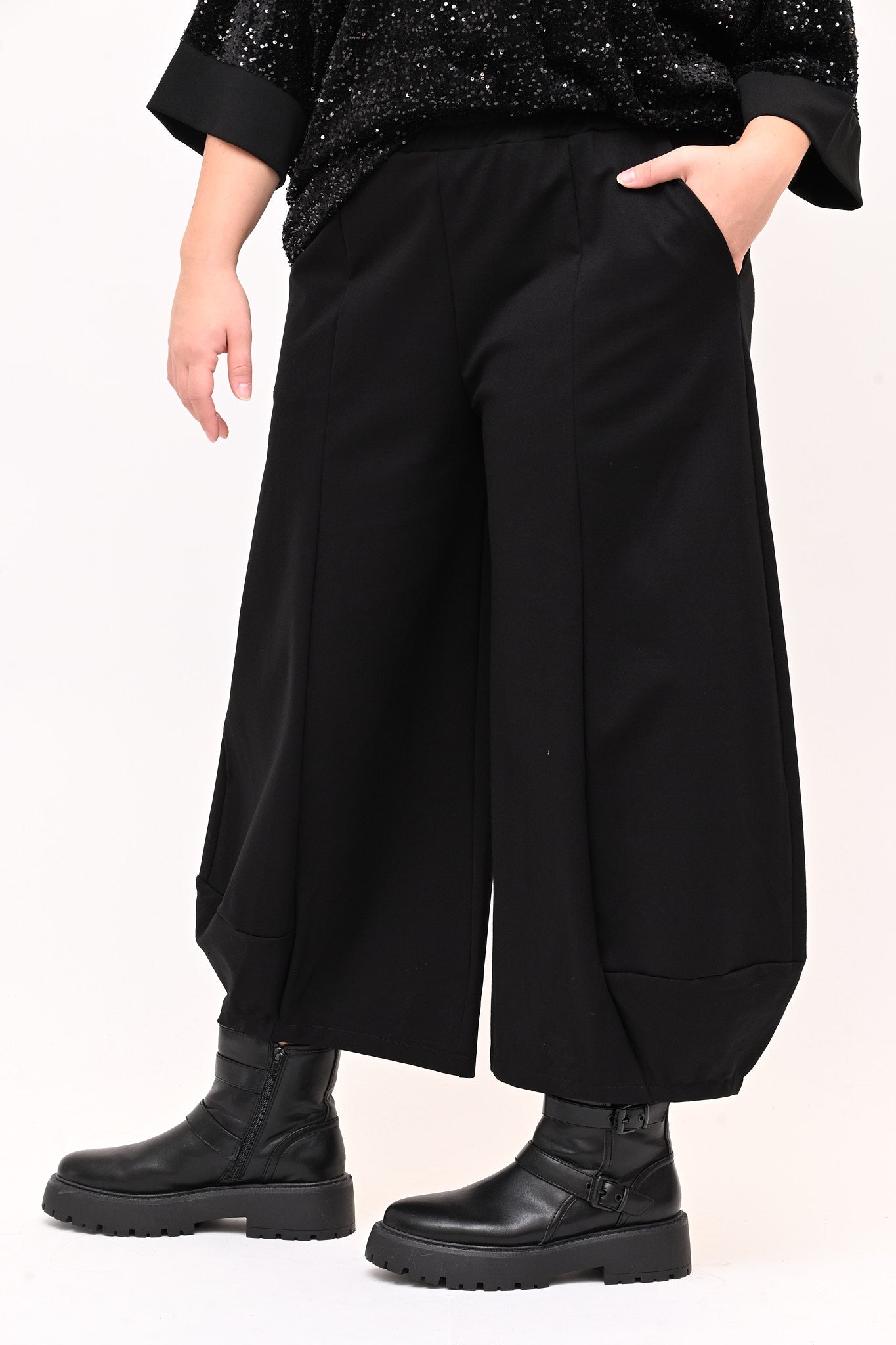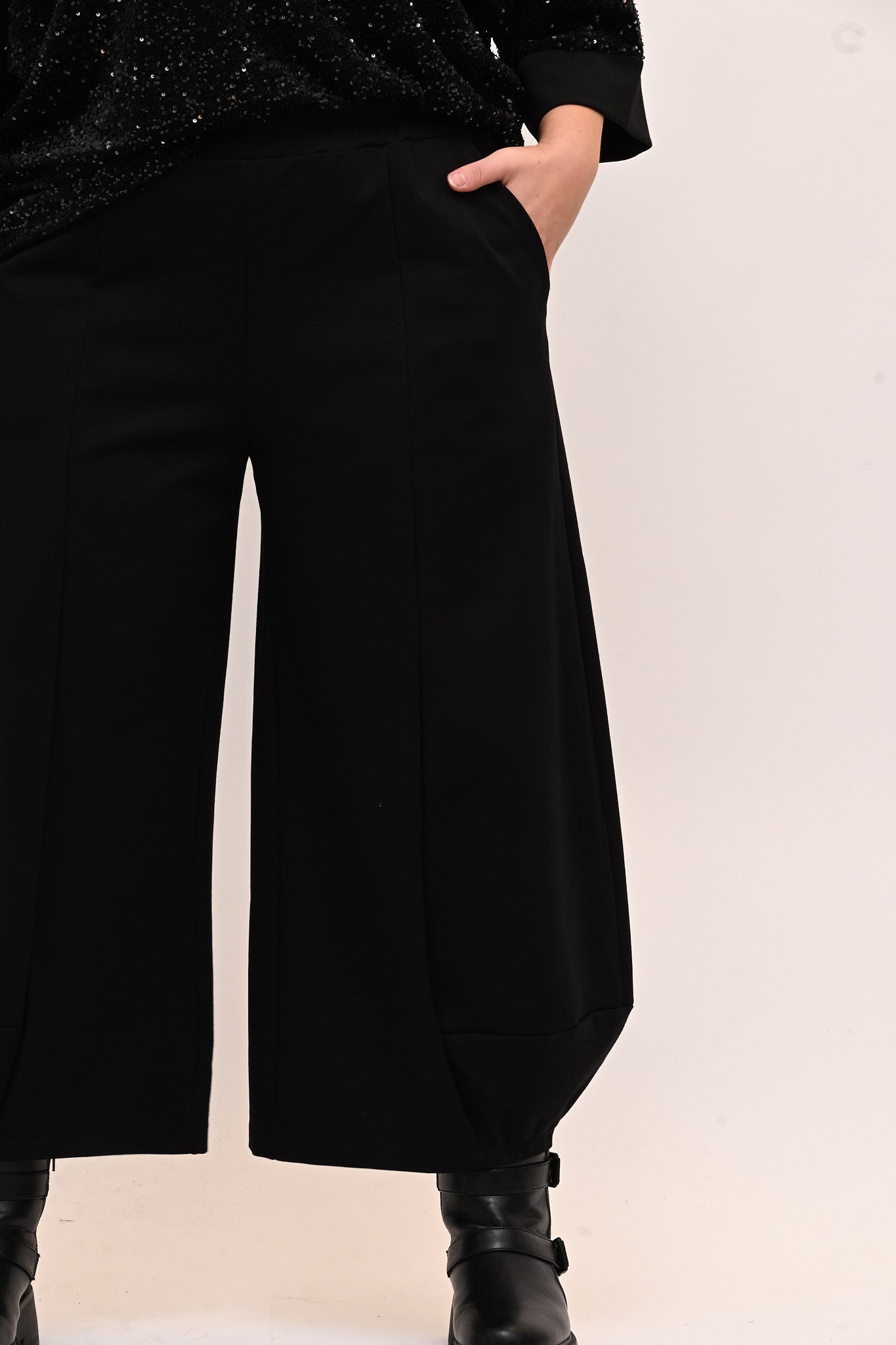 Pantalone crop in punto Milano, con elastico in vita e tasche laterali, caratterizzato da giochi di cuciture che aggiungono un tocco originale. Un modello basico ma dallo stile alternativo, perfetto per chi cerca comfort e personalità in ogni occasione.