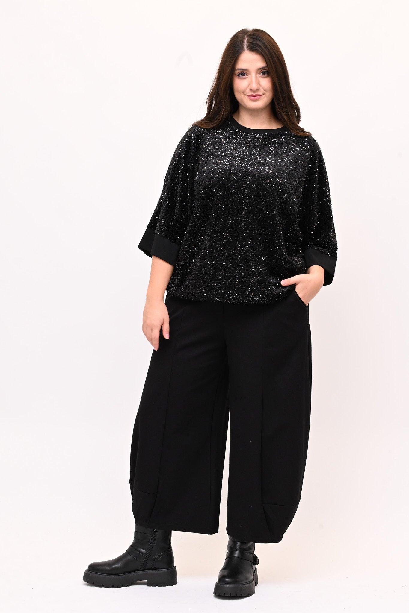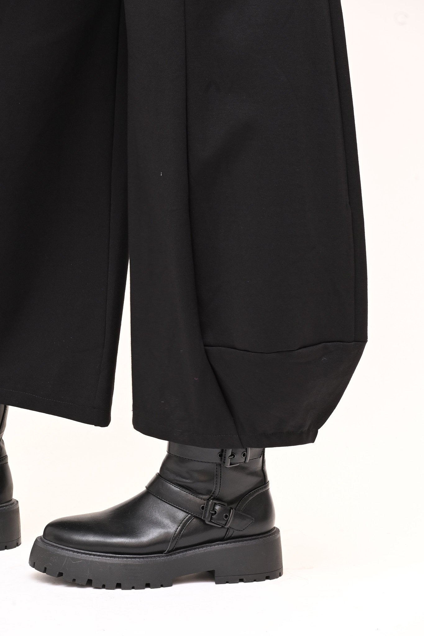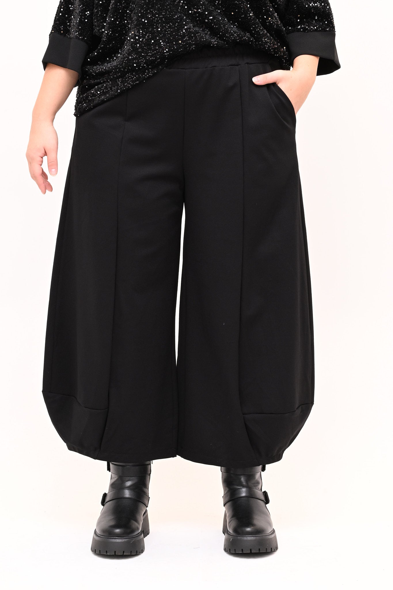 Pantalone crop in punto Milano, con elastico in vita e tasche laterali, caratterizzato da giochi di cuciture che aggiungono un tocco originale. Un modello basico ma dallo stile alternativo, perfetto per chi cerca comfort e personalità in ogni occasione.