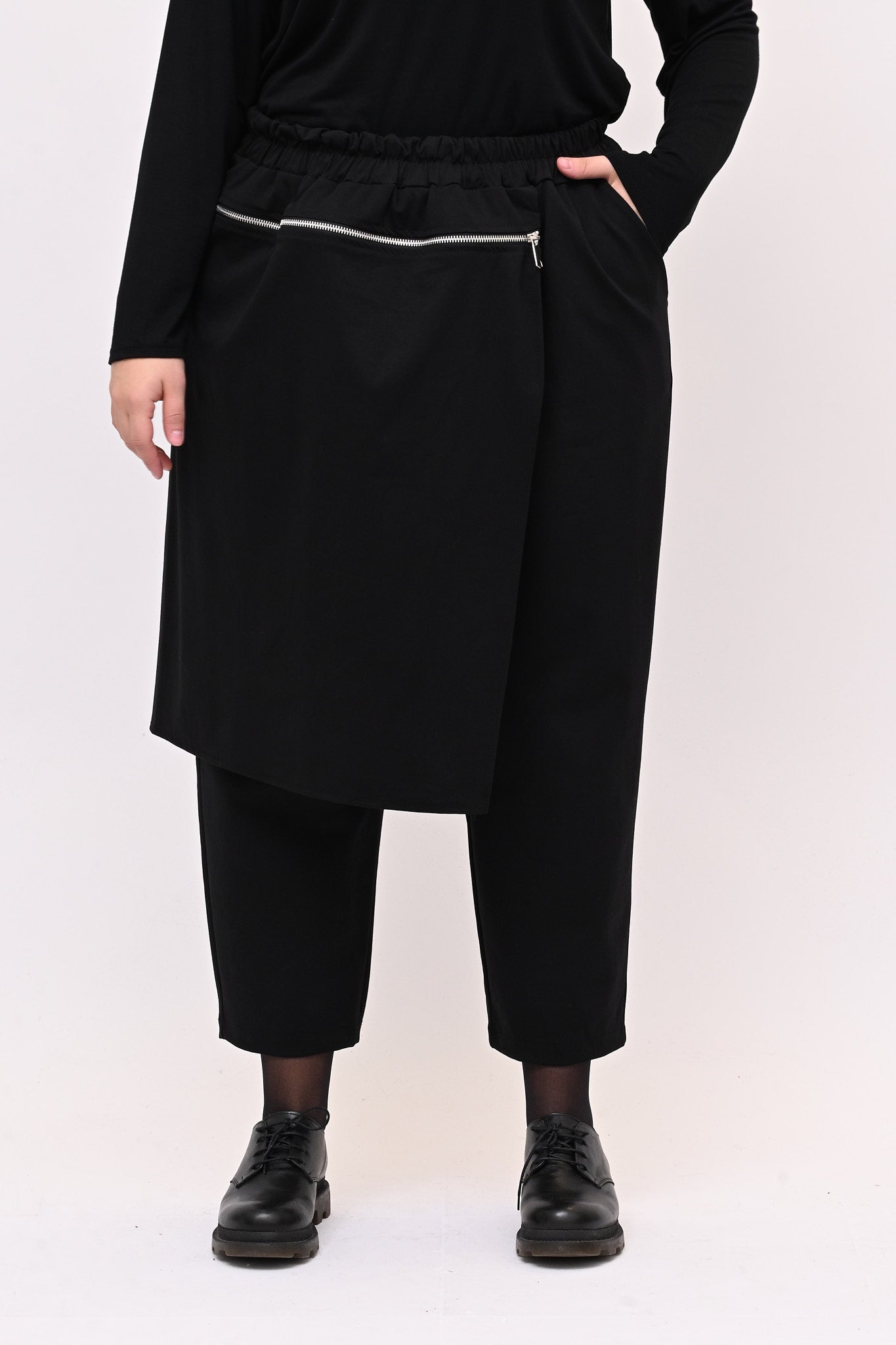 Pantalone modello buggy con elastico in vita e tasche. Il dettaglio distintivo è il gonnellino attaccato con zip, facilmente removibile, per trasformare il capo in base all’occasione. Ideale per chi cerca un look grintoso e dinamico senza rinunciare al comfort.