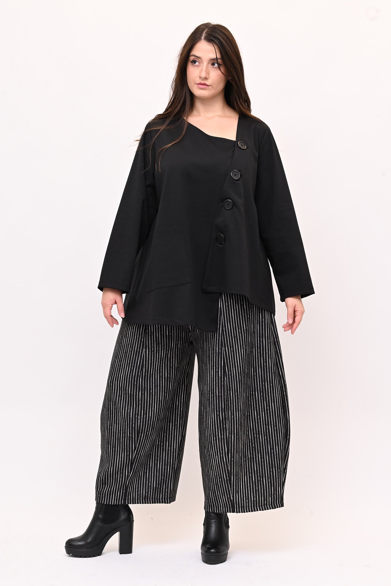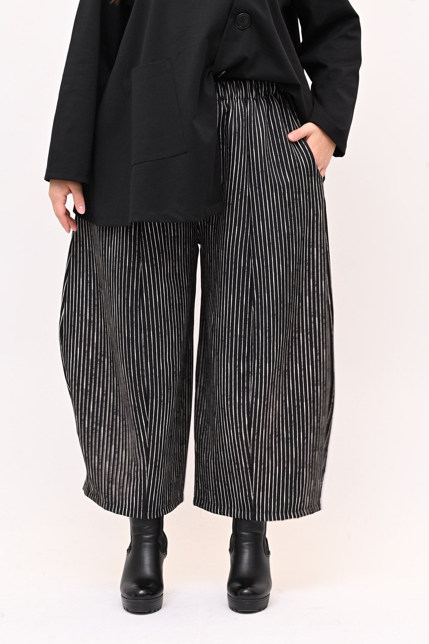 Pantalone modello crop, gessato, con elastico in vita e tasche laterali. La vestibilità è comoda e pratica. Ideale per un look raffinato e moderno.