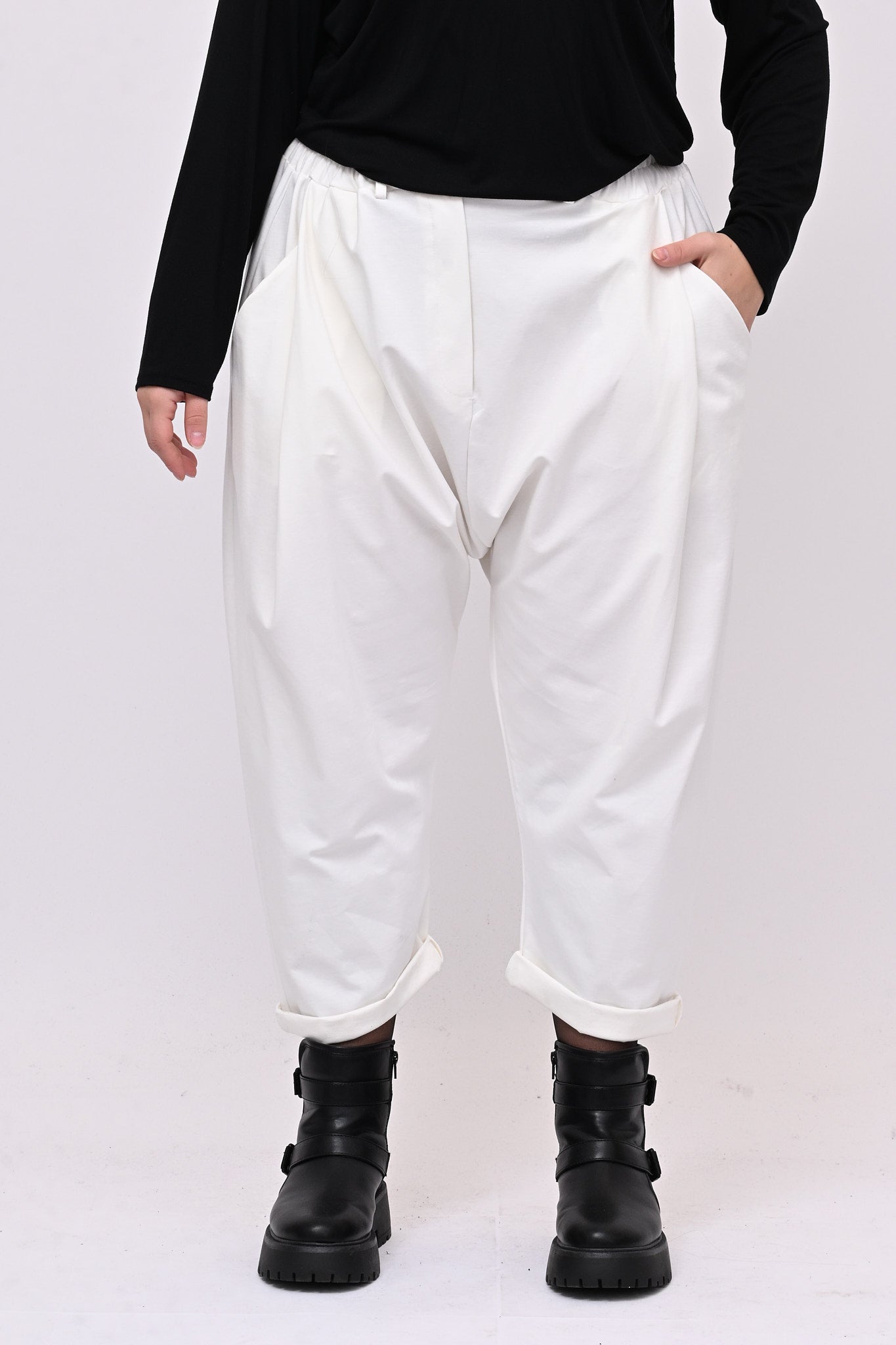 Pantalone in punto Roma, con cavallo basso, elastico in vita, tasche laterali e pinces. La vestibilità rilassata e moderna lo rende ideale per chi ricerca uno stile casual dal taglio contemporaneo.