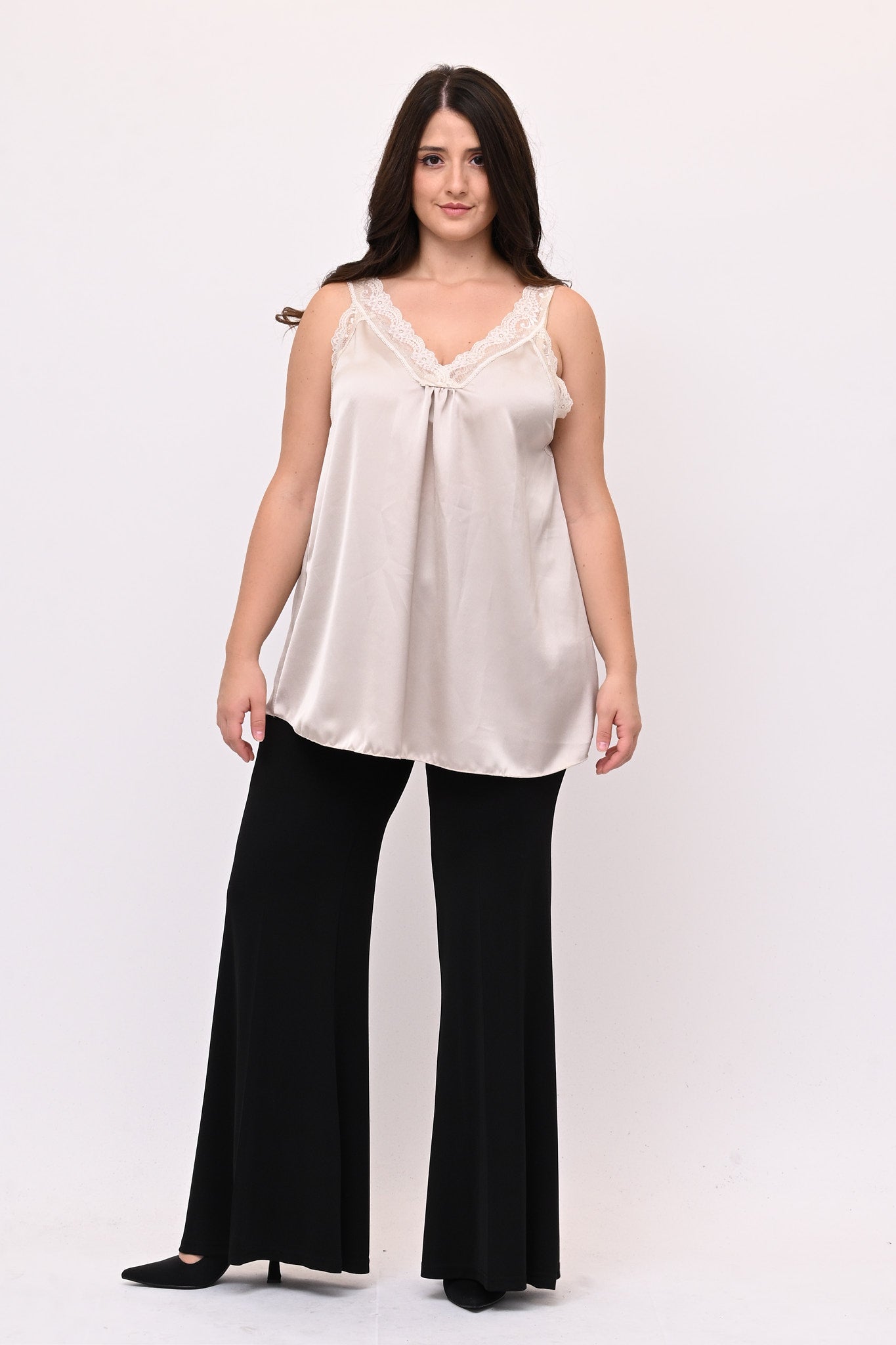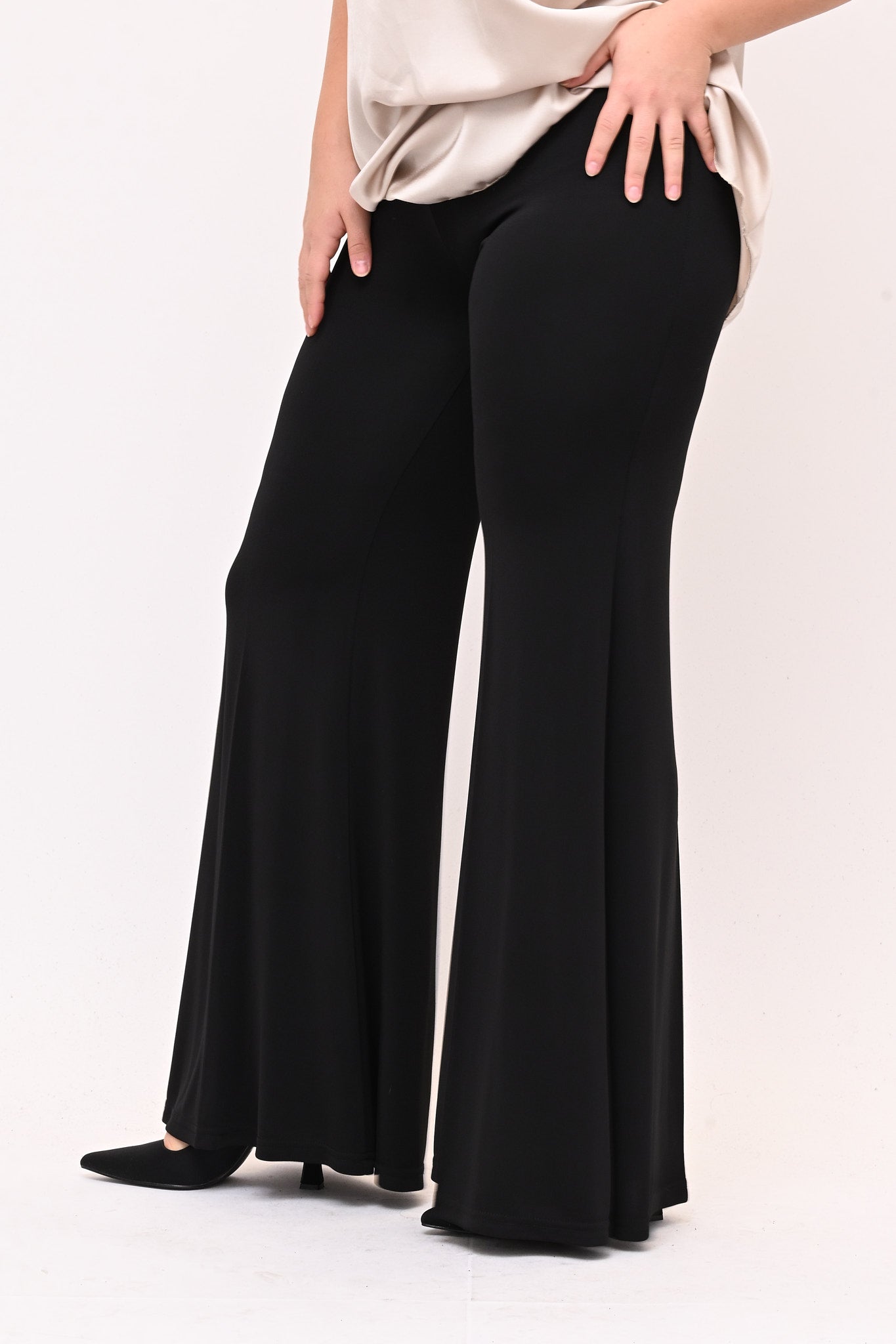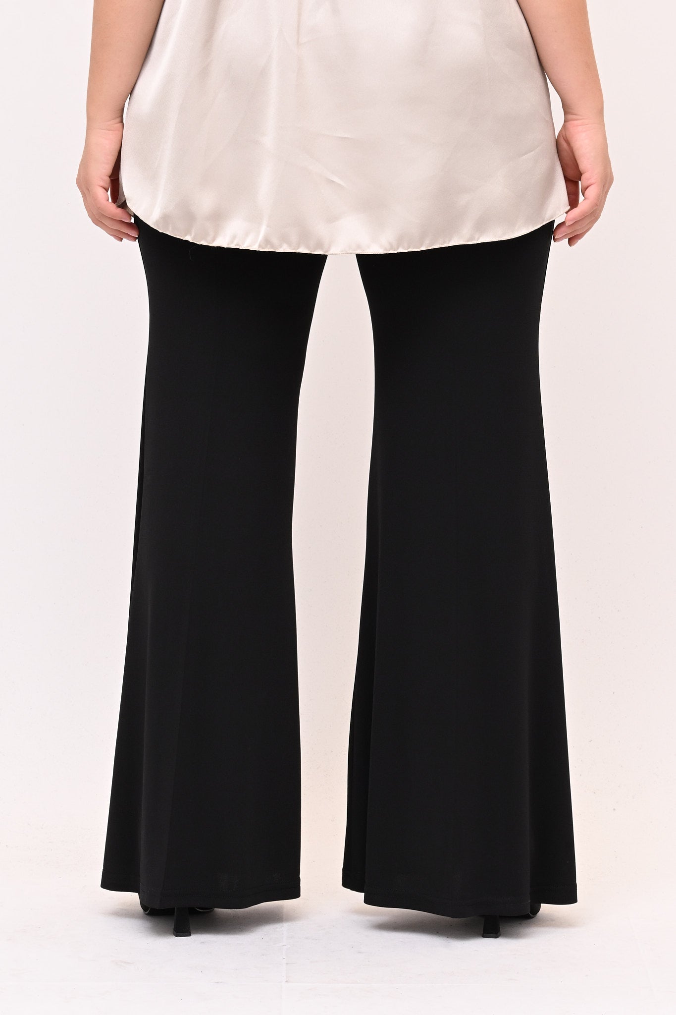 Pantalone a zampa in jersey, con elastico in vita che assicura una vestibilità e comfort. La linea pulita e femminile valorizza la silhouette con una forma raffinata e moderna. Perfetto per chi cerca un capo versatile e sofisticato, ideale da indossare sia in occasioni formali che in contesti più casual.