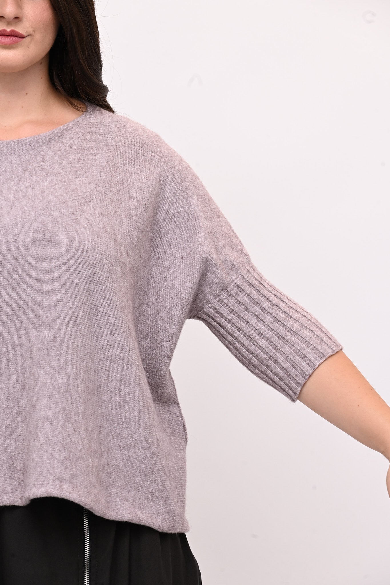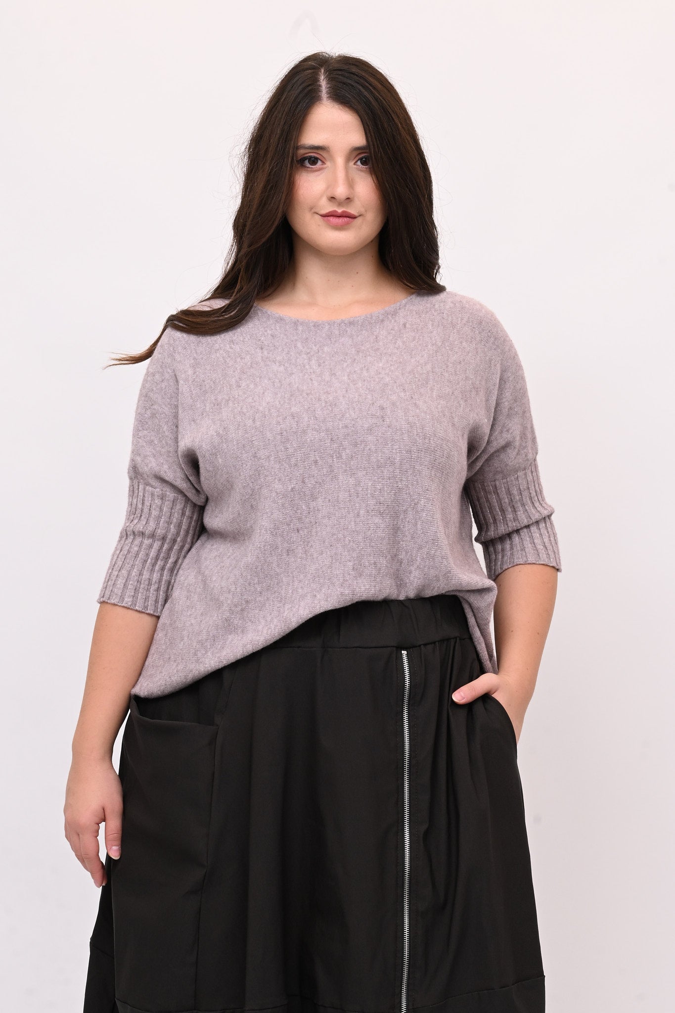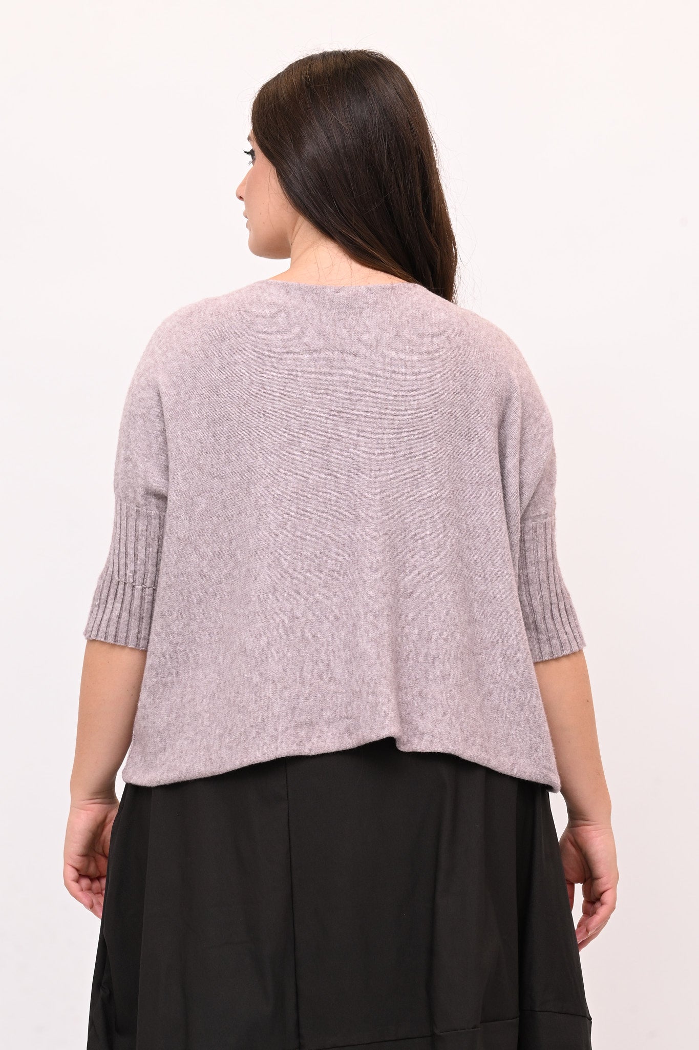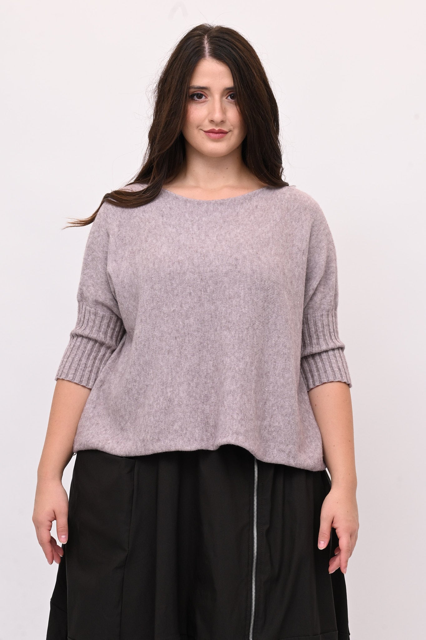 Pull in calda viscosa, modello a scatoletta e maniche 3/4 con coste. Caldo, versatile e comodo, è perfetto per ogni occasione. Ideale per chi cerca equilibrio tra comfort e stile.