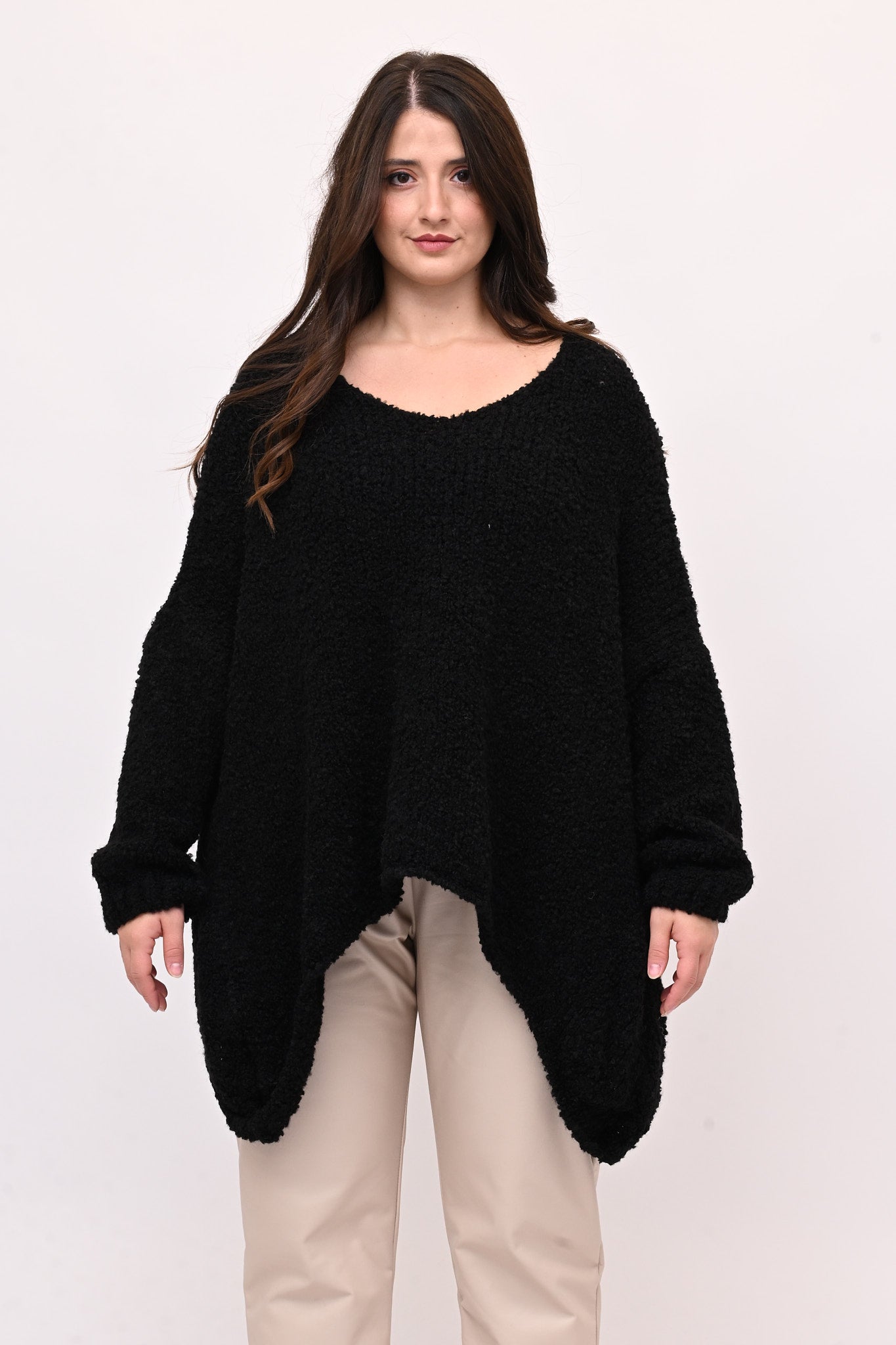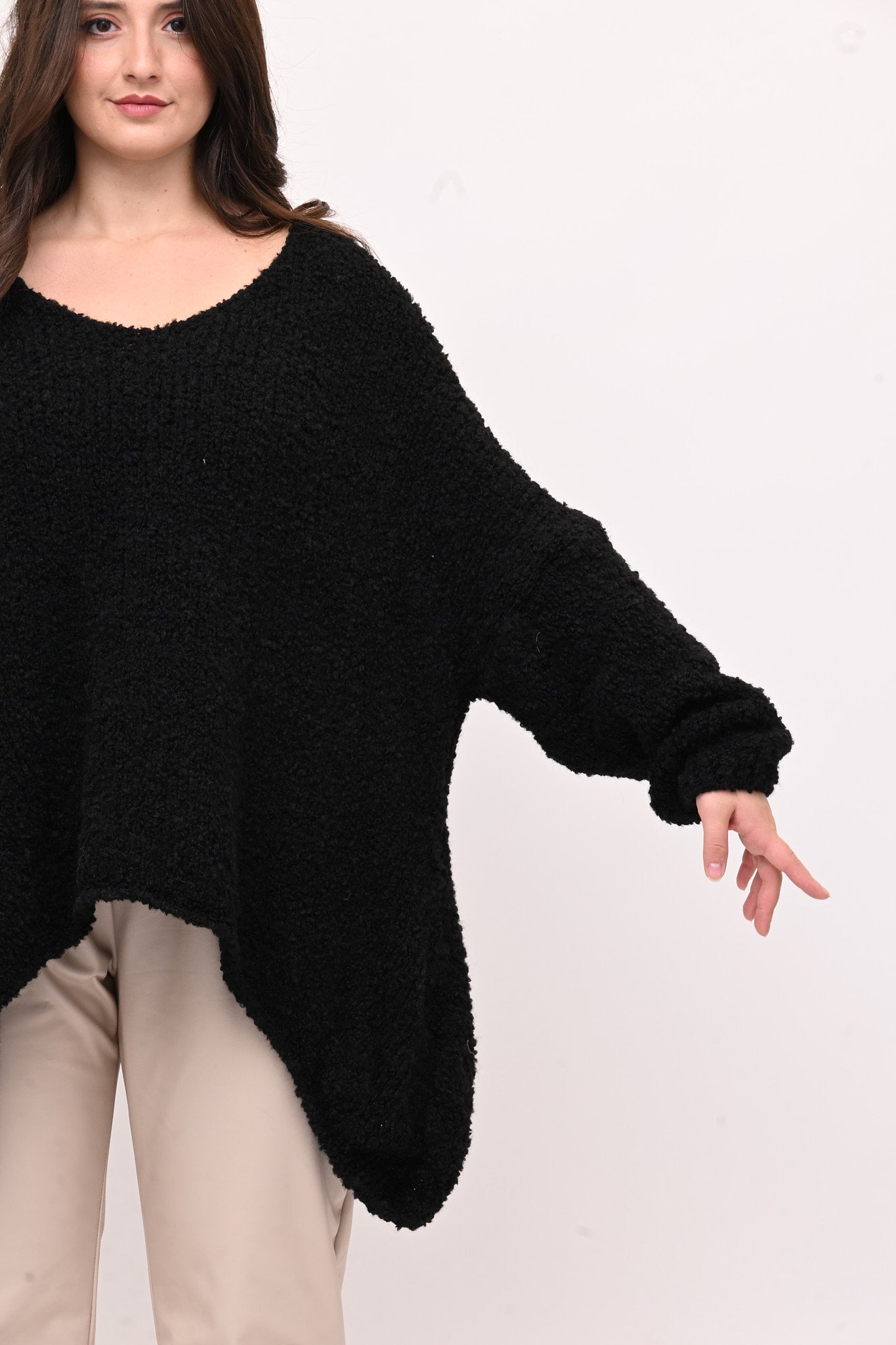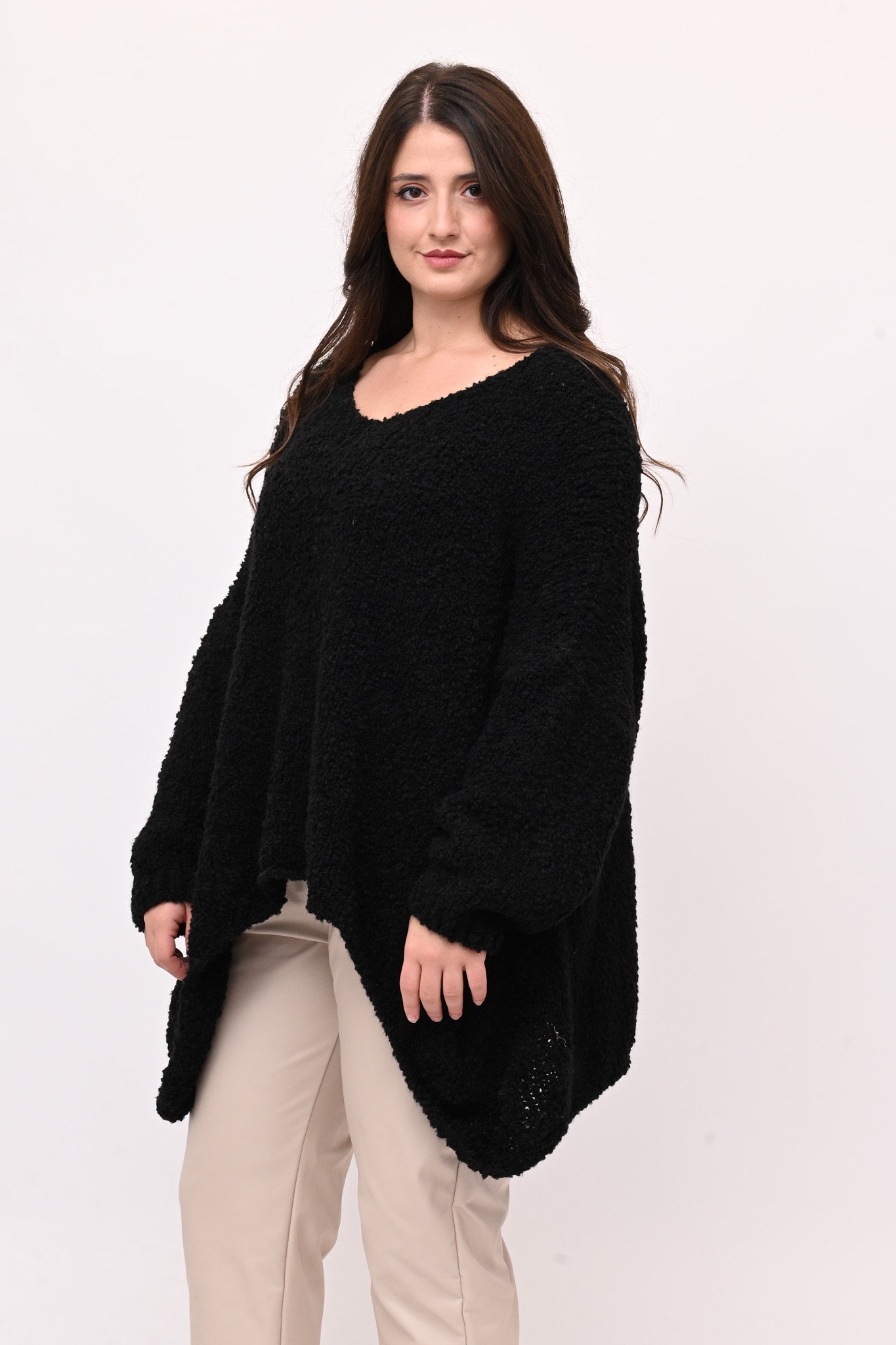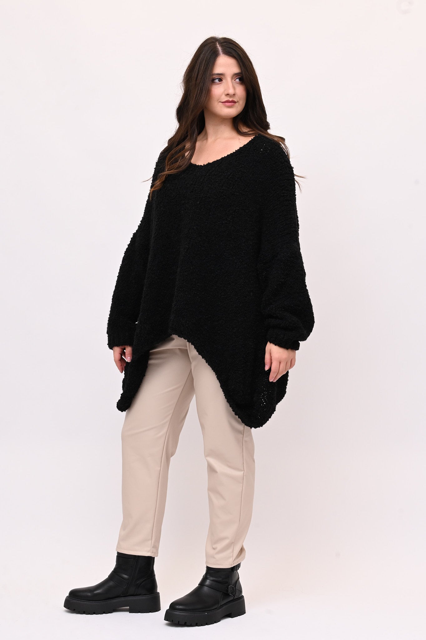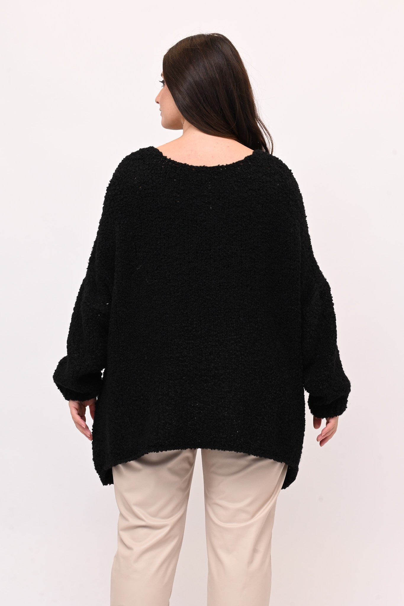 Maxipull bouclè, con scollo a V e punte laterali. La vestibilità è over e il tessuto è caldo e morbido. Combina stile e comfort ed è ideale per outfit femminili e contemporanei.