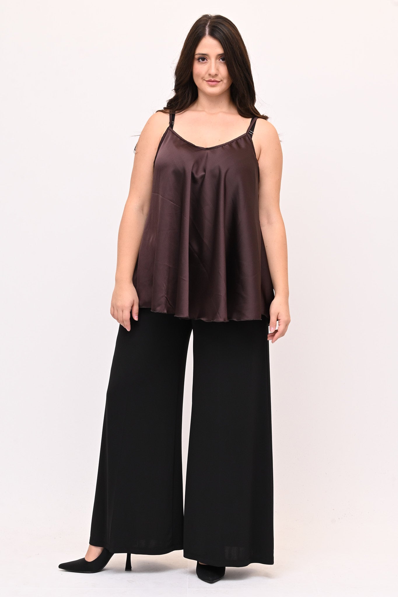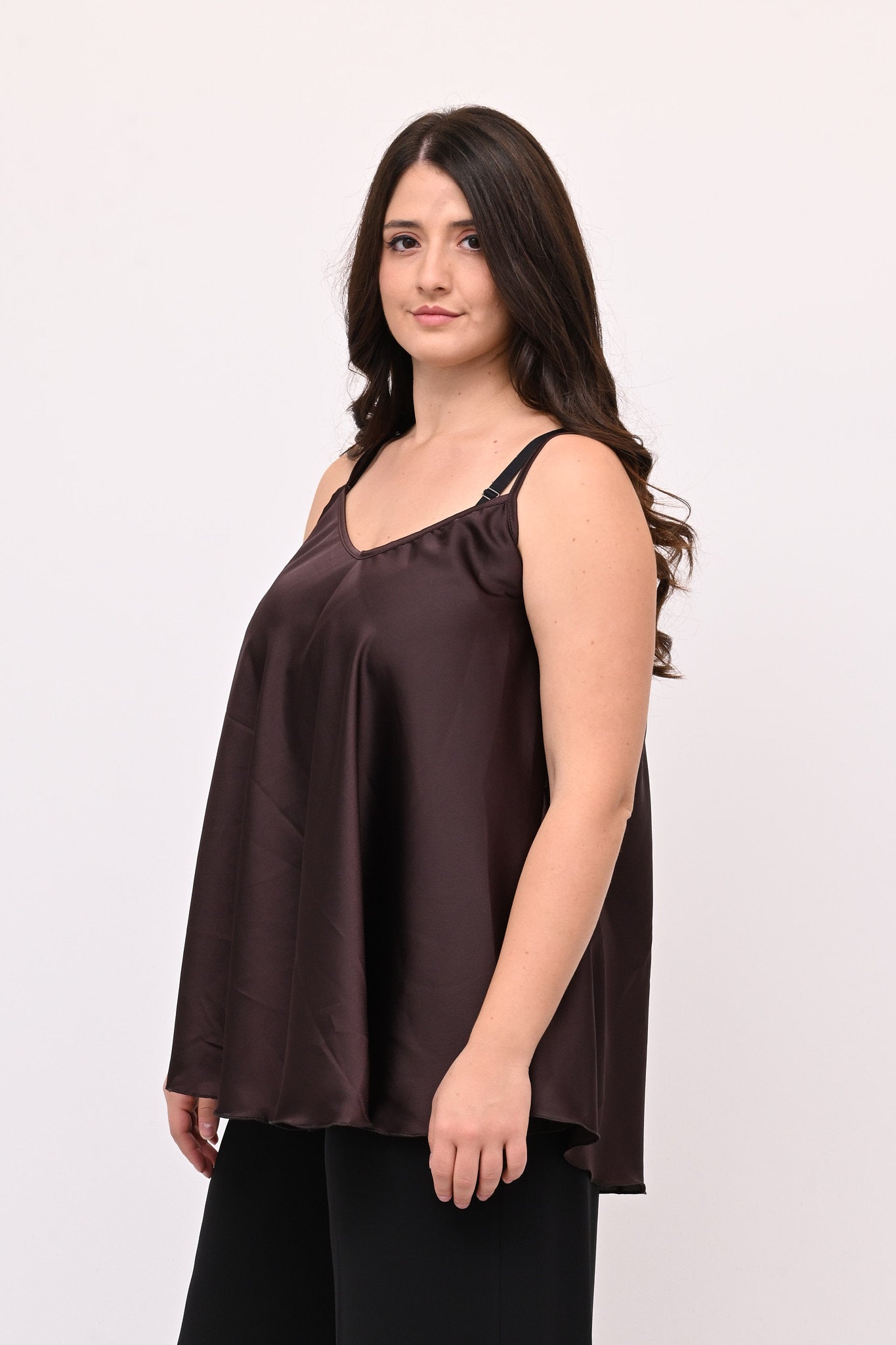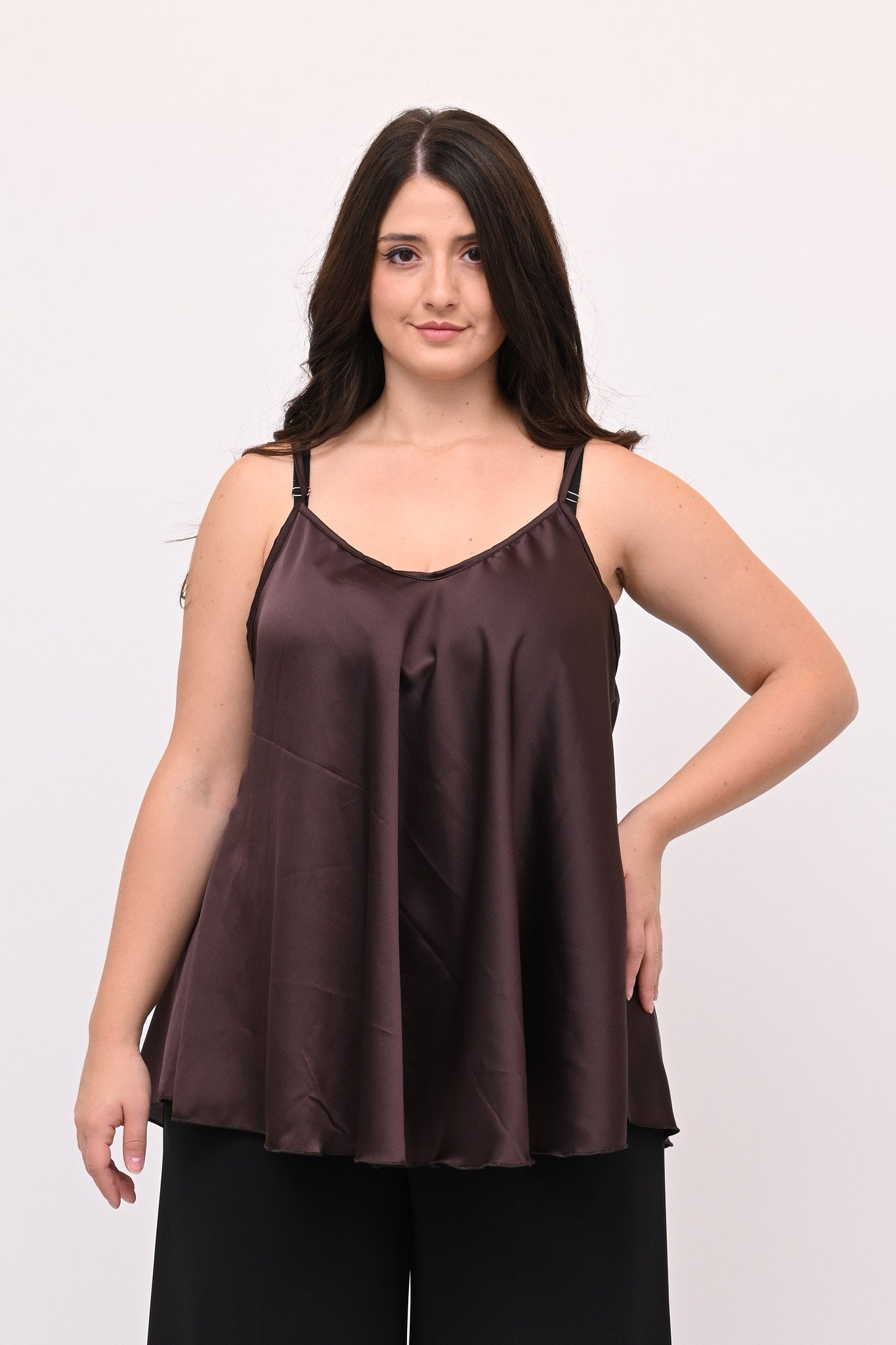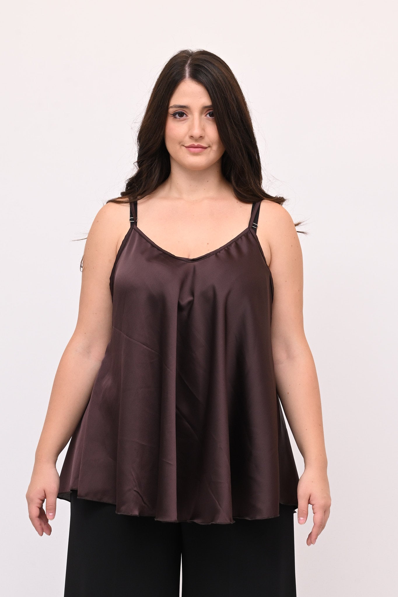 Top in raso, con bretelle sottili, scollatura a V, modello a ruota. Un top femminile, dalla vestibilità fluida, che può essere indossato per look quotidiani di tendenza, ma anche per eventi più eleganti. Un must have cool e senza tempo.