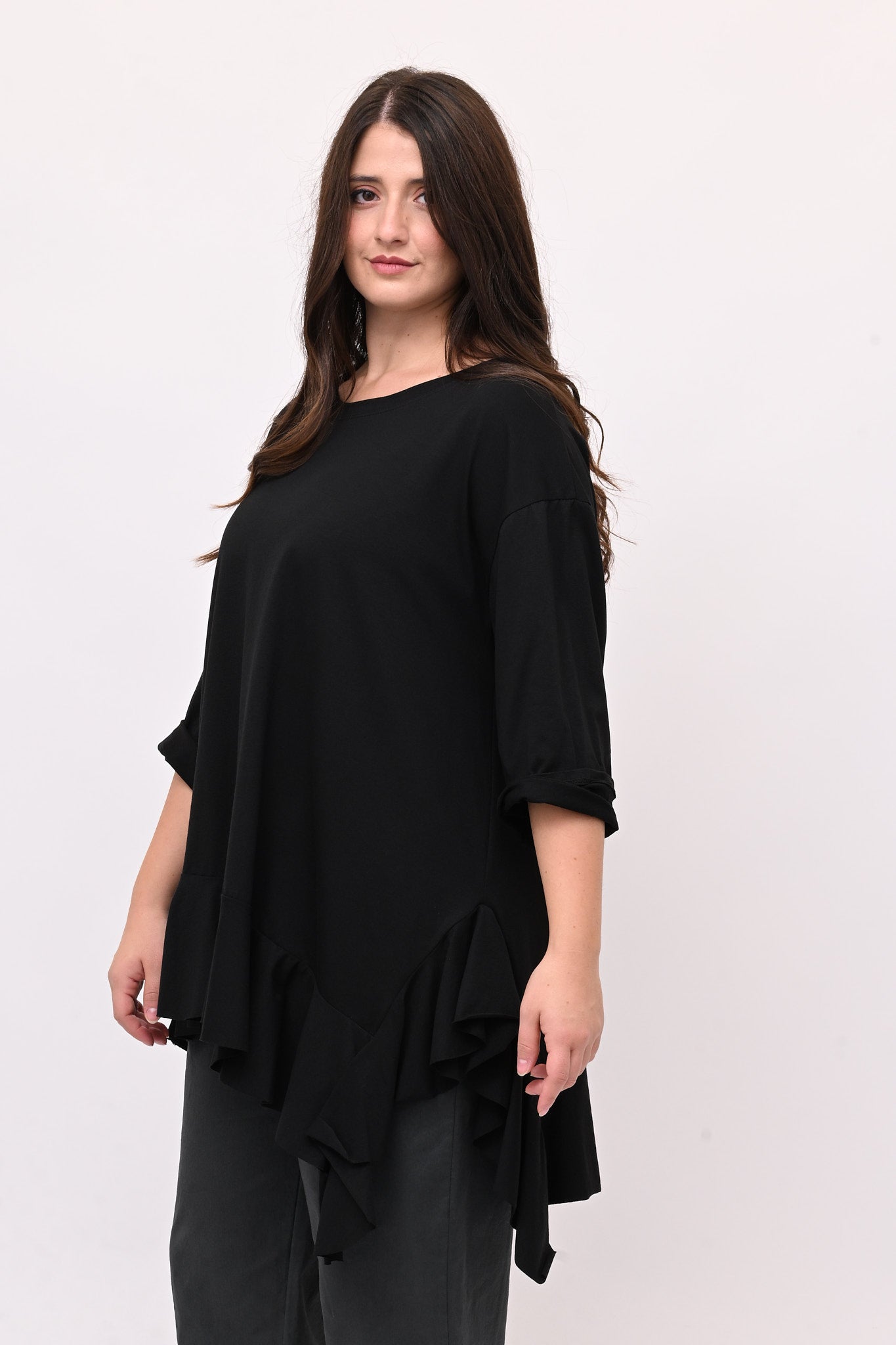 T-shirt in maglina di cotone elasticizzata, girocollo e manica lunga. Una balza sul fondo crea asimmetria e una punta laterale femminile e vezzosa. La vestibilità fluida garantisce praticità, comfort e stile ricercato.