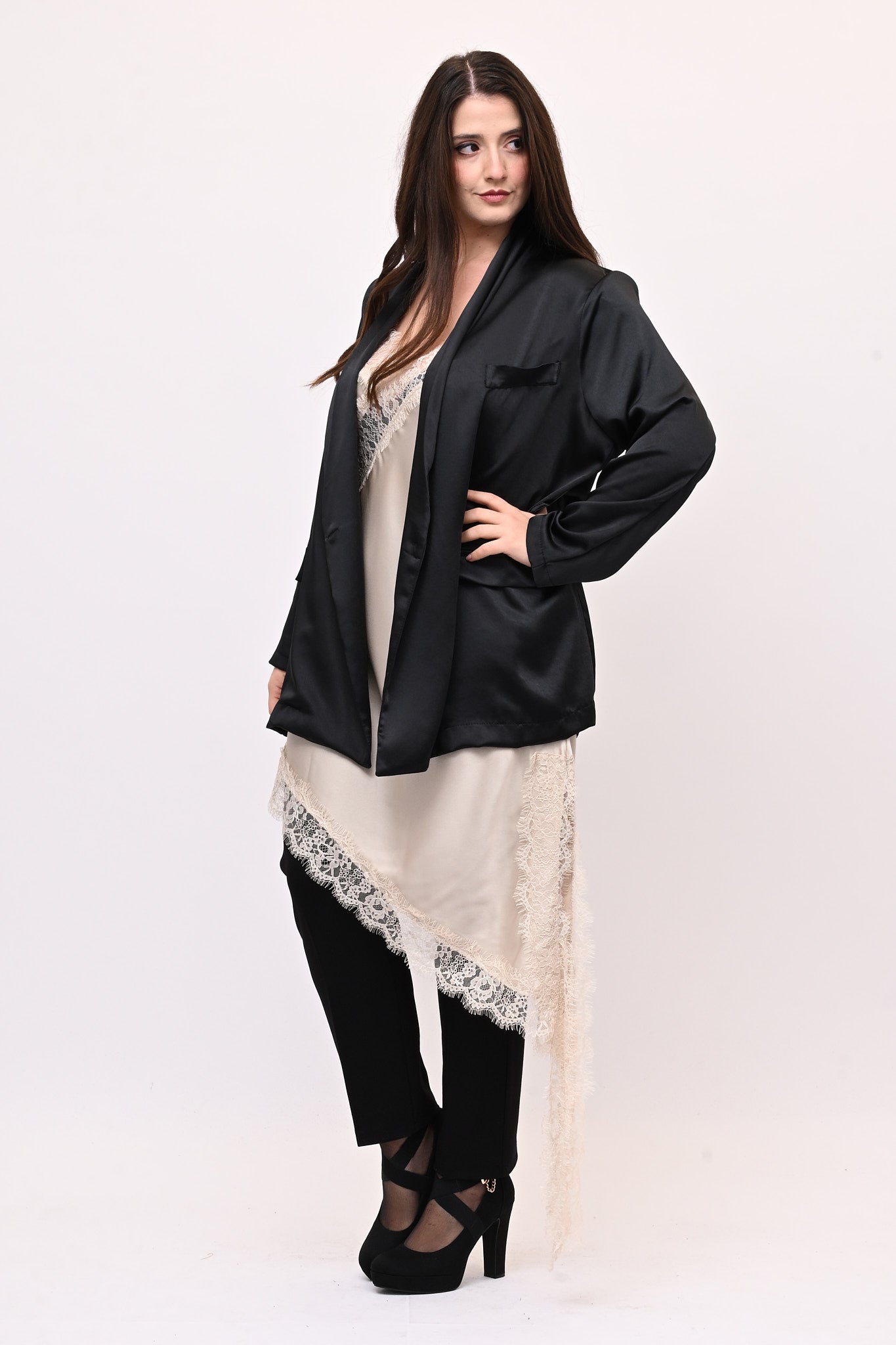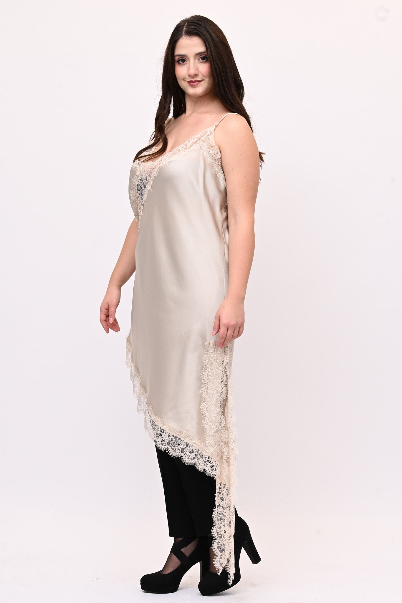 Top lungo in raso, con bretelle sottili e dettagli in pizzo sul decoltè e sull'orlo inferiore. Il design asimmetrico presenta una lunga punta laterale con spacco che da movimento e sensualità. Sexy indossato da solo per look audaci, può diventare una base versatile per outfit raffinati. Un capo che unisce eleganza femminile e carattere deciso.