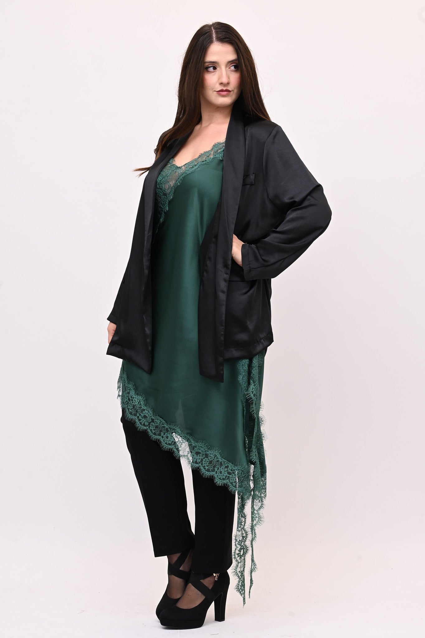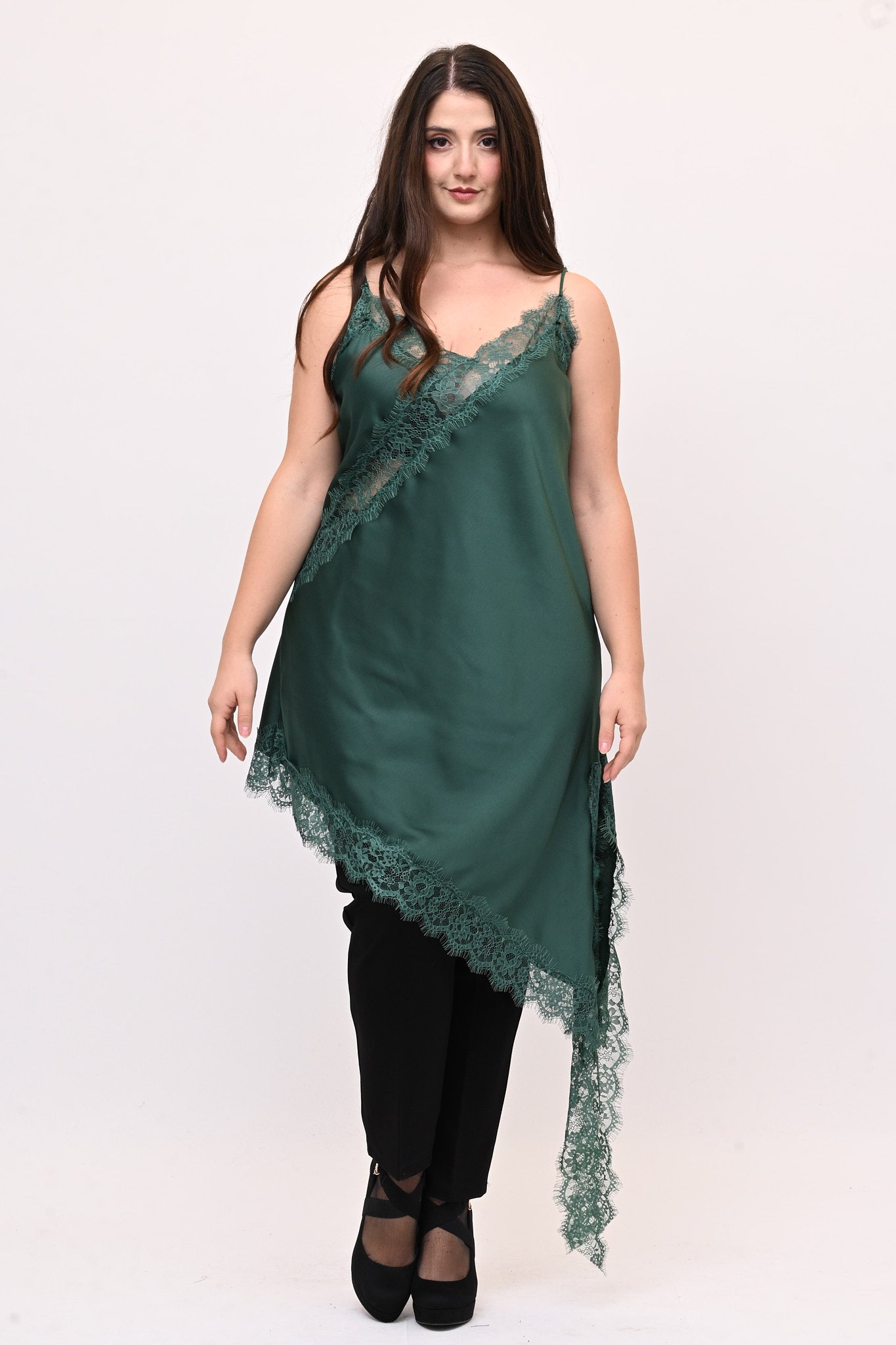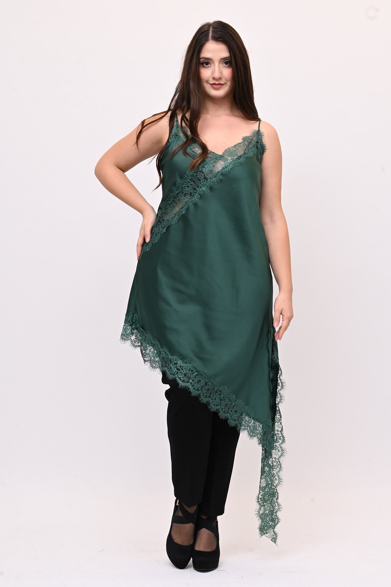 Top lungo in raso, con bretelle sottili e dettagli in pizzo sul decoltè e sull'orlo inferiore. Il design asimmetrico presenta una lunga punta laterale con spacco che da movimento e sensualità. Sexy indossato da solo per look audaci, può diventare una base versatile per outfit raffinati. Un capo che unisce eleganza femminile e carattere deciso.