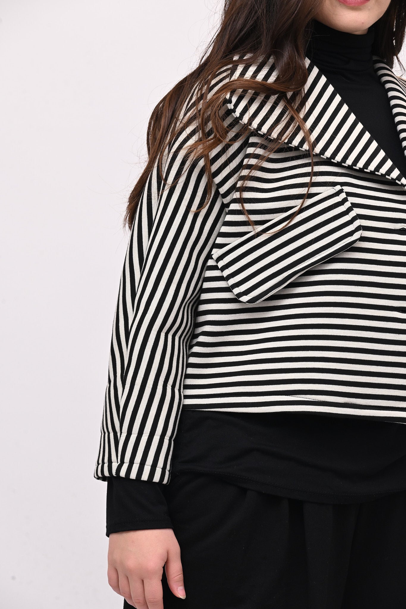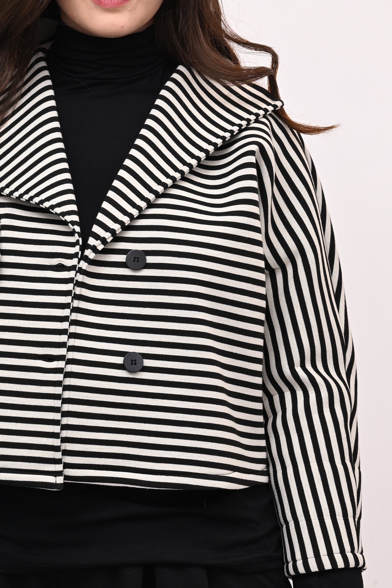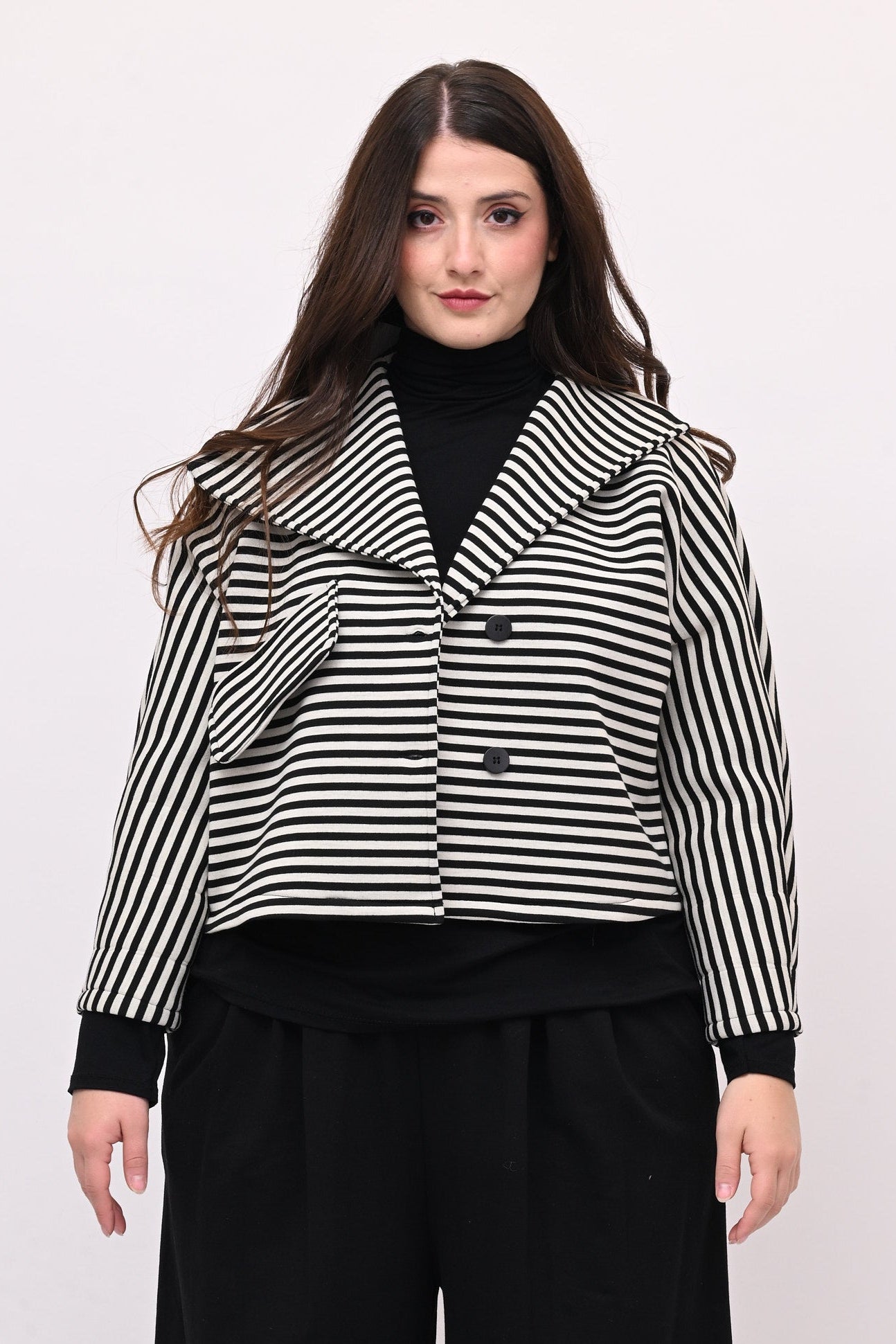 Giacca crop in neoprene, con bottoni e maniche lunghe. La fantasia rigata la rende moderna, divertente e versatile. Perfetta per chi cerca un capo che unisce praticità e stile, si adatta facilmente a molteplici occasioni, dal casual al più ricercato.
