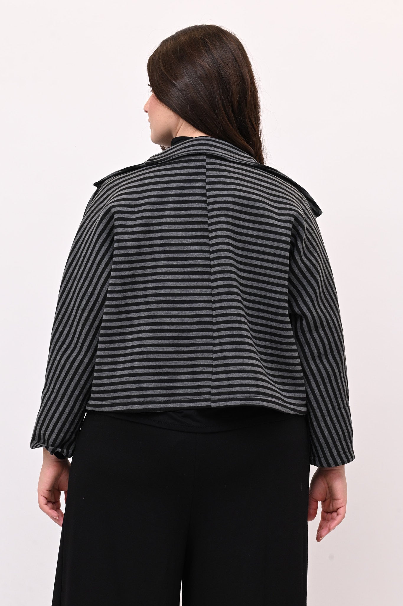 Giacca crop in neoprene, con bottoni e maniche lunghe. La fantasia rigata la rende moderna, divertente e versatile. Perfetta per chi cerca un capo che unisce praticità e stile, si adatta facilmente a molteplici occasioni, dal casual al più ricercato.
