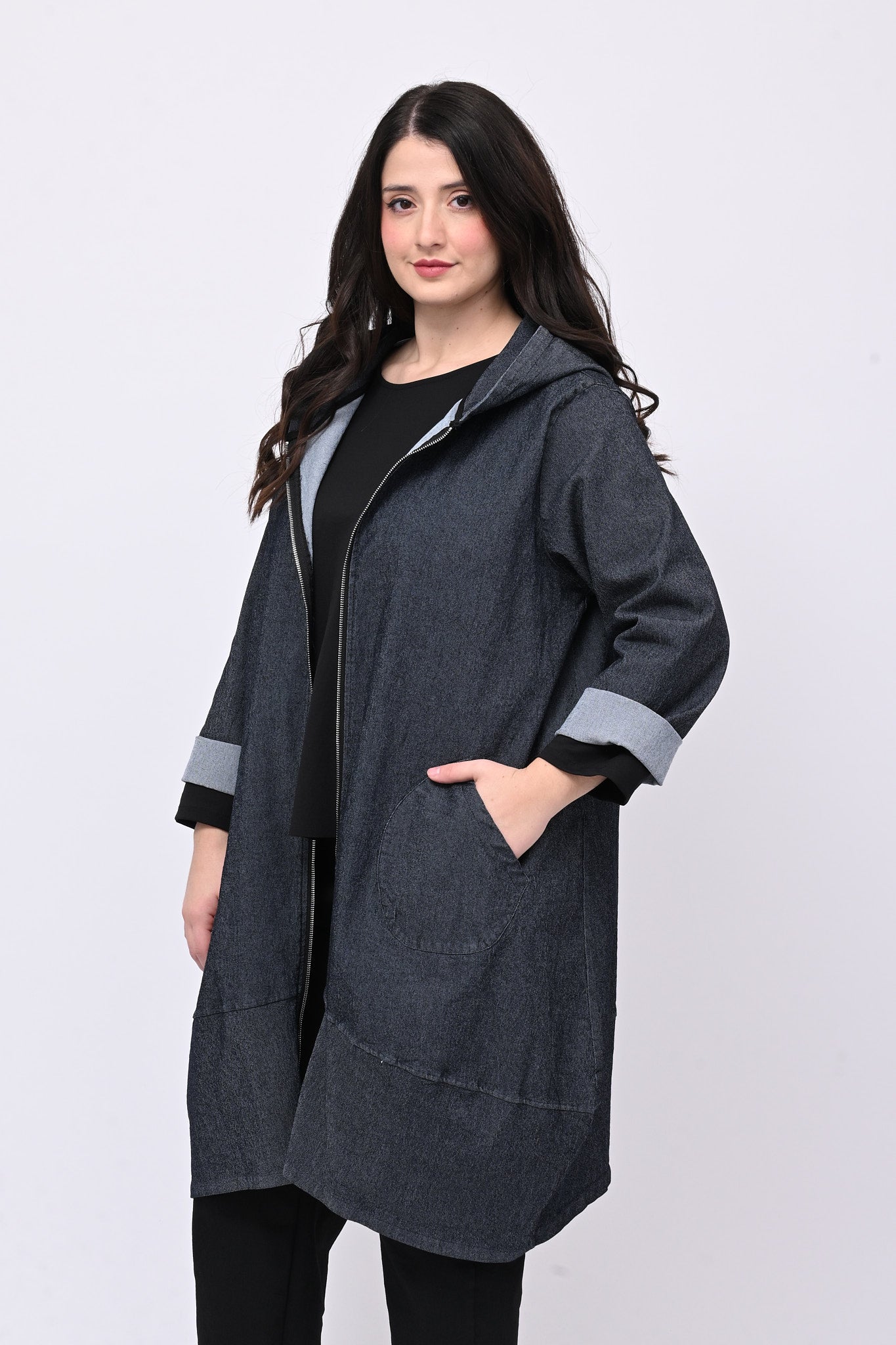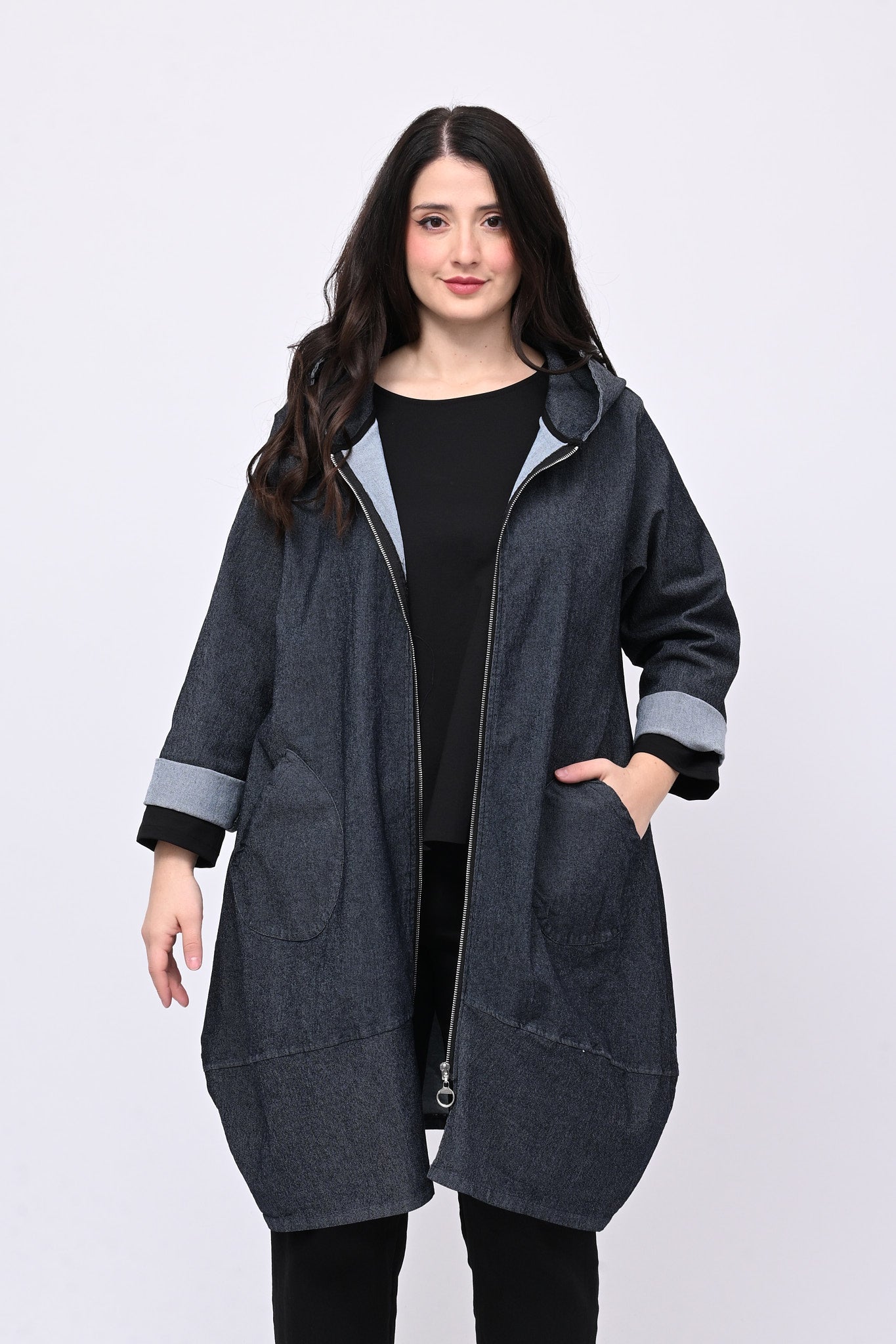 Spolverino in denim, taglio a ovetto, cappuccio integrato, tasche frontali e zip. Pratico e rilassato è versatile e facile da abbinare, ideale per chi ricerca un equilibrio tra comfort e eleganza contemporanea. Perfetto per look sporty chic.