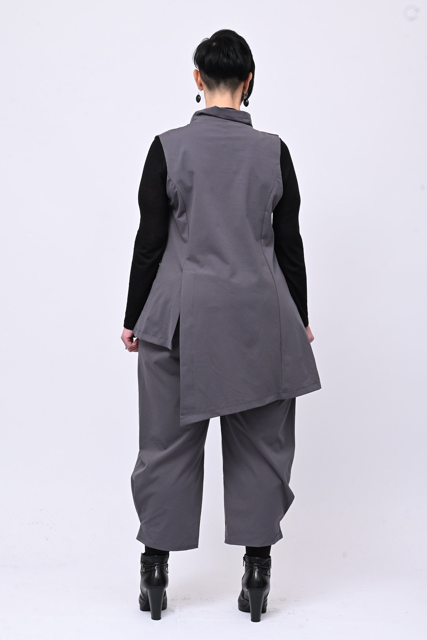 Completo composto da: gilet asimmetrico, con abbottonatura laterale, più lungo su un lato e pantalone modello buggy, con elastico in vita e cuciture sulla caviglia. Una combinazione ideale per chi cerca un outfit easy chic, che coniuga originalità e versatilità in ogni look.