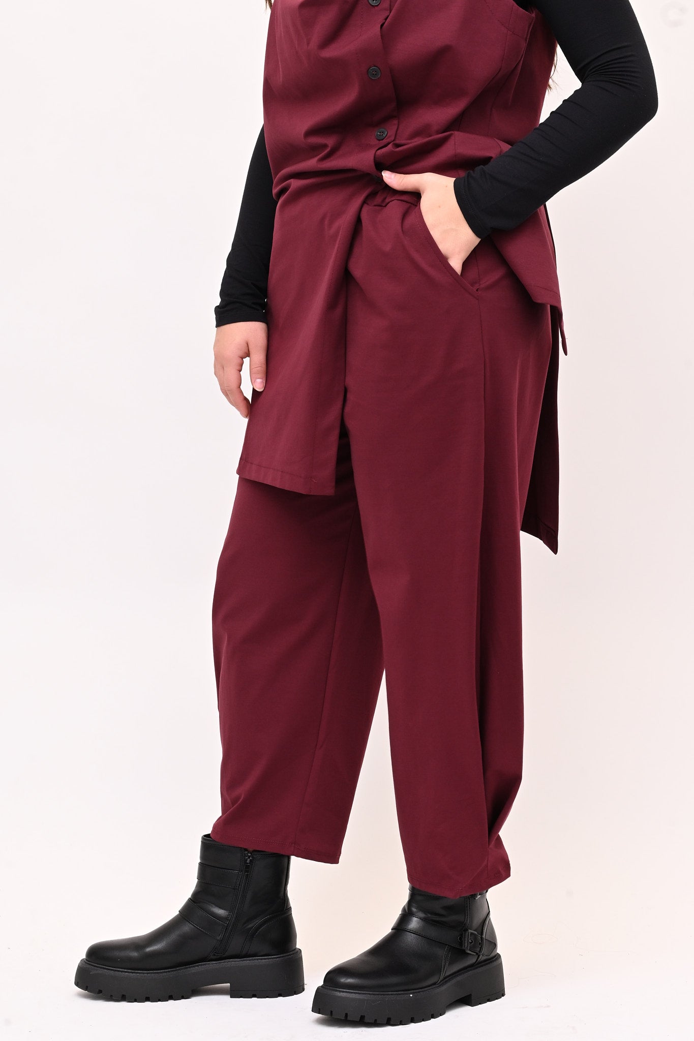 Completo composto da: gilet asimmetrico, con abbottonatura laterale, più lungo su un lato e pantalone modello buggy, con elastico in vita e cuciture sulla caviglia. Una combinazione ideale per chi cerca un outfit easy chic, che coniuga originalità e versatilità in ogni look.